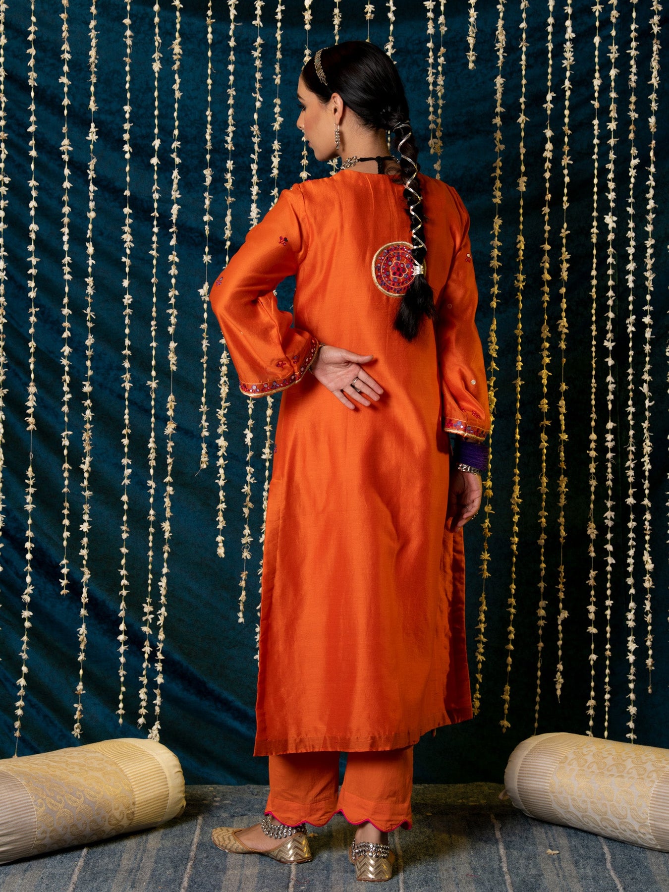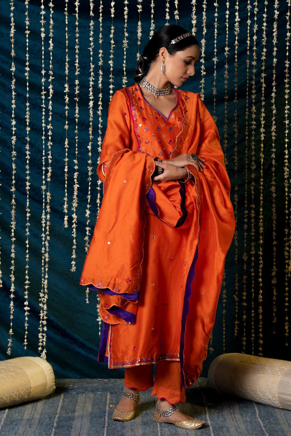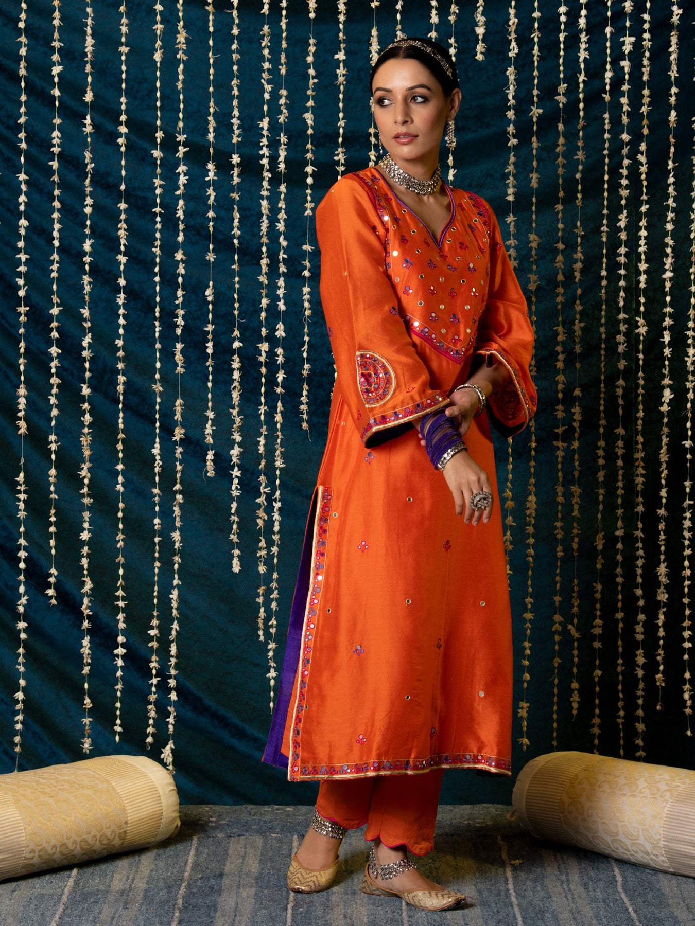 KURTA: This bright orange chanderi silk kurta is enhanced with delicate thread and mirror work embroidery and styled with flared sleeves detailed with motifs.