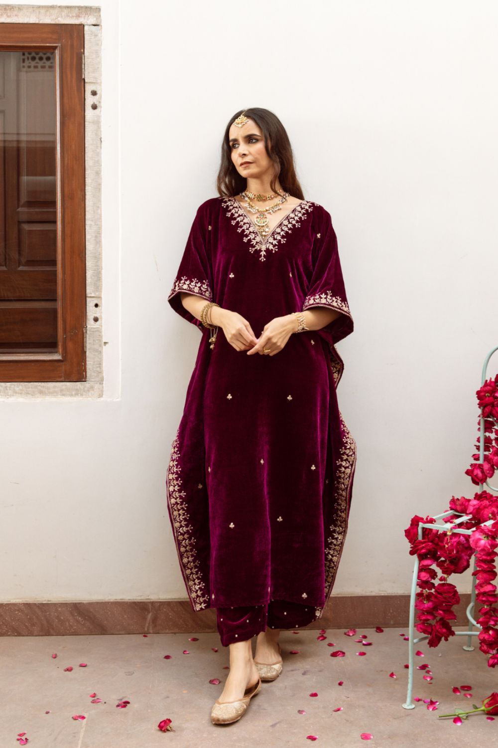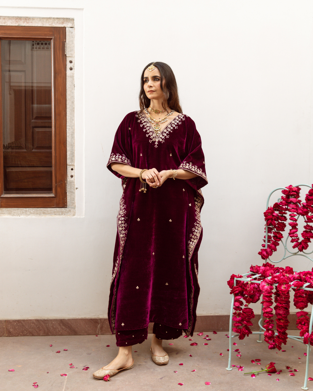 Kaftan -A hand-dyed velvet silk kaftan is embellished with zardozi and marodi and gota patti work