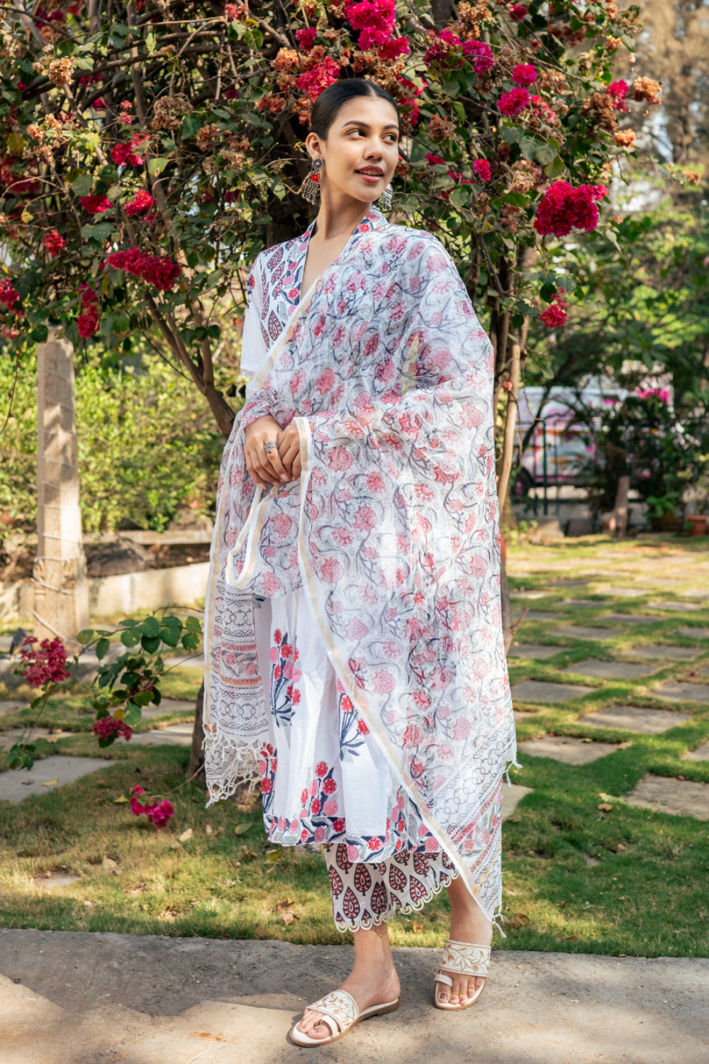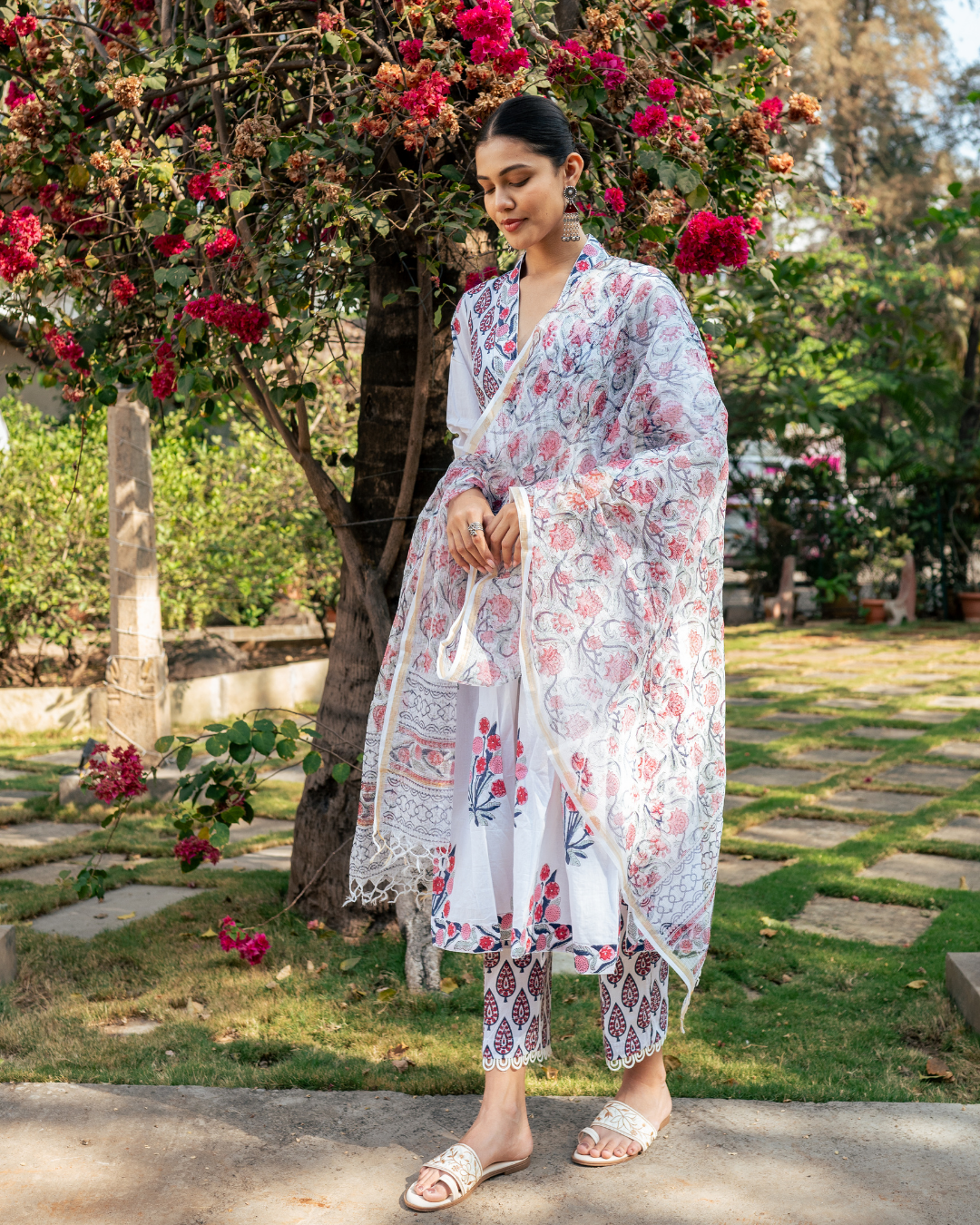 Effortlessly elegant, this ivory and pink hand block printed suit set is a timeless addition to your wardrobe.