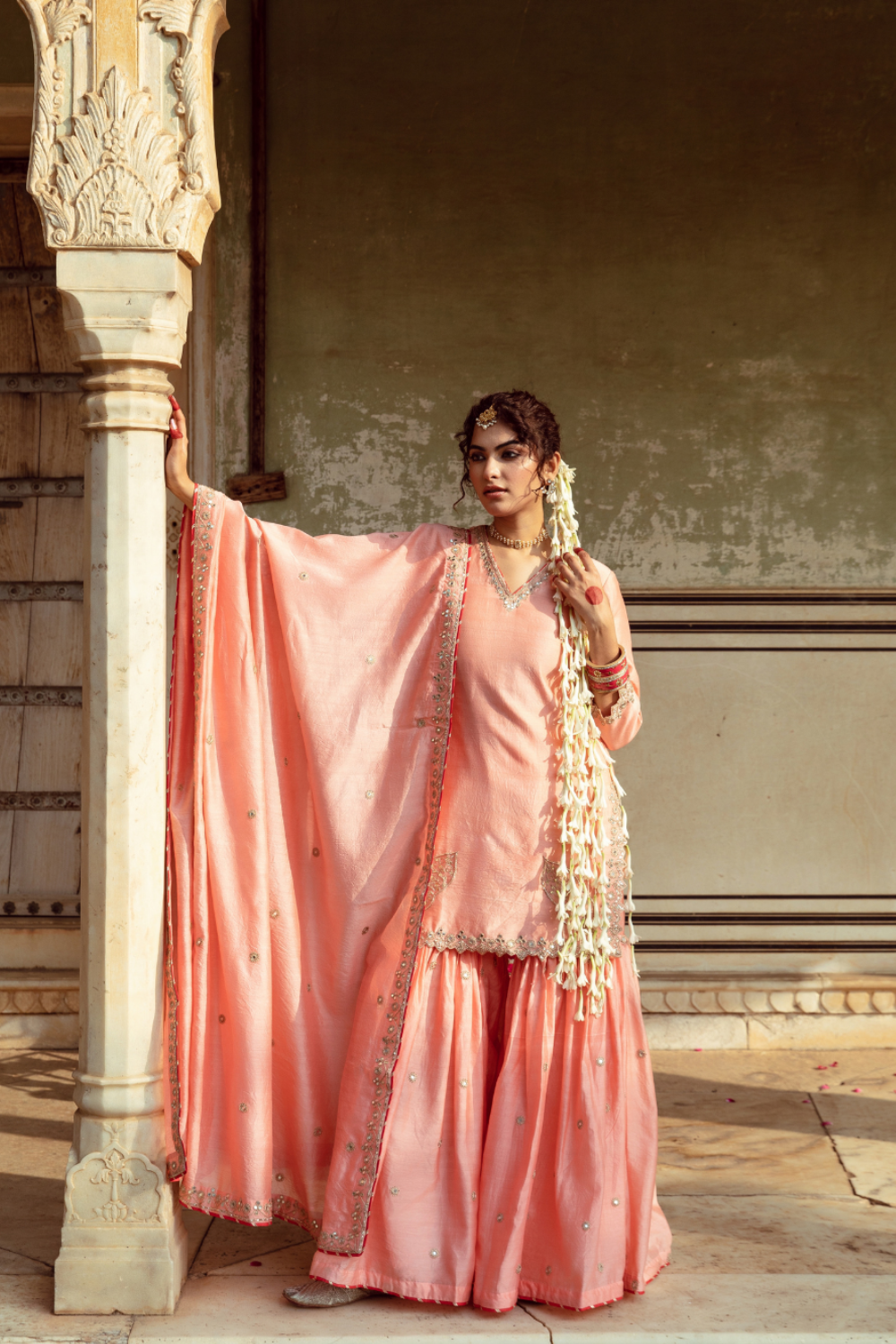 This Peach Chanderi Silk Sharara Set blends intricate craftsmanship with modern elegance.