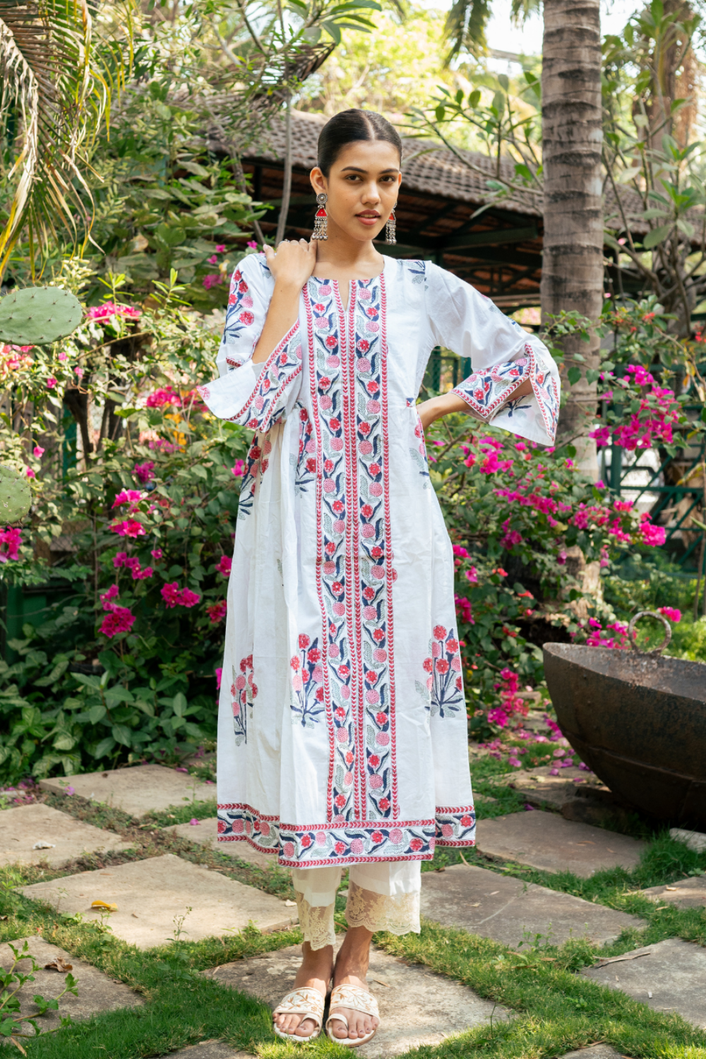 Kurta- A traditional bhopal style kurta with hand block printed florals finished with border detailing.