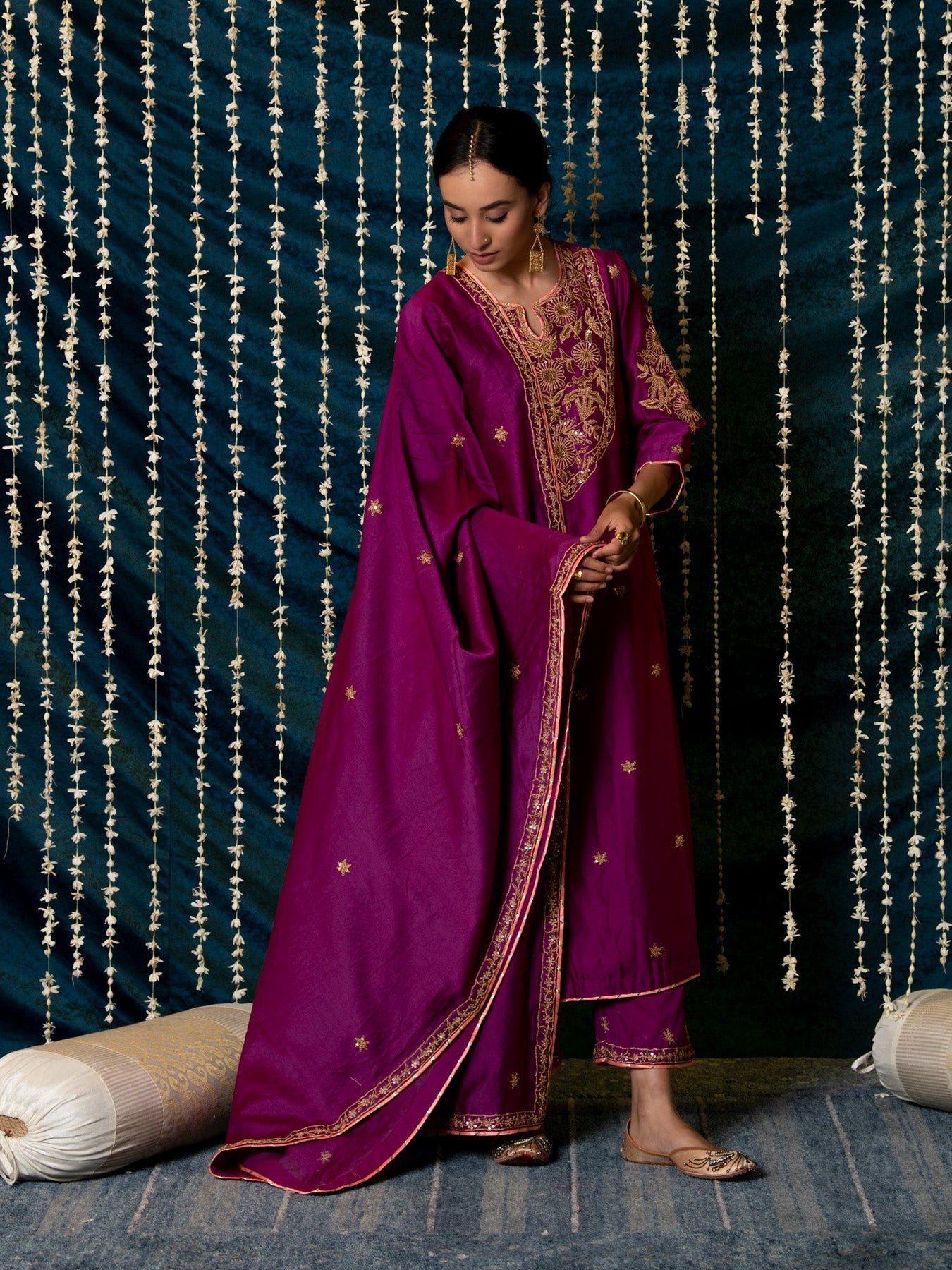 "Jashn-E-Ulfat" - a collection of ensembles that evoke a sense of majestic opulence and modern royalty. Suffused with deep rich hues set on plush cotton silk enhanced with remarkable craftsmanship like Marodi, Mirror and Zardozi embroidery, each ensemble has a romantic and feminine charm of its own collection. This set of 3 consists of a Kurta, Farshi Pajama and Dupatta.