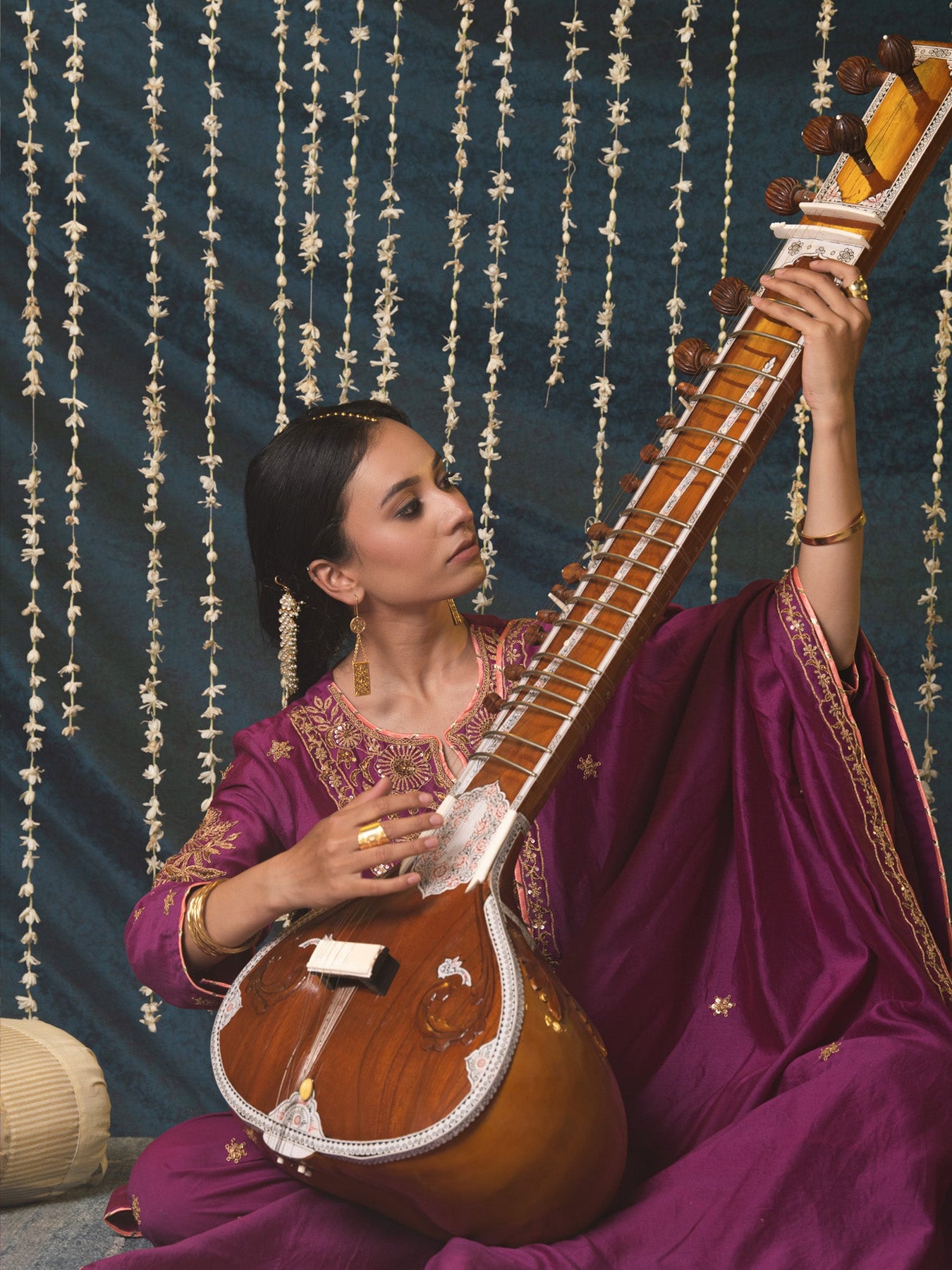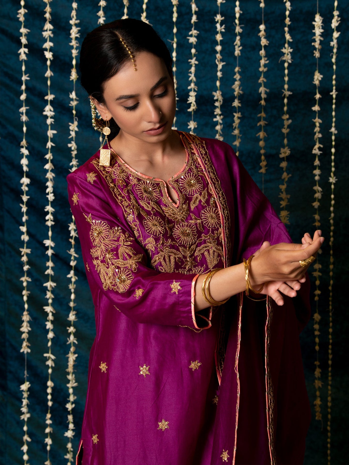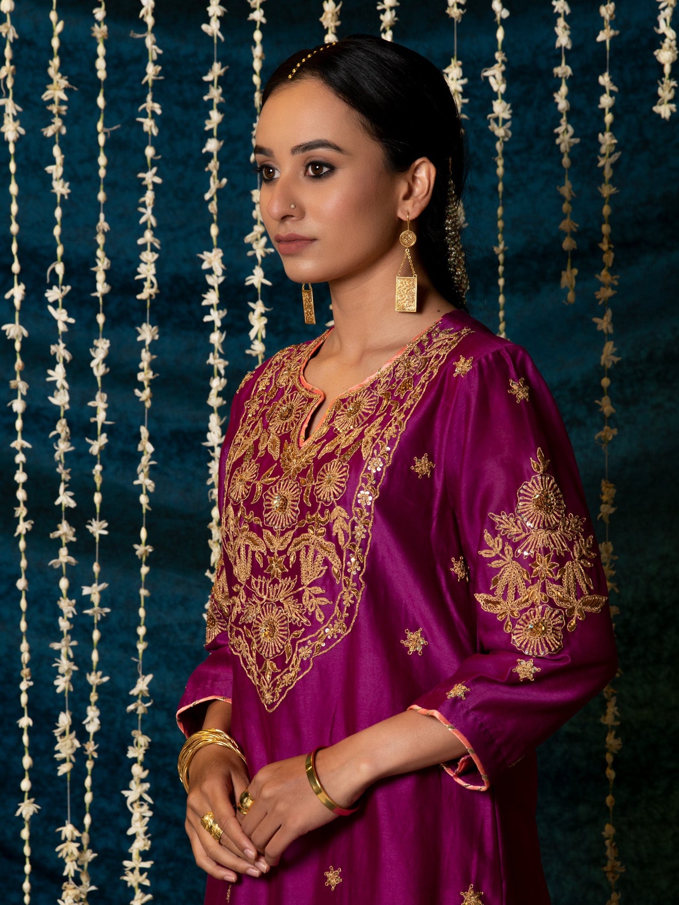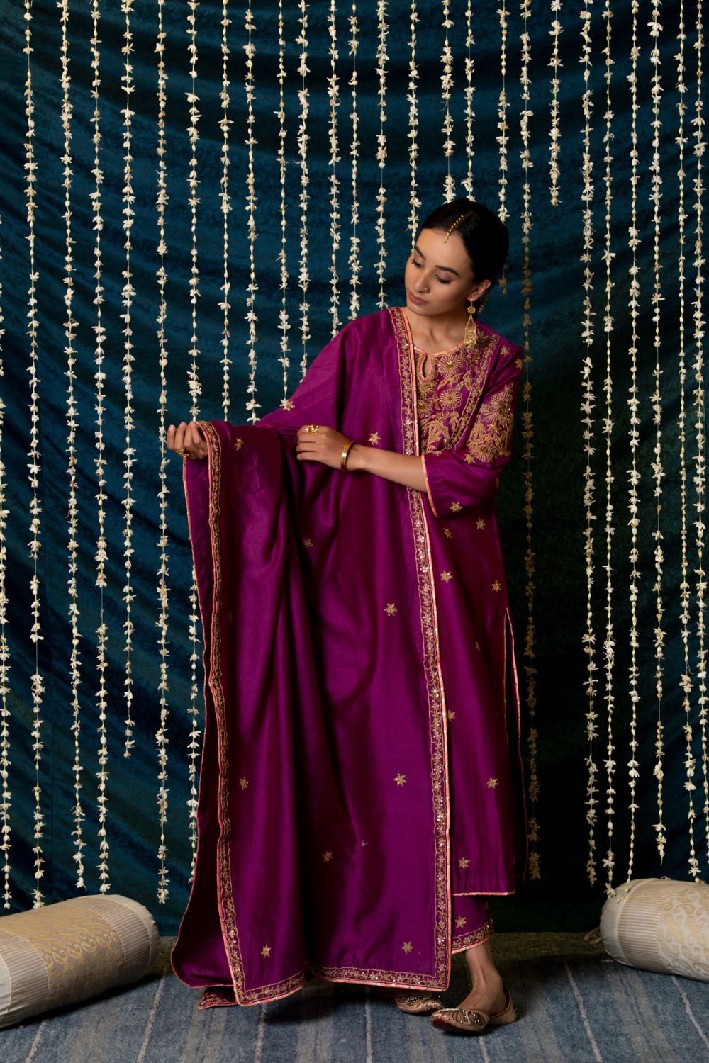 KURTA: This striking purple chanderi silk kurta is enhanced with handcrafted zardozi, sitara and zardozi jaal work on the neck, buttas on the sleeves and delicately handcrafted buttis all over. The kurta has been finished with hand made magzi in a contrast peach color.