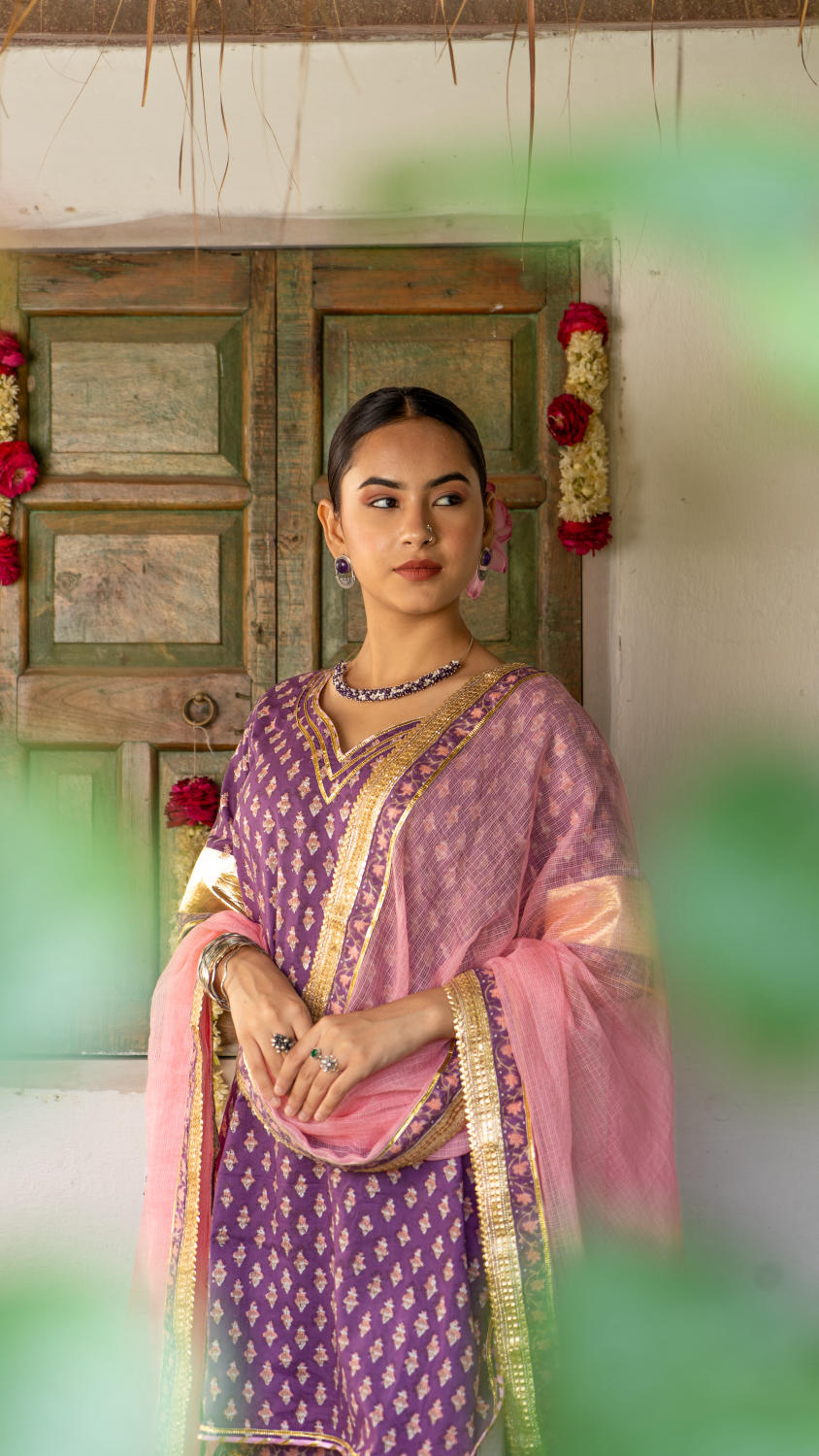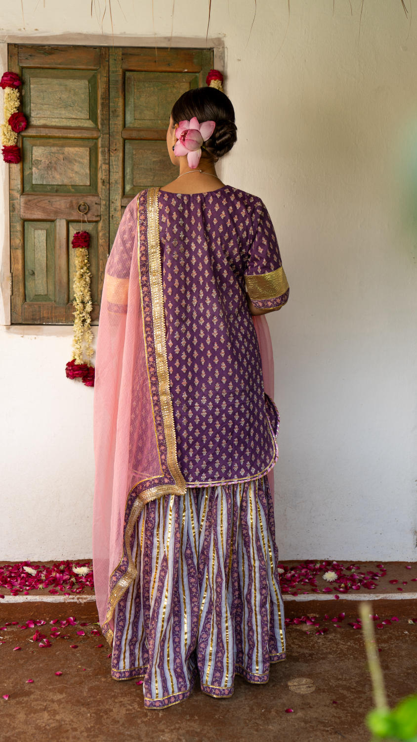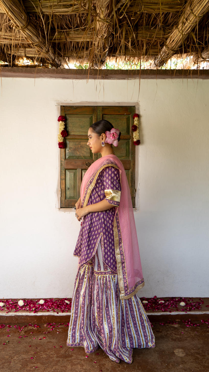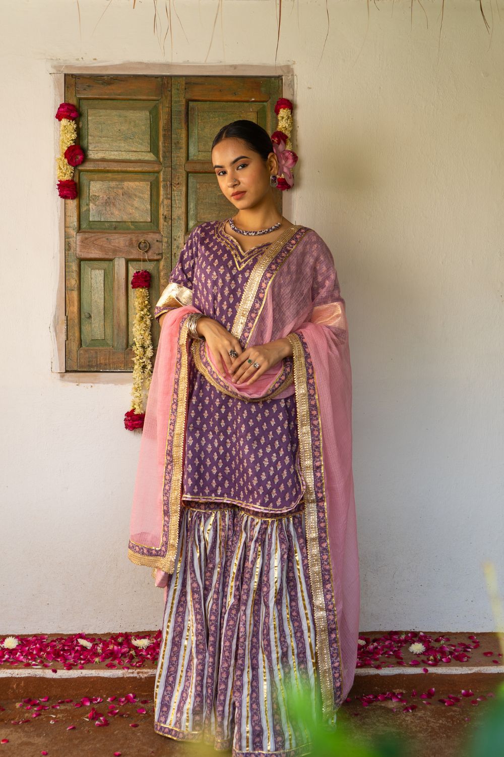 Saundh purple and peach hand block printed gota sharara set- Set of 3 consists of kurta, sharara and dupatta. Peach floral booti jaal print kurta on a deep purple base with floral stripe printed sharara with gota stripes work on the sharara. Kota doria dupatta with gota detailing on the border.