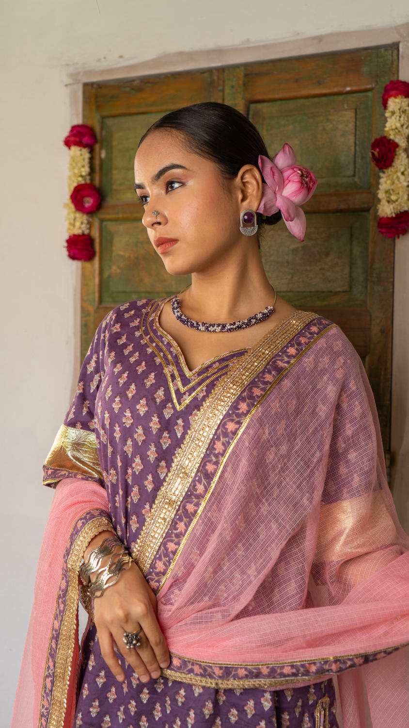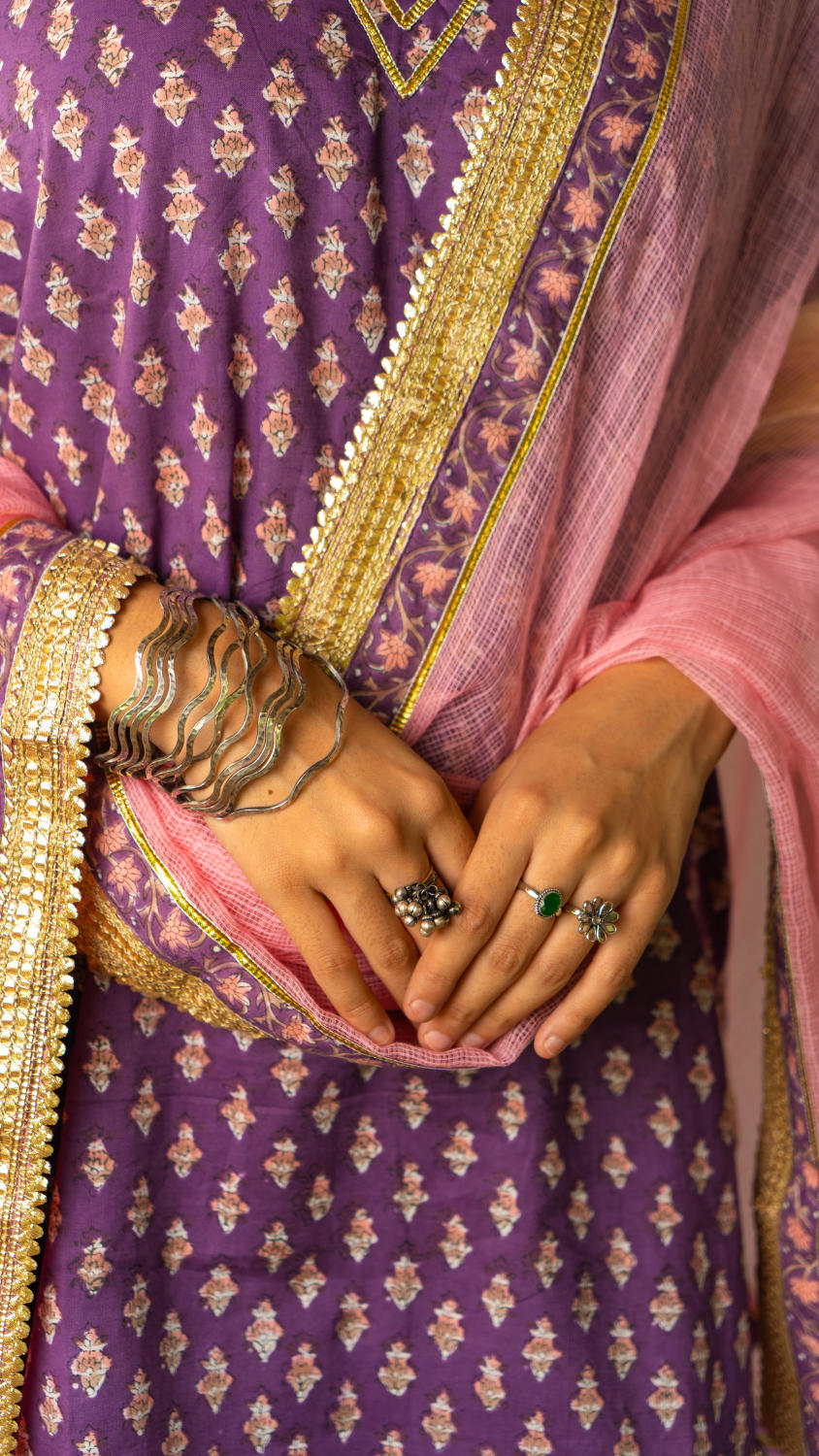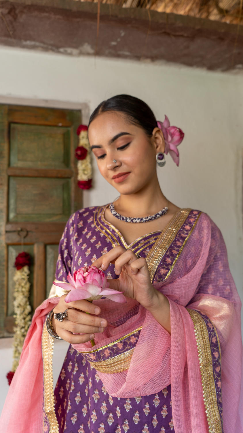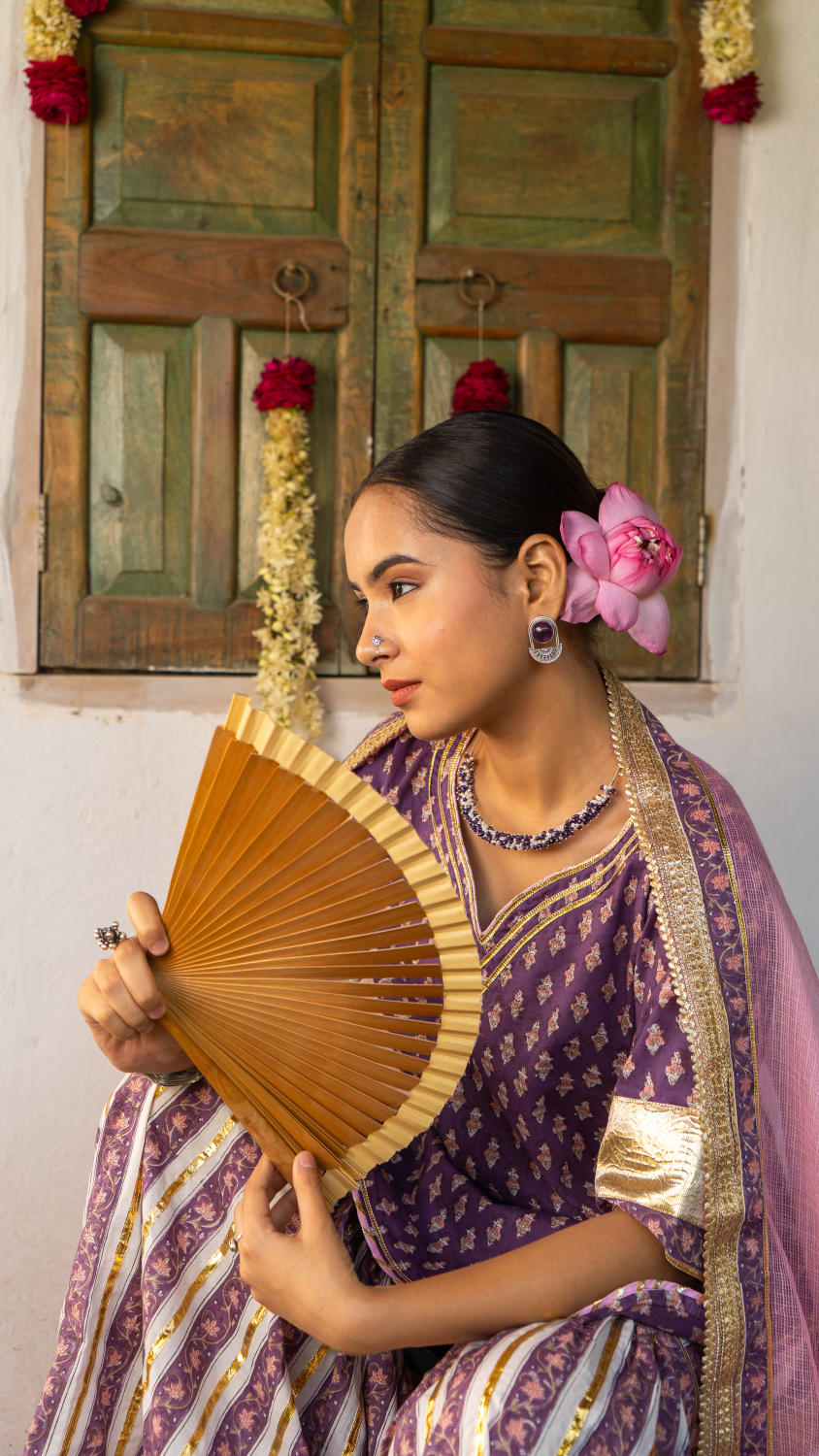 Saundh purple and peach hand block printed gota sharara set- Set of 3 consists of kurta, sharara and dupatta. Peach floral booti jaal print kurta on a deep purple base with floral stripe printed sharara with gota stripes work on the sharara. Kota doria dupatta with gota detailing on the border.