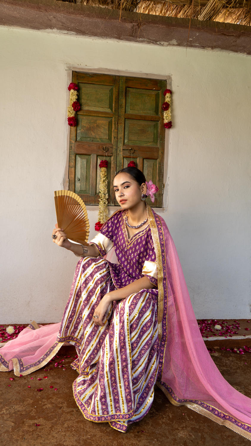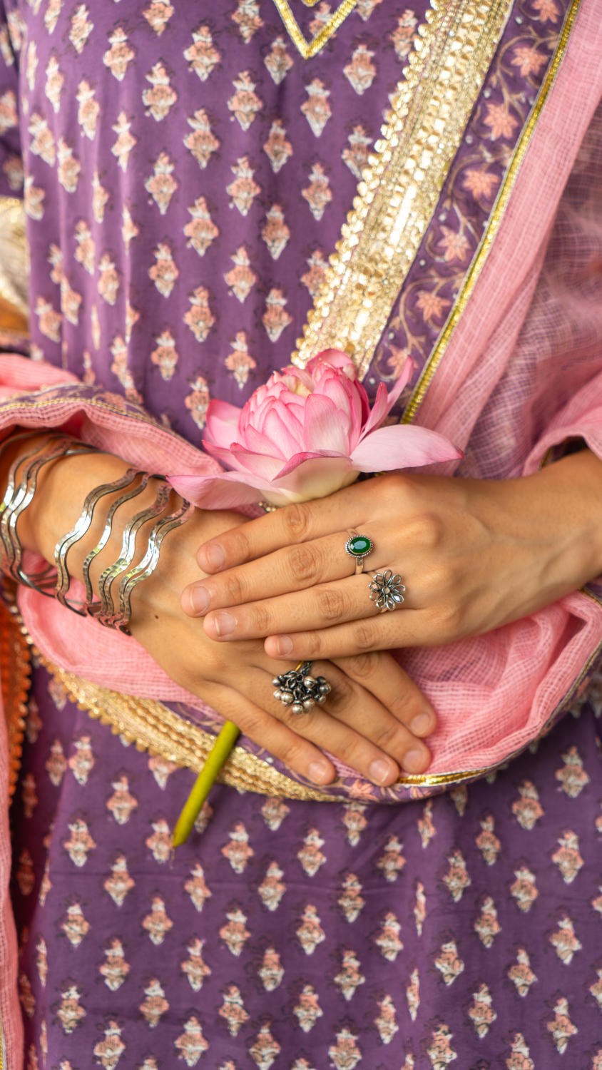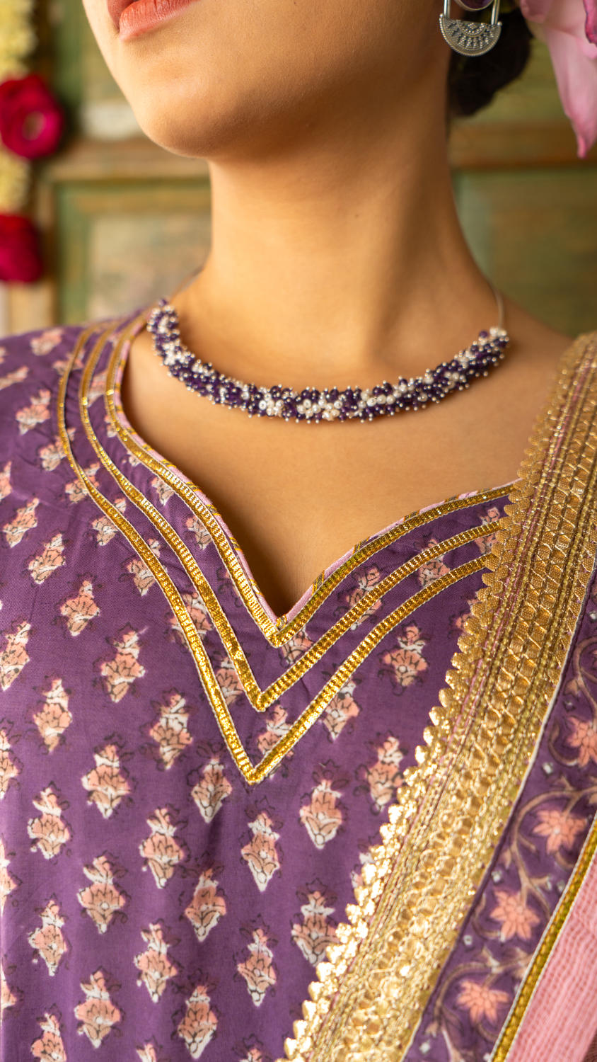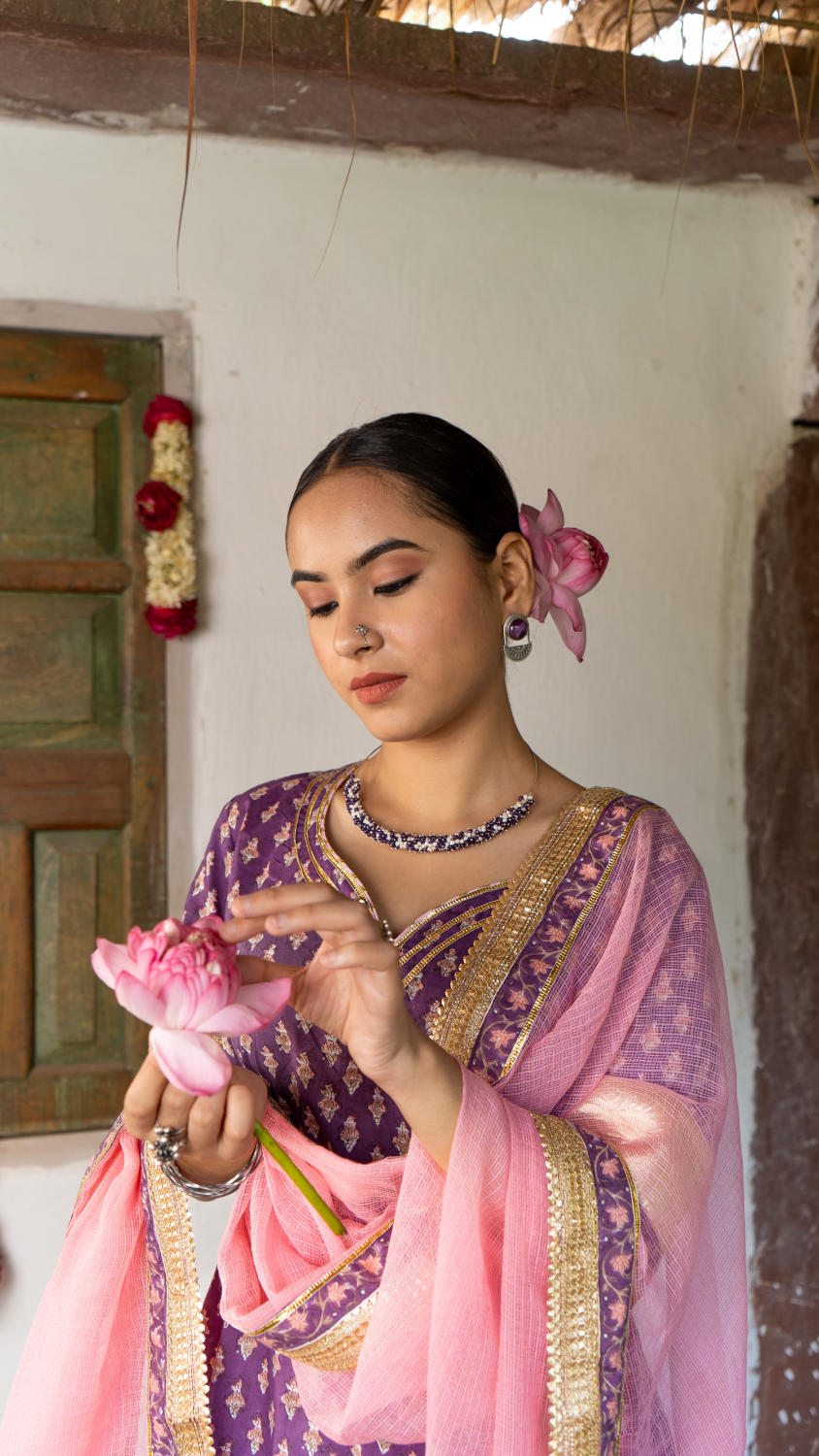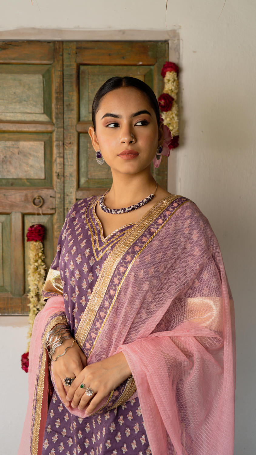 Saundh purple and peach hand block printed gota sharara set- Set of 3 consists of kurta, sharara and dupatta. Peach floral booti jaal print kurta on a deep purple base with floral stripe printed sharara with gota stripes work on the sharara. Kota doria dupatta with gota detailing on the border.