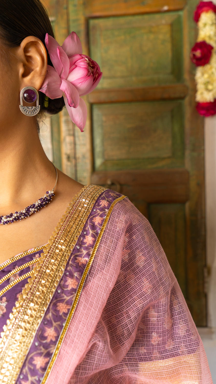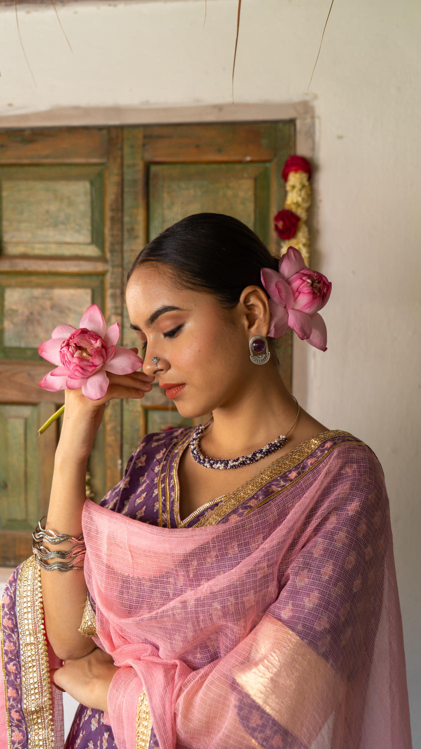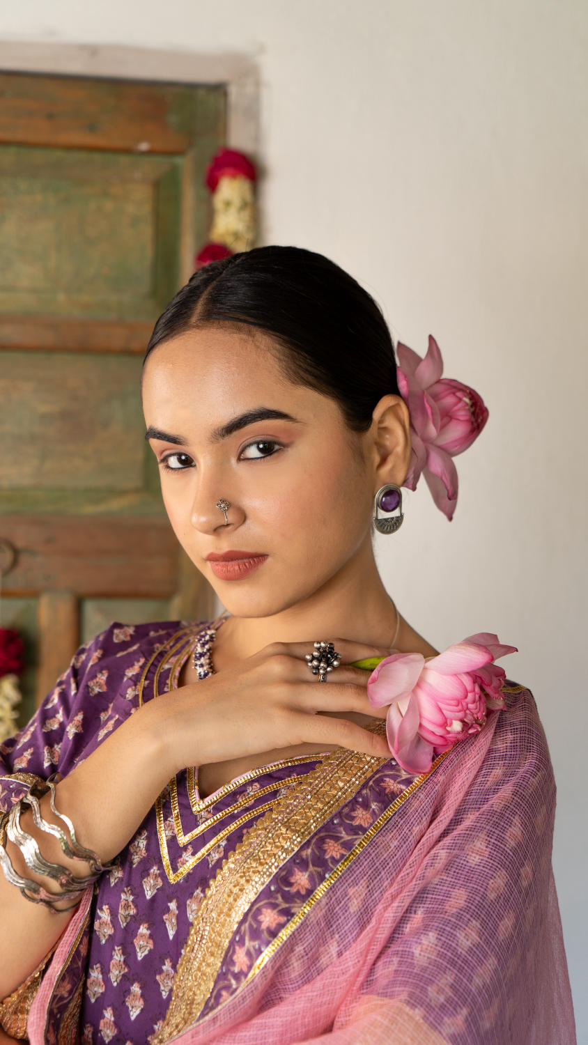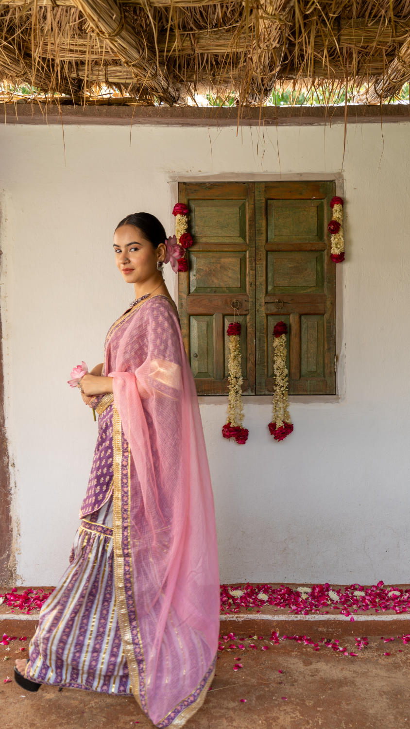 Saundh purple and peach hand block printed gota sharara set- Set of 3 consists of kurta, sharara and dupatta. Peach floral booti jaal print kurta on a deep purple base with floral stripe printed sharara with gota stripes work on the sharara. Kota doria dupatta with gota detailing on the border.