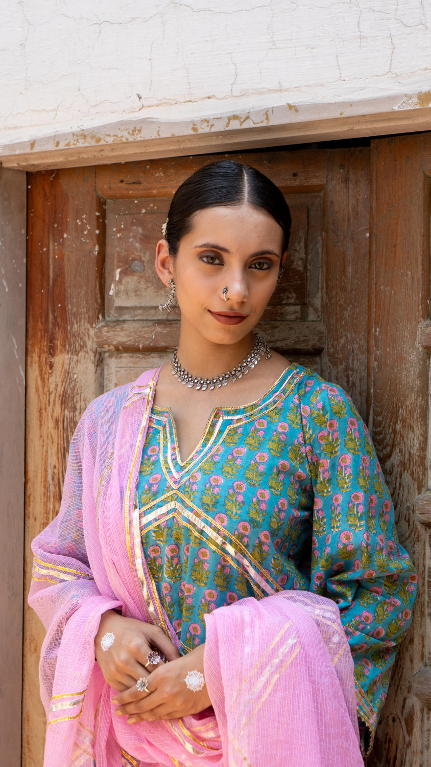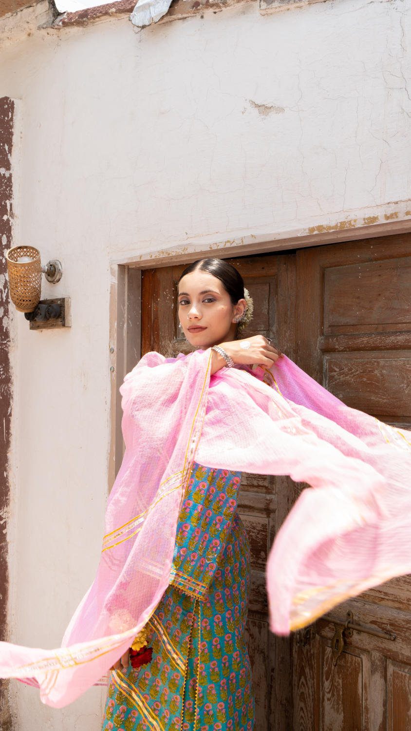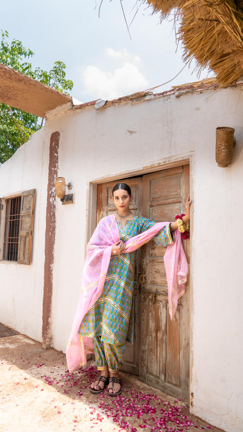 Saundh Purple and Peach hand block printed cotton Salwar set- Cotton salwar set with gota dhari work and ghera sleeves with salwar in matching print. Kota doria dupatta with gota work.