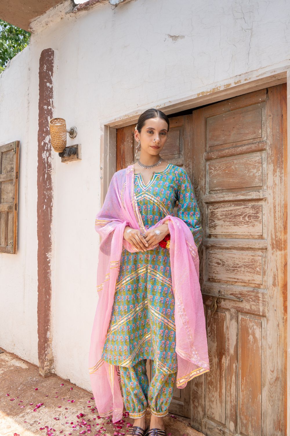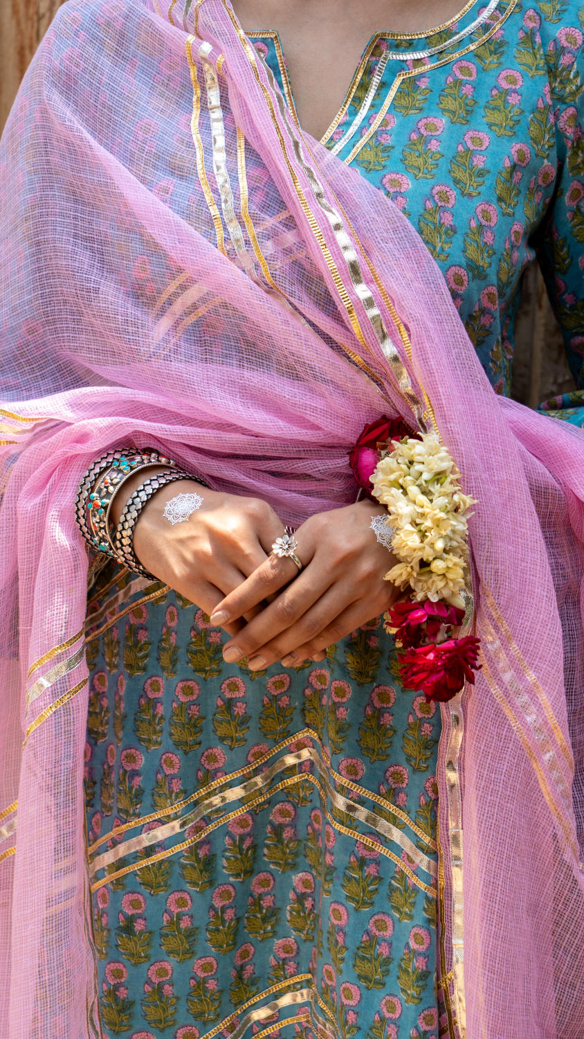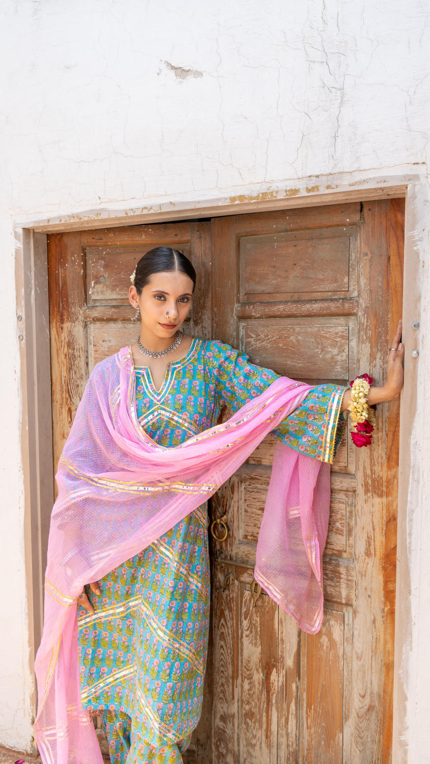 Saundh Purple and Peach hand block printed cotton Salwar set- Cotton salwar set with gota dhari work and ghera sleeves with salwar in matching print. Kota doria dupatta with gota work.
