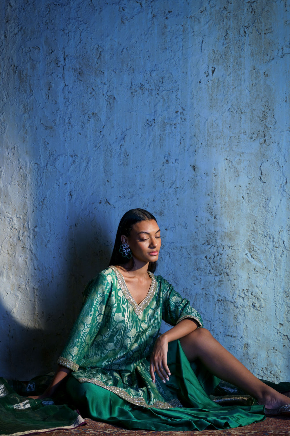 ‘Asmira’ munga silk tunic in ‘panna’ or emerald green handwoven in lotus stem motifs in a dense jaal pattern. Silver and gold chevron design embroidery in cutdana or bead work adorn the tunic. ‘Lehar’ modal satin dhoti skirt draped in cascading pleats is paired with the ‘Asmira’ tunic.