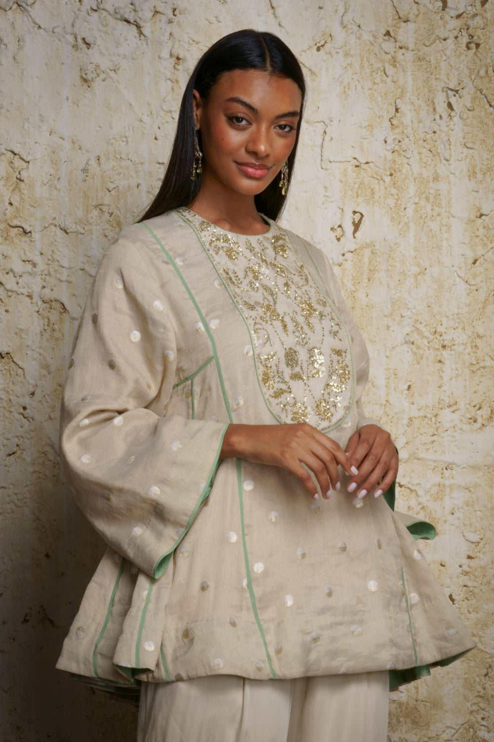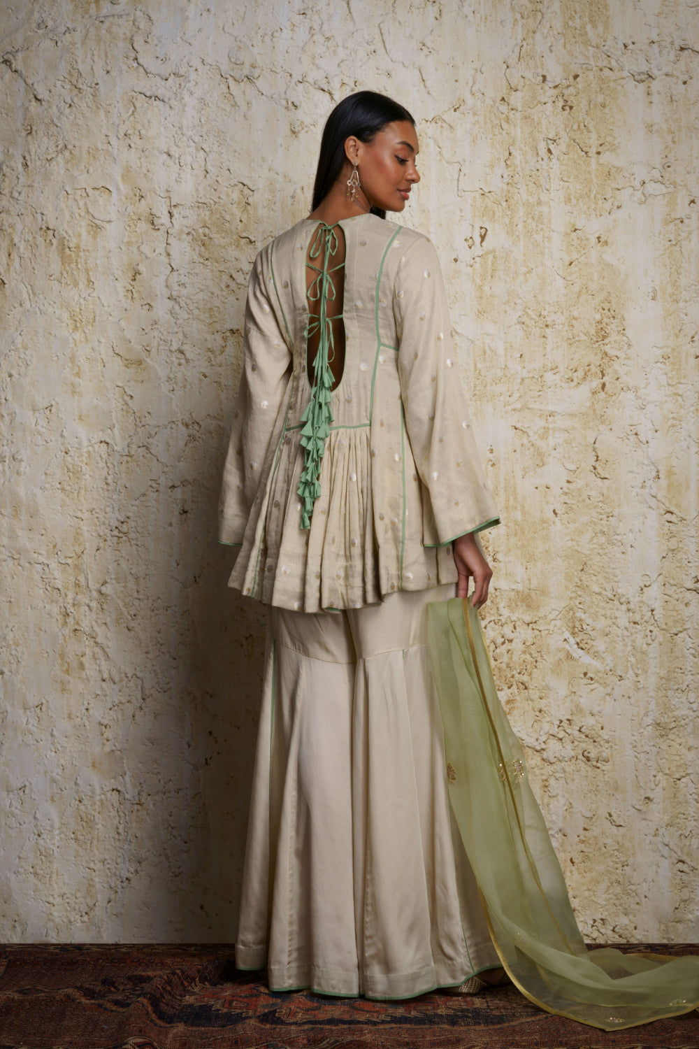 ‘Rihanna’ a natural tone munga tissue tunic in a flowing umbrella style enhanced with an embroidered yolk. Miniature handwoven zari ‘Ashrafi’ motifs span the tunic paired with a panel style gharara in modal satin. A mint green kora stole embellished with zardosi motifs complements the outfit.