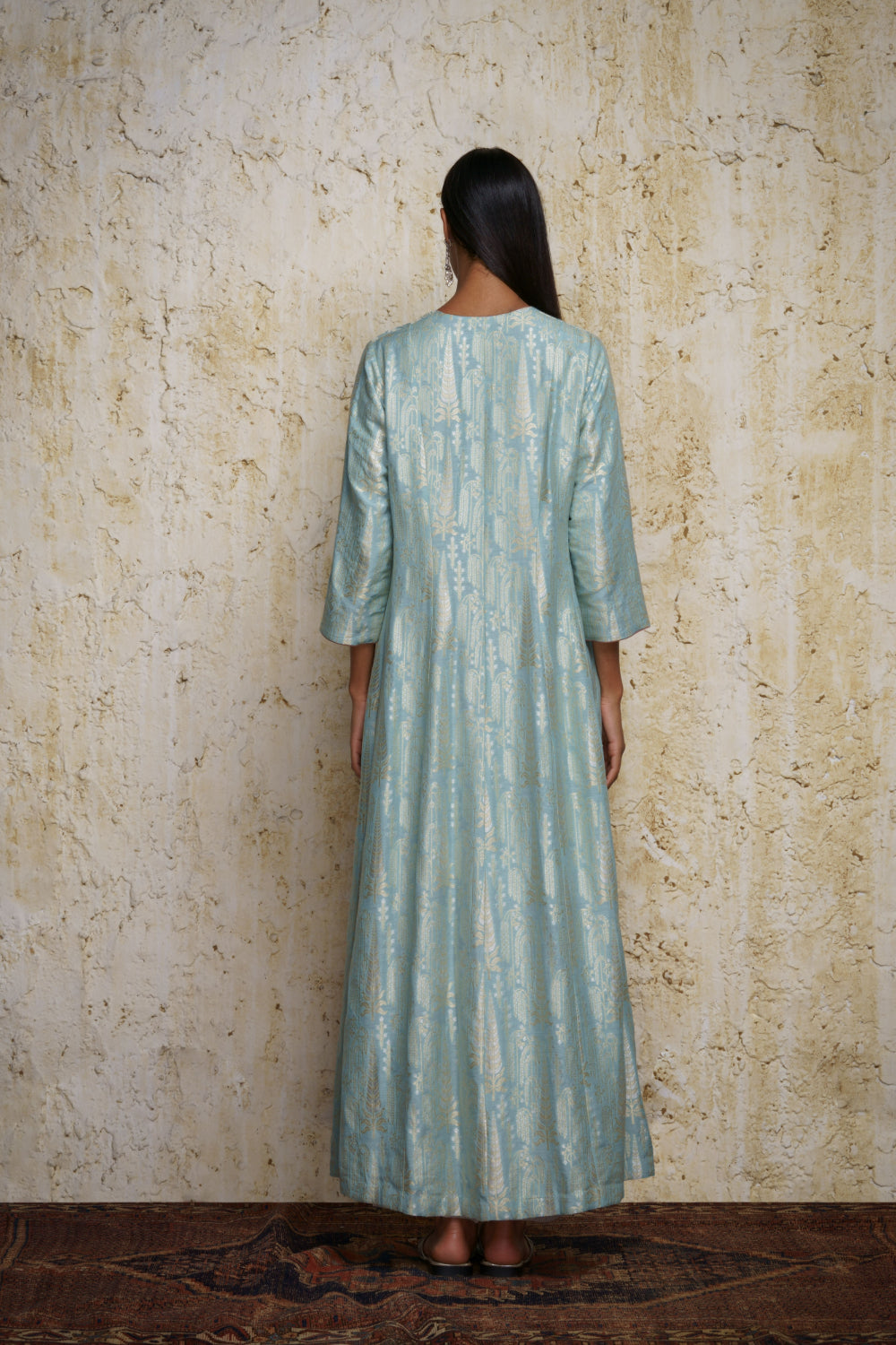 ‘Sahar’ a kalidar or panelled style anarkali in ‘asmani' or azure blue shade handwoven in silver zari cypress tree and willow tree motifs. It is pared with a diaphanous aquamarine blue kora organza dupatta embroidered in diagonal silver dabka and zardosi leaf bel motifs. Silver self striped silk tissue palazzos complete the ensemble.