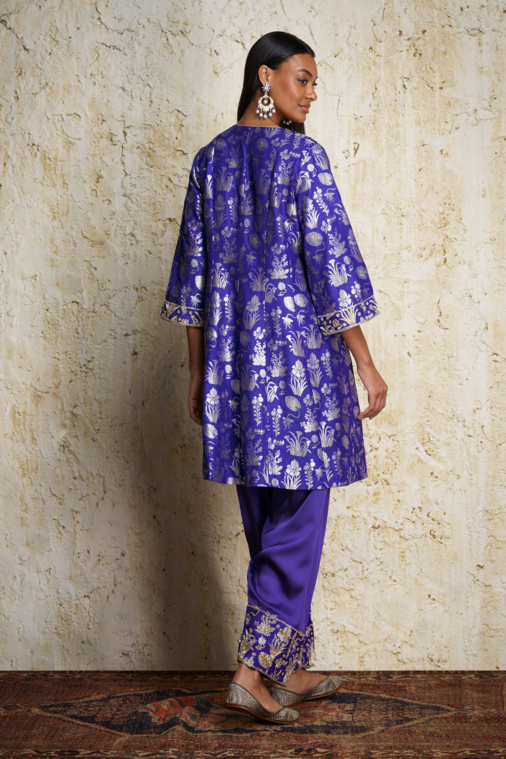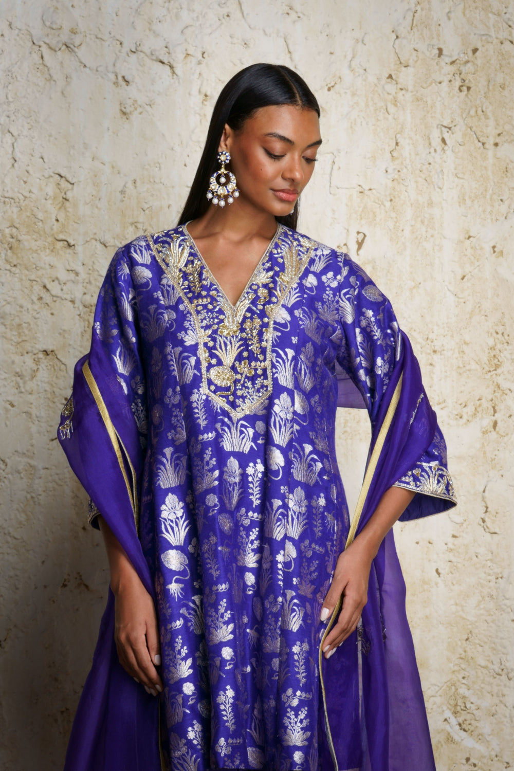 ‘Shira’ munga silk short anarkali style purple or ‘baingani’ kurta handwoven zari in multi floral motifs inspired by vintage museum designs. It is paired with a purple modal satin salwar with an intricately embroidered ’paunchi’. A purple kora stole with miniature motifs complements the outfit.