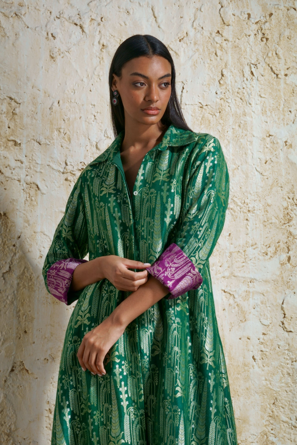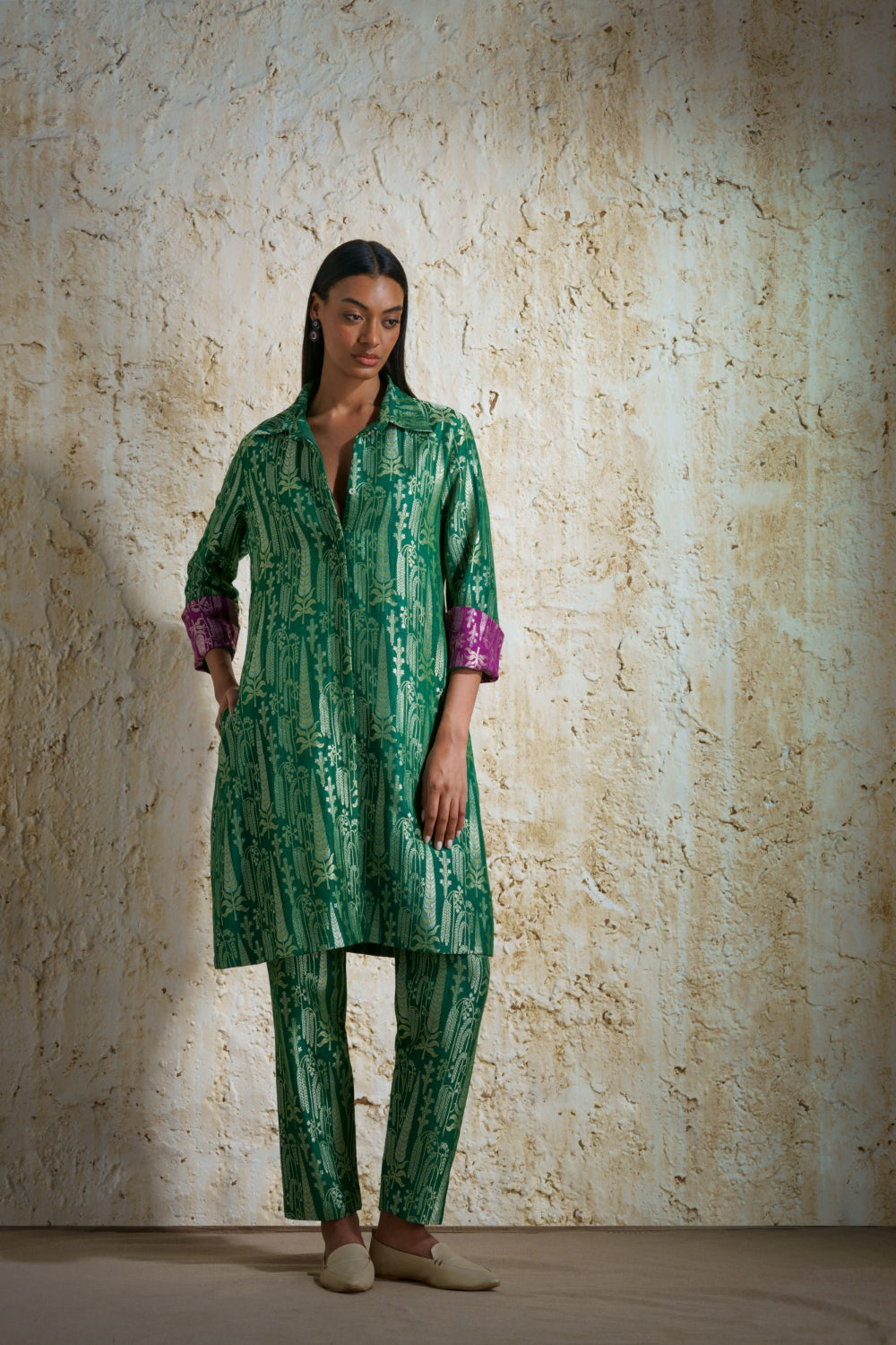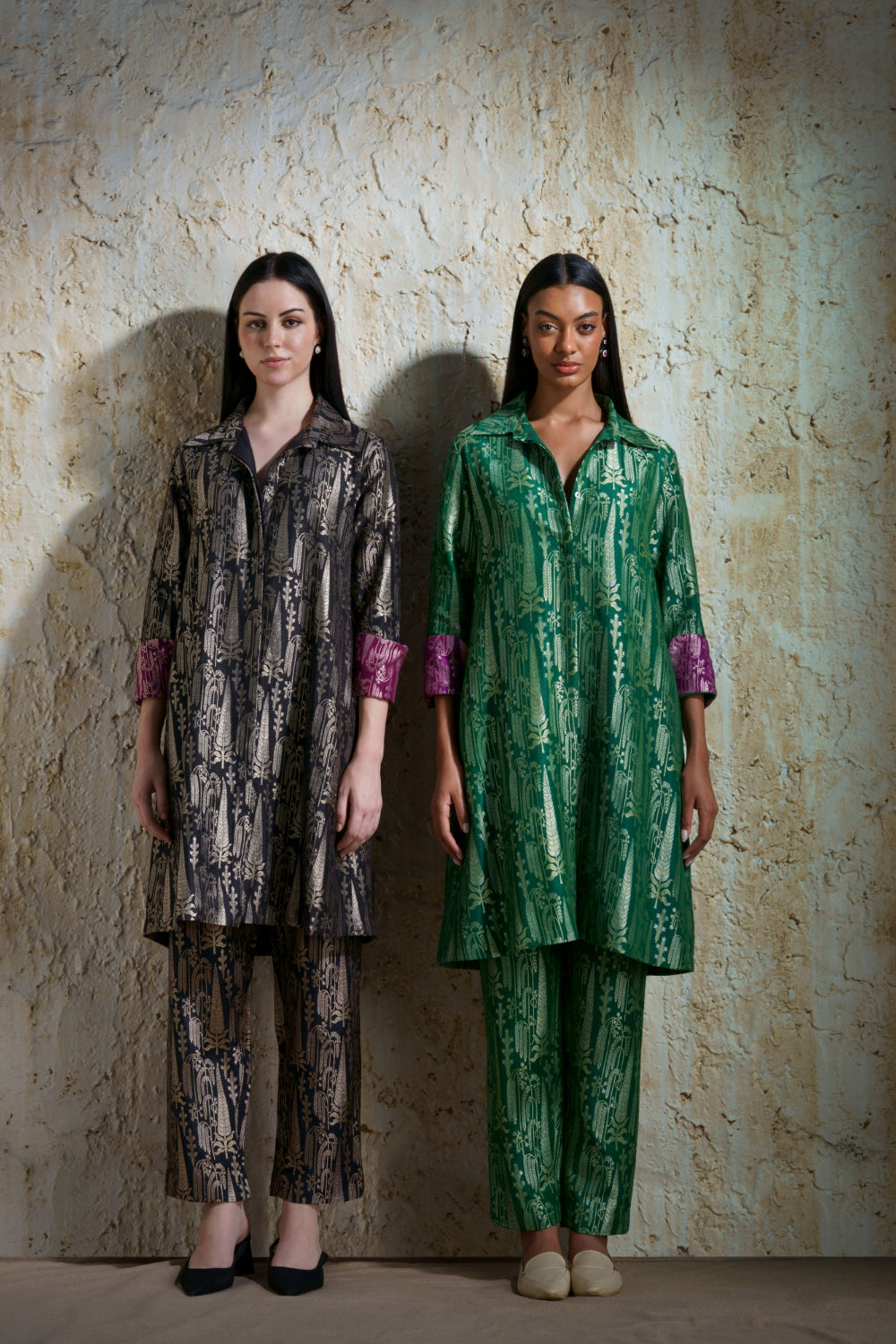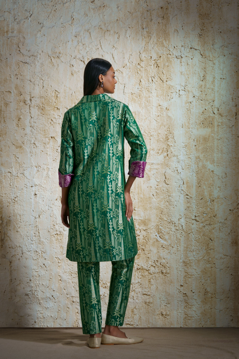 ‘Vriksha’ emerald green collared tunic and slim pants in munga silk handwoven in silver-gold cypress motifs and willow trees in a dense pattern. The two colors shown are emerald green and black with magenta accent on the cuffs. Inspired by vintage European museum design the motifs woven by skilled weavers of Banaras.