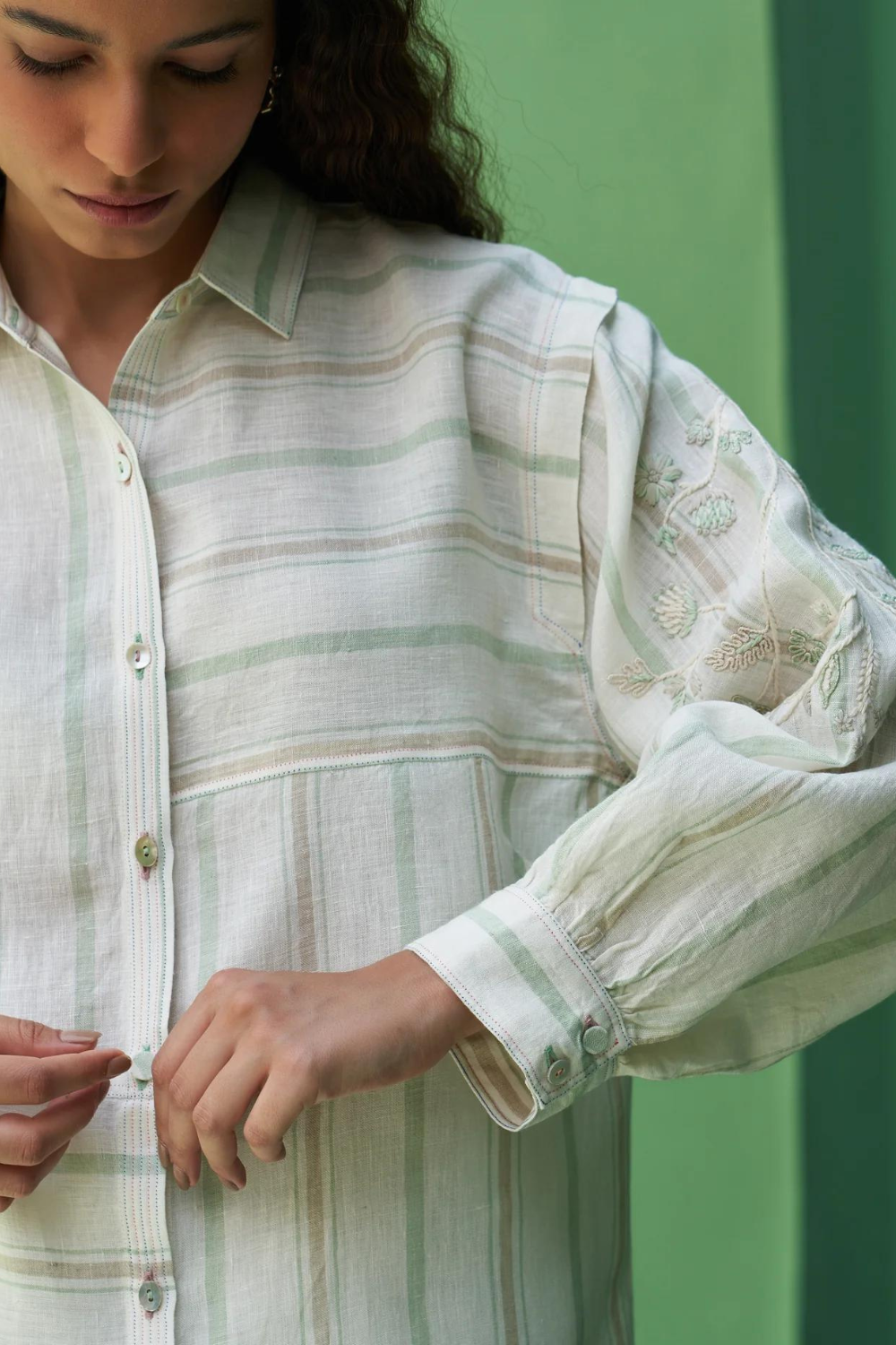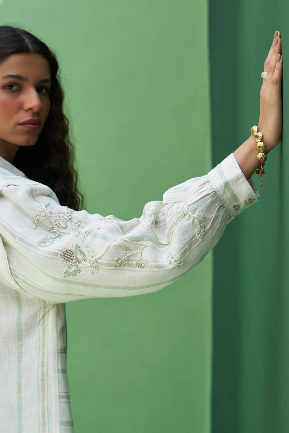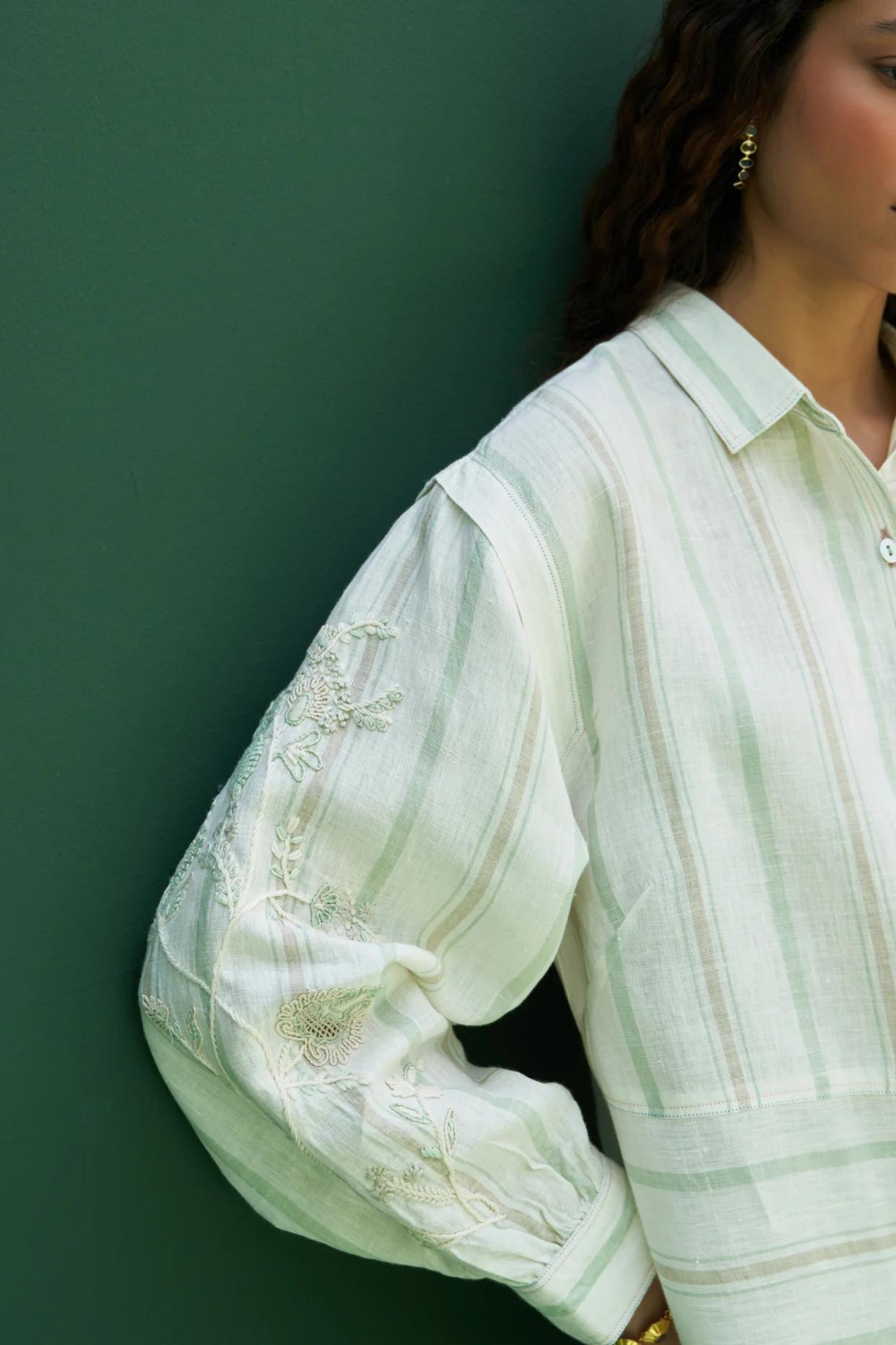 A patchwork shirt in our handwoven soft striped linen with a regular shirt collar and intricately hand-embroidered motifs on the sleeves in mixed techniques of cord-work, french knots and jaali/mesh crocheted by hand. The shirt is finished with a pleat detail at the shoulders and a variety of mother-of-pearl and linen fabric buttons.