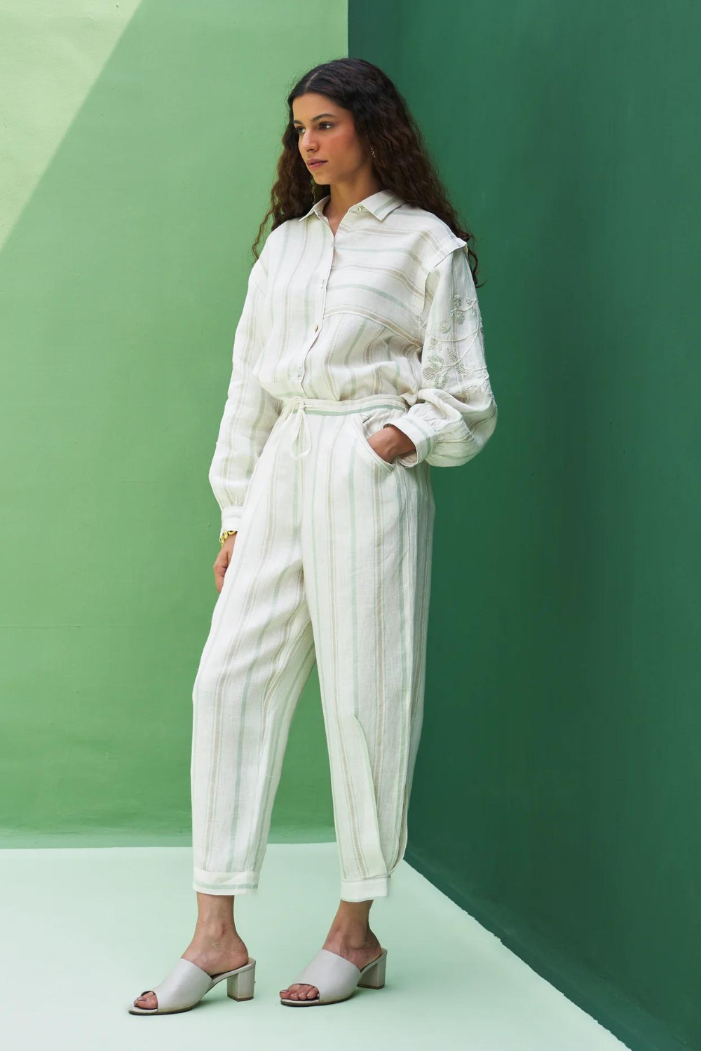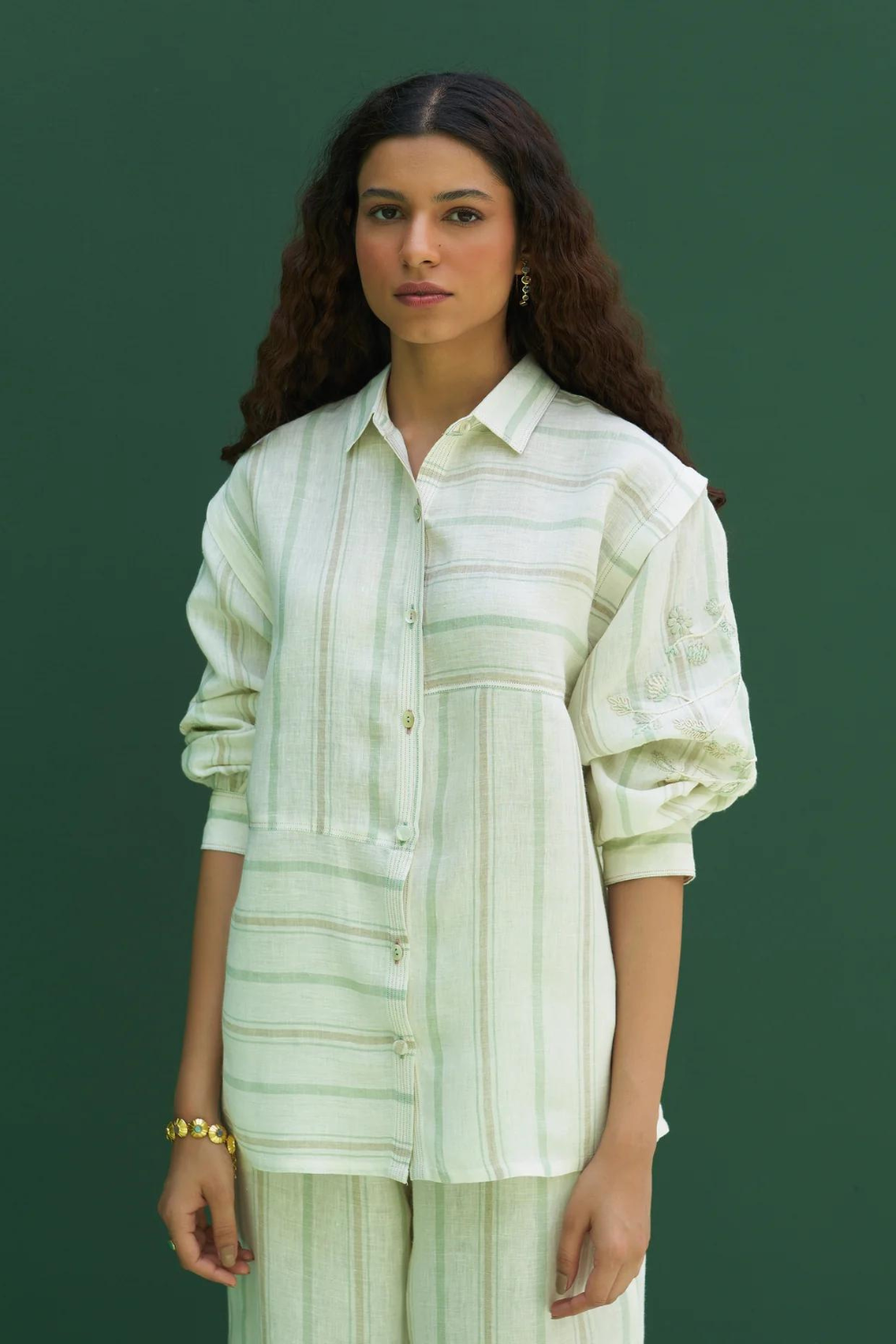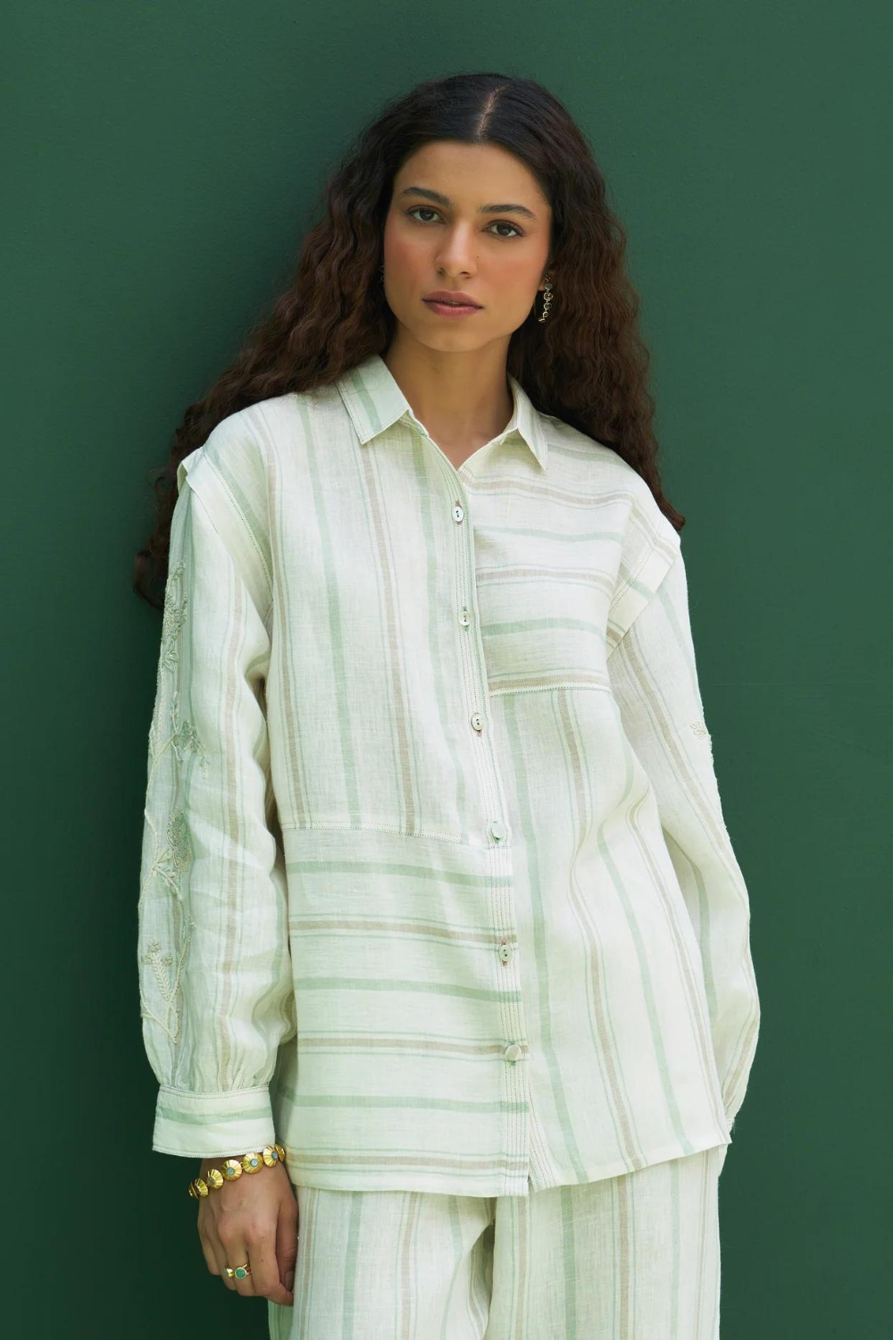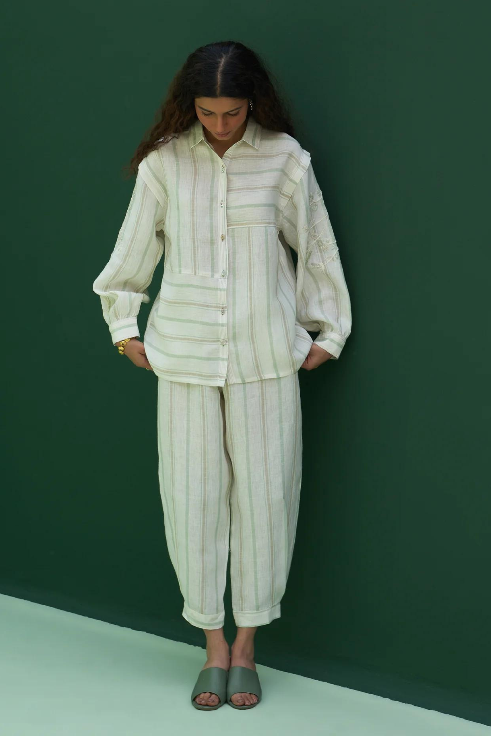 A patchwork shirt in our handwoven soft striped linen with a regular shirt collar and intricately hand-embroidered motifs on the sleeves in mixed techniques of cord-work, french knots and jaali/mesh crocheted by hand. The shirt is finished with a pleat detail at the shoulders and a variety of mother-of-pearl and linen fabric buttons.