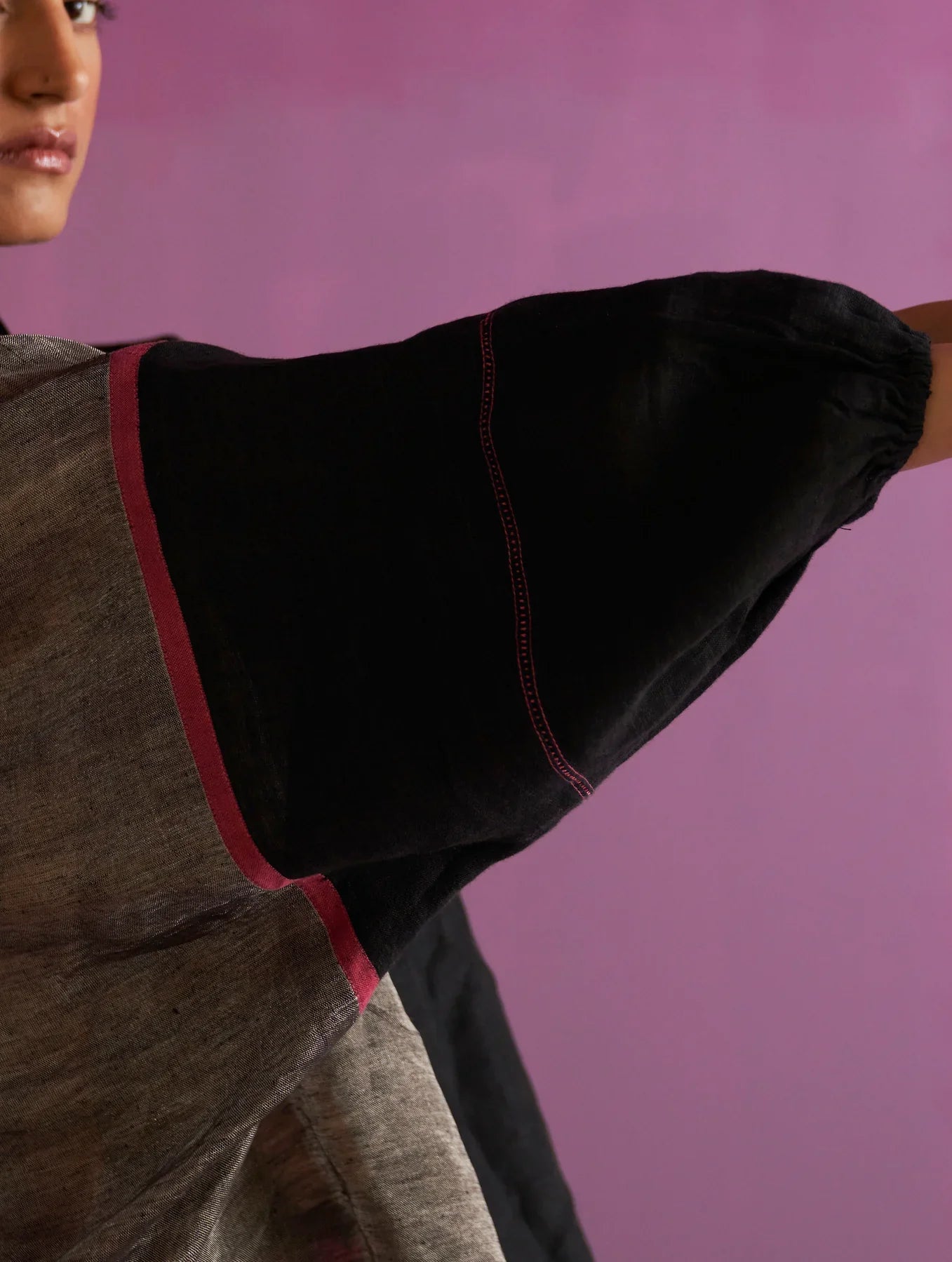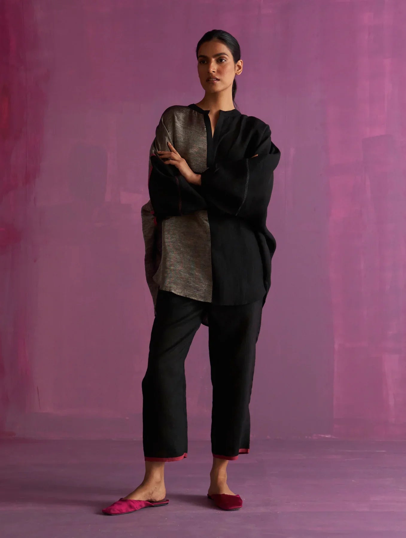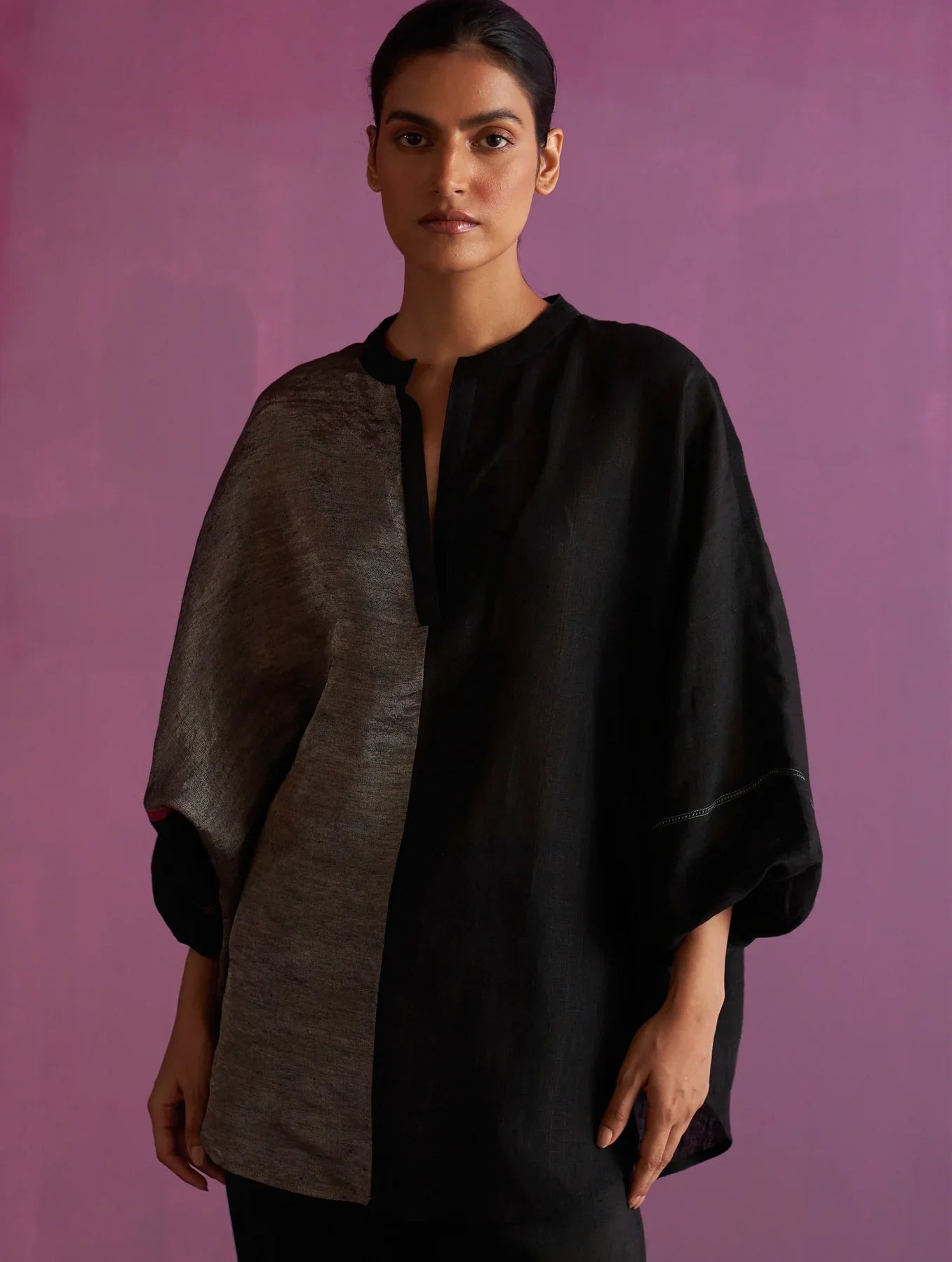 An oversized dolman sleeve top with a half-and-half soft metallic linen weave finished with soft elasticated wrist cuffs with a handmade jaali (mesh) stitch on the sleeve in pop coloured threads.