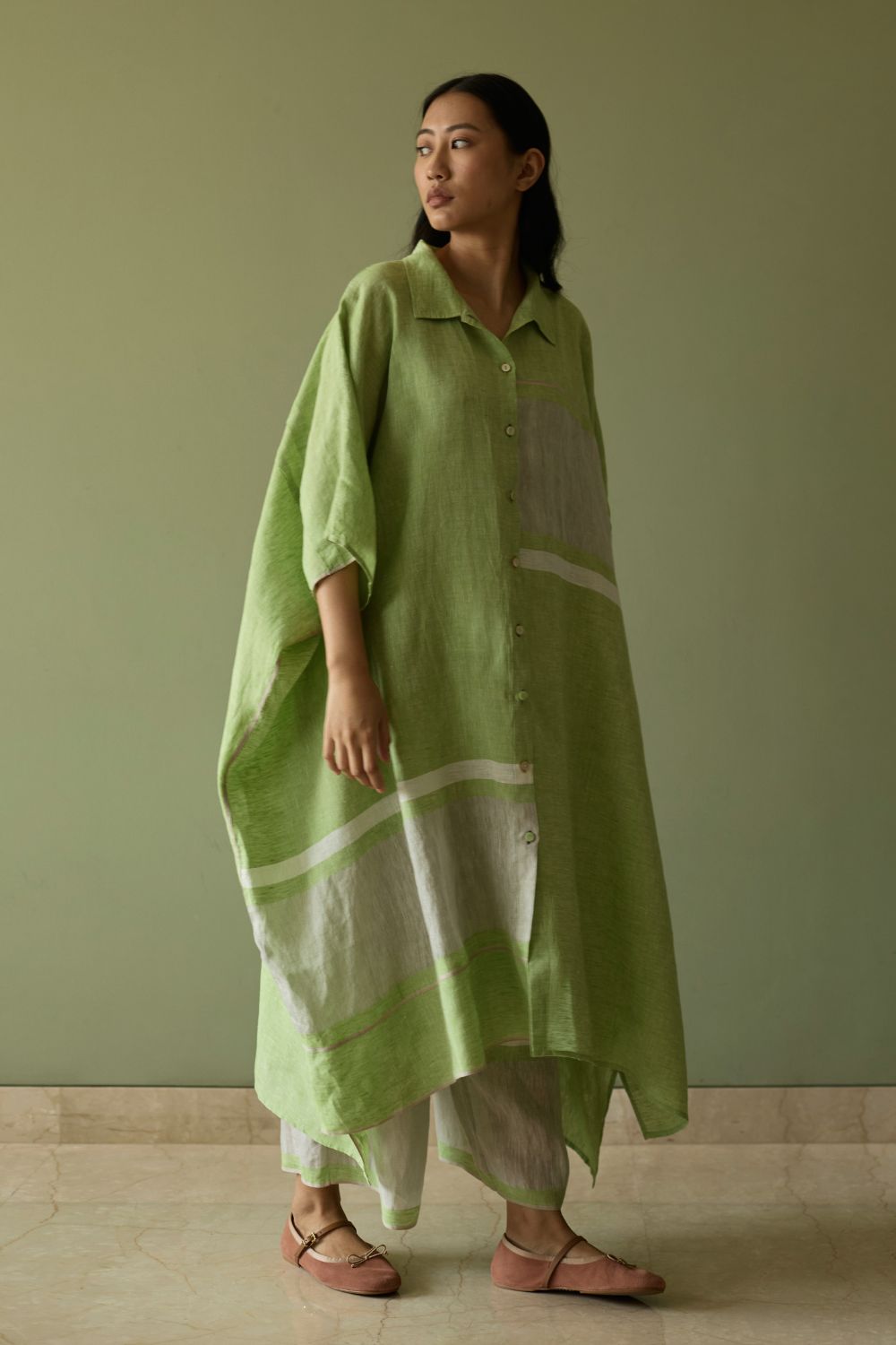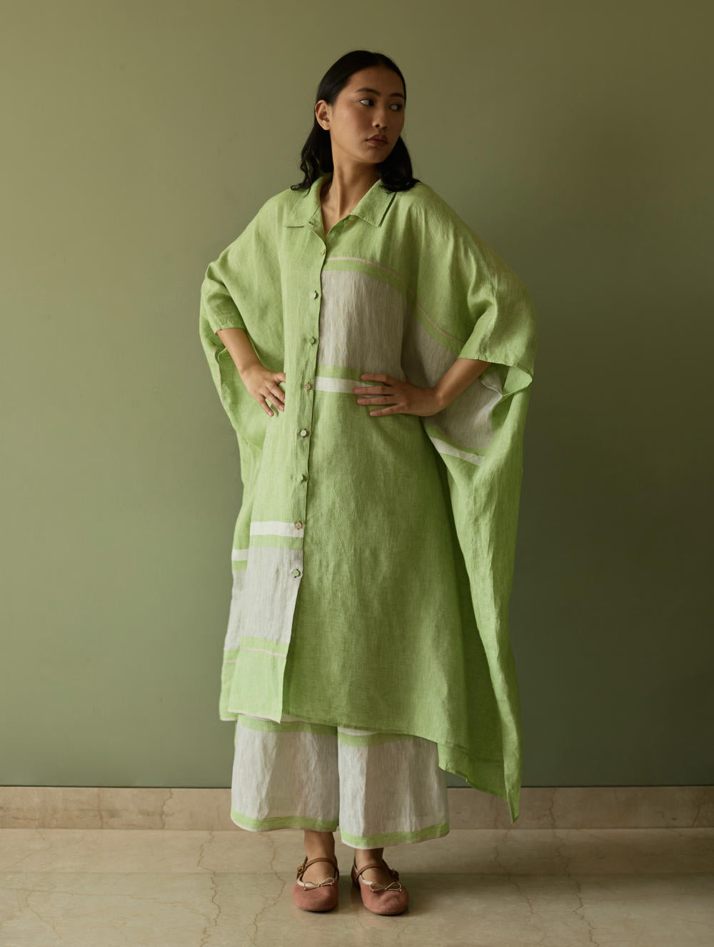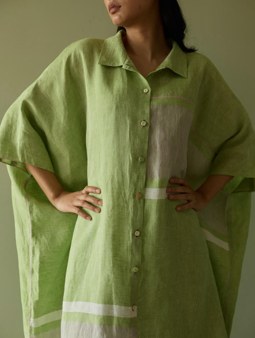 This effortlessly chic colour-blocked kaftan is crafted from our signature soft handwoven metallic border linen, highlighted by a subtle grey selvedge. The relaxed and flowing silhouette features a button-down placket and thoughtful placement of border detailing on the front and back. At the back yoke, soft double pleats add movement and dimension. Finished with mix of linen-covered and luminous mother-of-pearl buttons, this piece is is easy, versatile and statement - all at the same time.