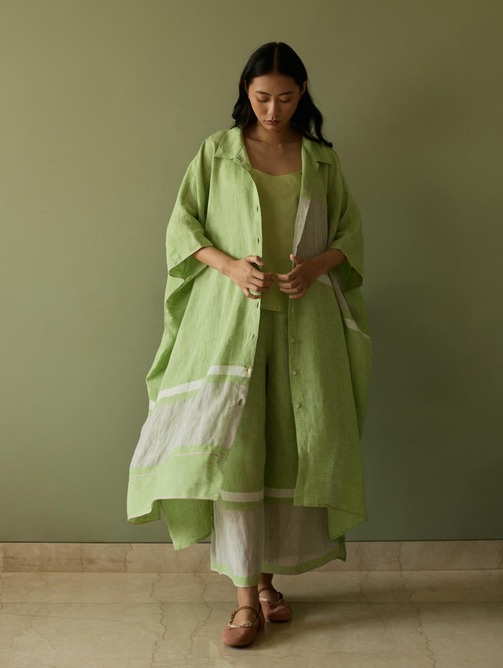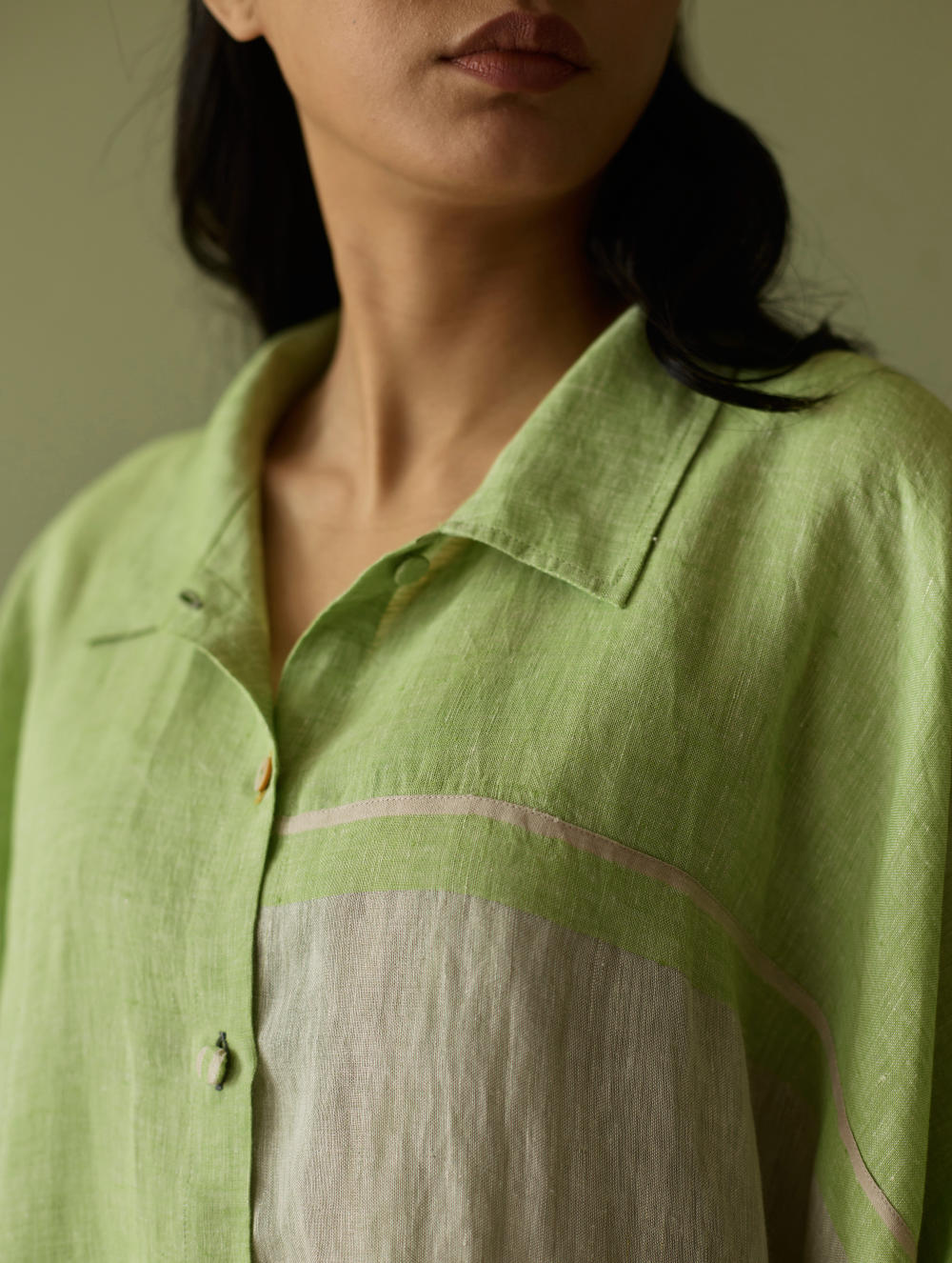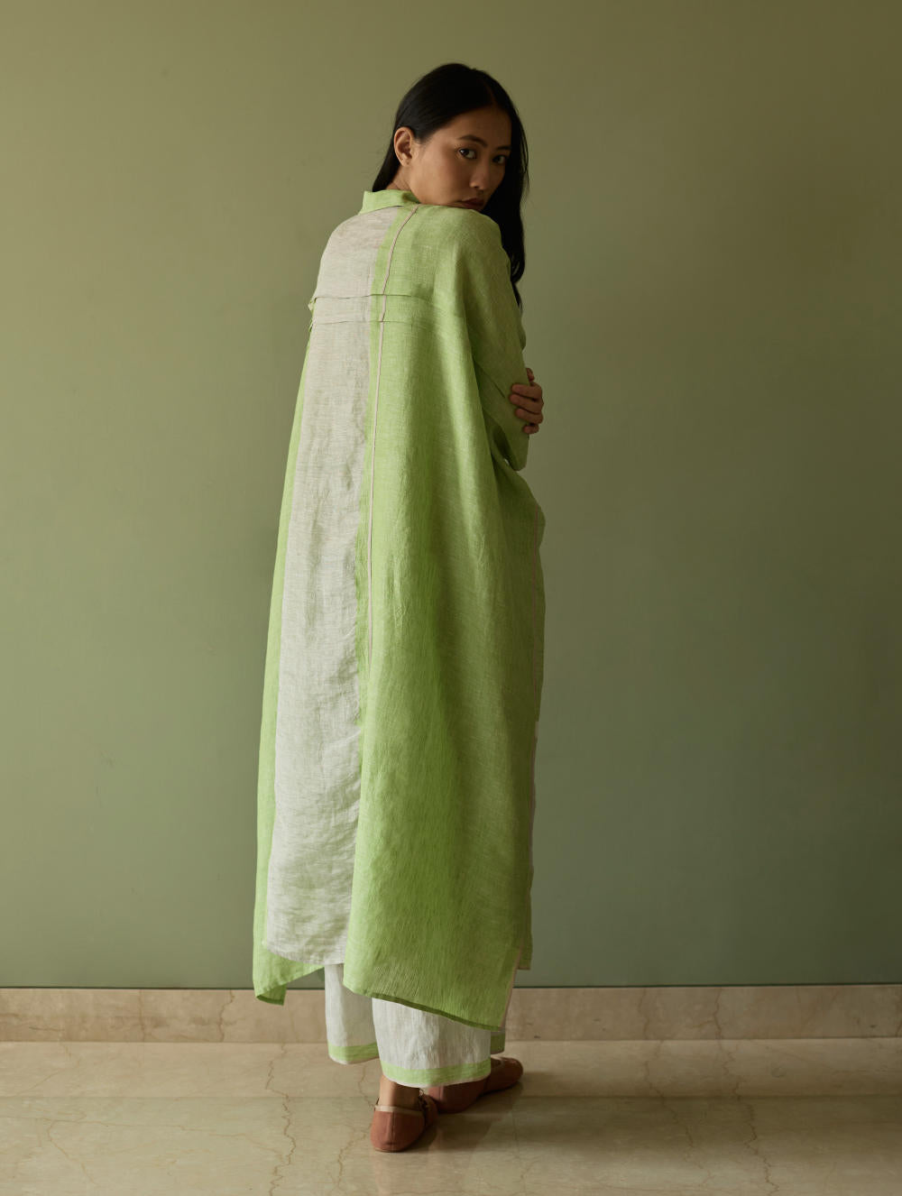 Their signature linens soften beautifully with time, eventually returning to the earth. They work with eri (ahimsa) silk, celebrated for its strength and gentle texture, and craft thoughtful blends of viscose, cotton, silk, and linen for pieces designed to last. Yarn-dyed techniques minimise chemical use and create the subtle, heathered tones that have become a quiet Manan signature.