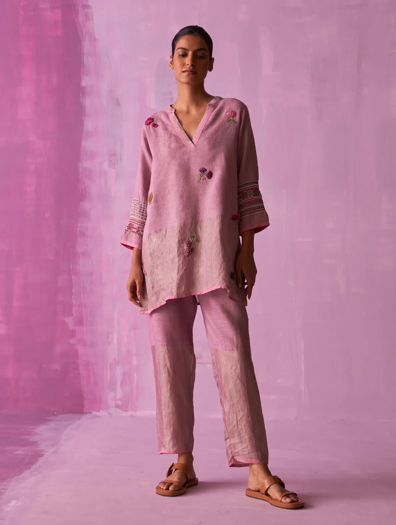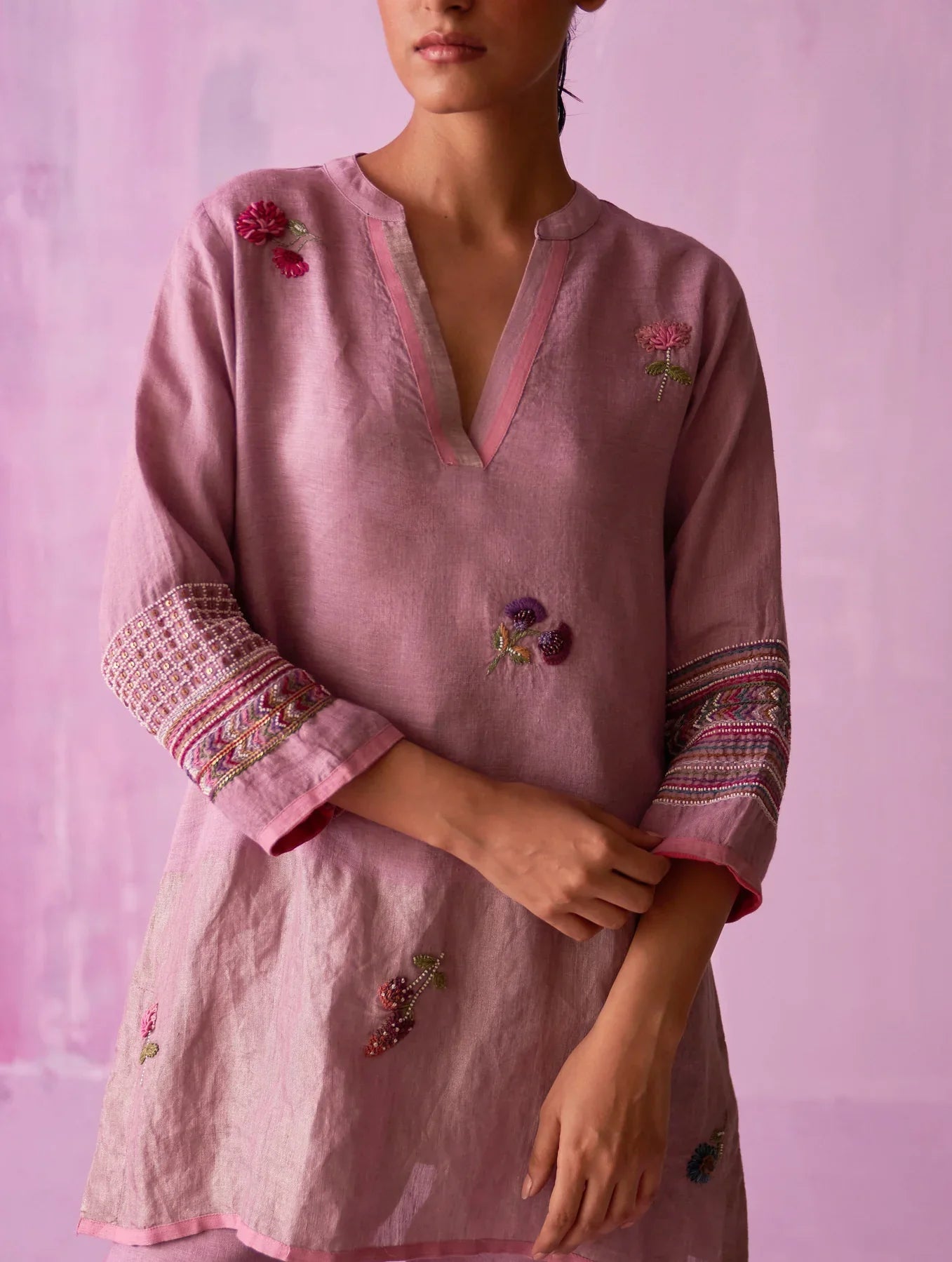 A short kurta with 3/4th sleeves in our signature soft hand-woven metallic linen with a pop colored selvedge hand-embroidered with textural thread-embroidered floral motifs and textured banjara style embroidered borders in mixed patterns with intricate threadwork and uneven beads.