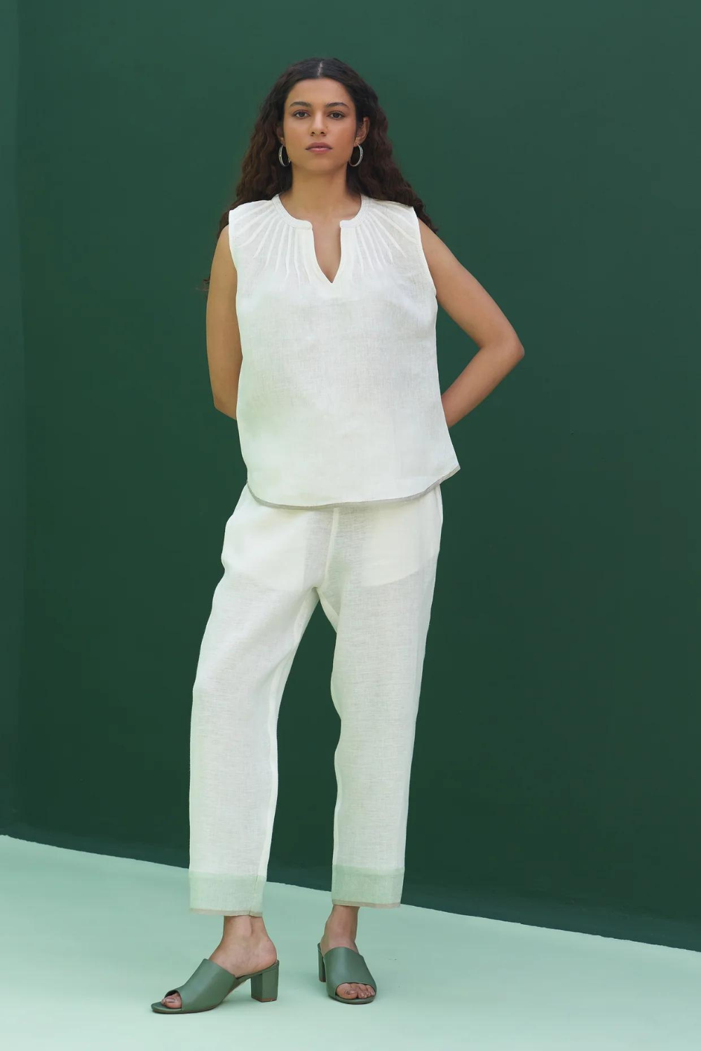 A sleeveless short top with fine hand stitched pintucks at the neck finished with a mandarin collar detailed with two coloured top stitch; The Emi top is handcrafted in our soft handloom linen with a selfwoven mint borders and is the perfect top for humid and hot summers.