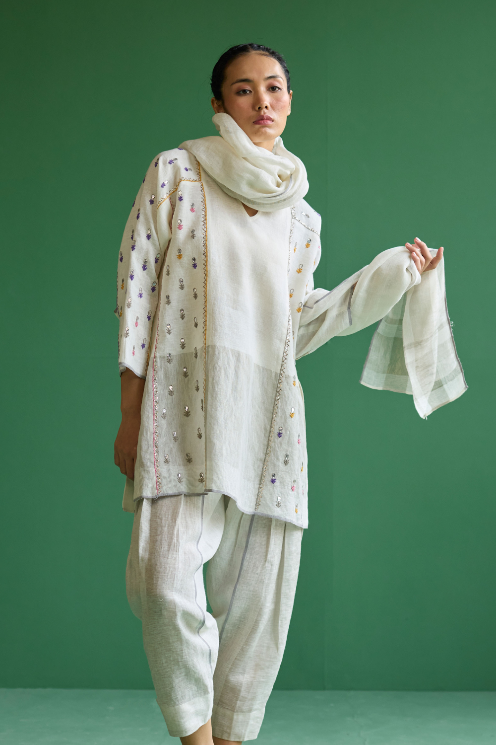 Kurta - A paneled short kurta with 3/4th sleeves in our signature yarn-dyed soft handloom metallic border linen with a stripe border weave and grey-colored selvage. The kurta is intricately hand-embroidered with zardozi and gotapatti with a mix of metallic and multicolor threads.