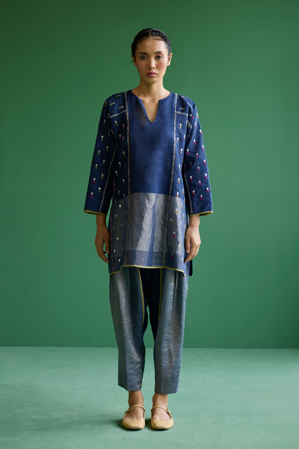 A paneled short kurta with 3/4th sleeves in our signature yarn-dyed soft handloom metallic border linen with a grey stripe border weave and grey-colored selvage. The kurta is intricately hand-embroidered with zardozi and Gota patti with a mix of metallic and multicolor threads.