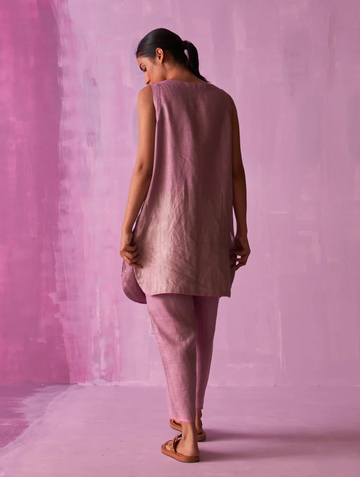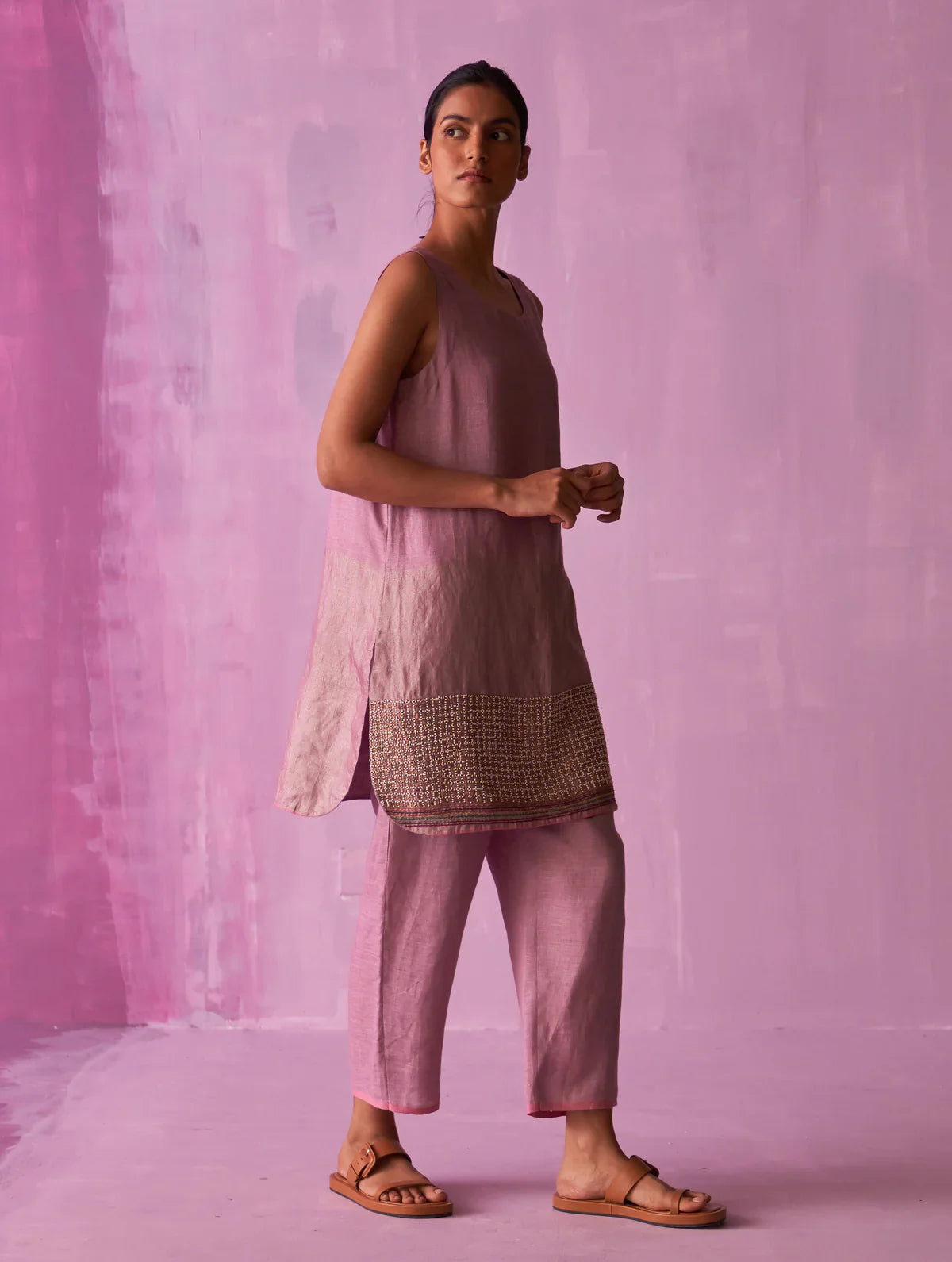 A sleeveless short kurta in our soft handwoven metallic linen with lattice pattern intricately hand-embroidered with metallic sequins, uneven beads and multi-coloured multi-coloured threadwork. Pairs beautifully with our tapered metallic linen pants.