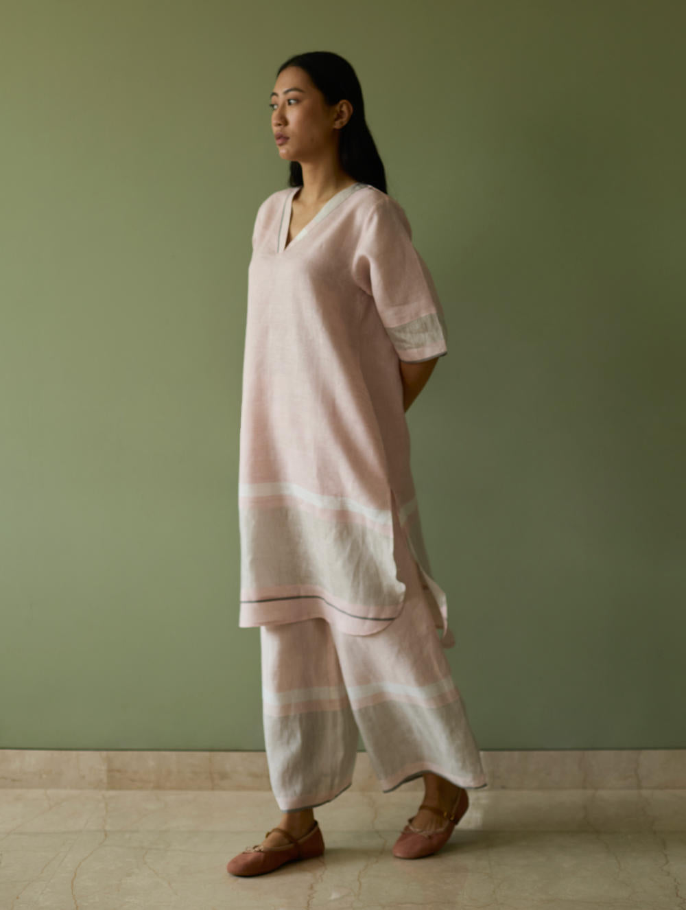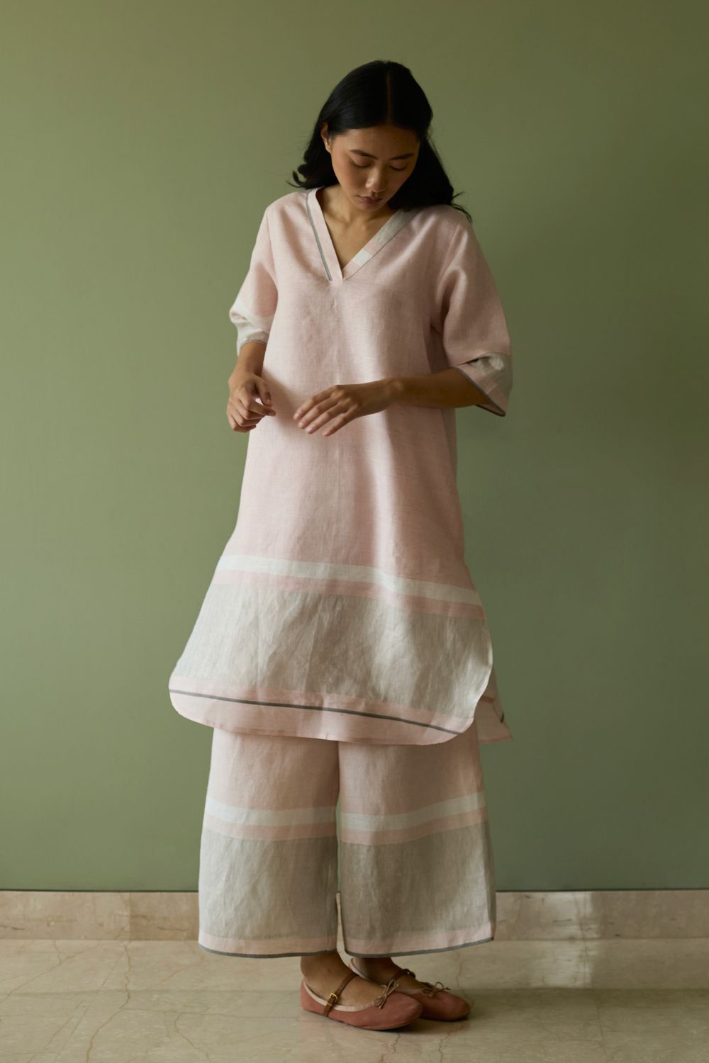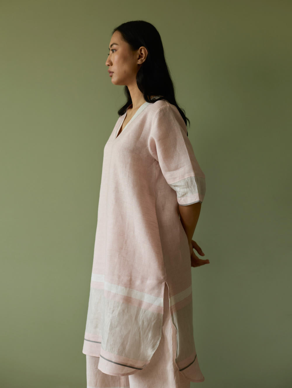 Kurta - This timeless versatile kurta is designed in our bespoke handwoven soft metallic border linen with a grey selvedge. The Iva Kurta has pockets and is accented with a metallic border at the hemline with a woven grey edging placed at the hemline, neckline and sleeves. The Iva works for all occasions and is one of our year-round favourites.