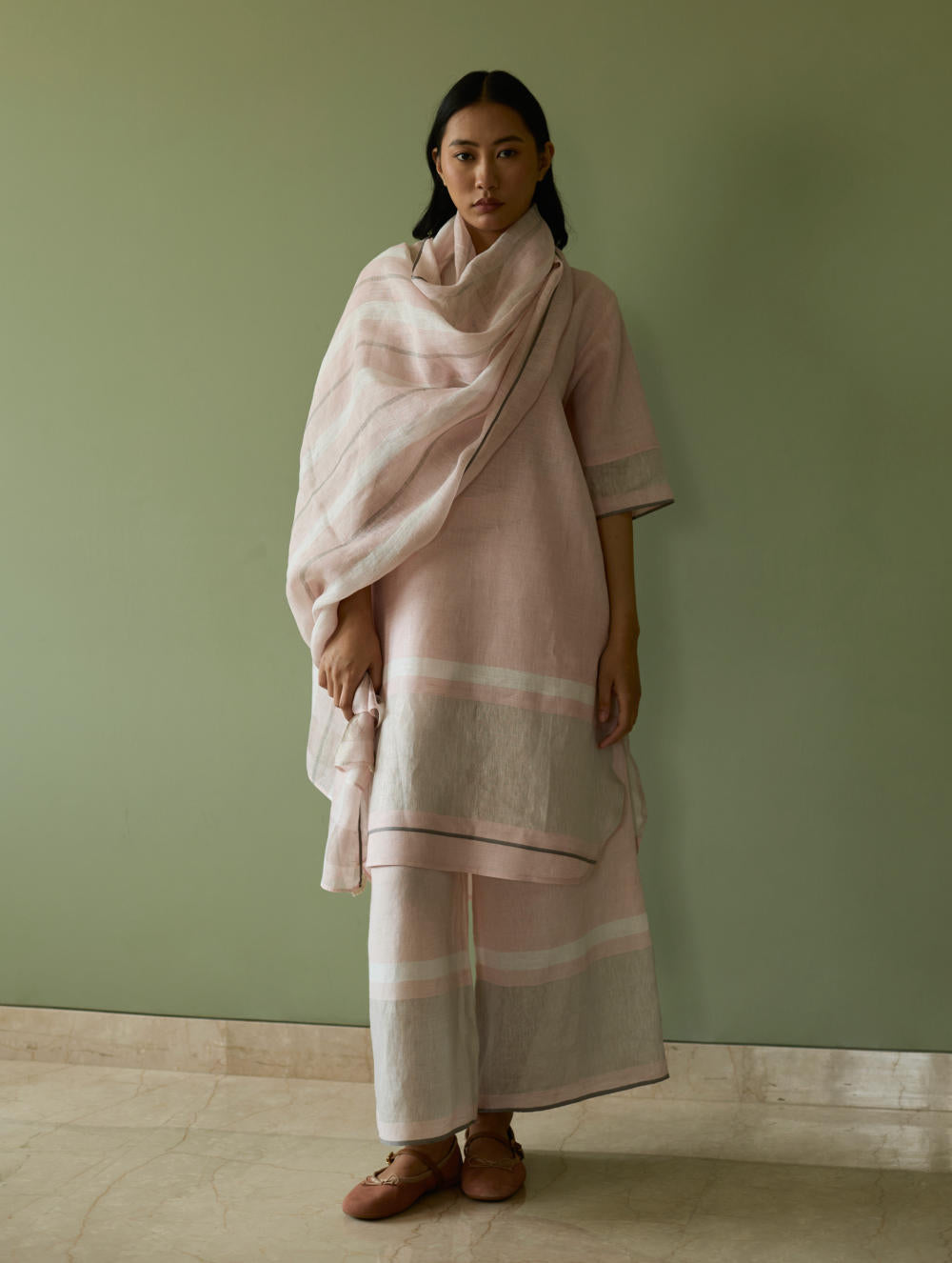 Dupatta - Soft handwoven pure linen dupatta with metallic border, featuring a mix of ivory and grey contrast stripes, adding depth and character to the minimalist blush palette. The dupatta is finished with intricate hand beadwok detailing on the edges.