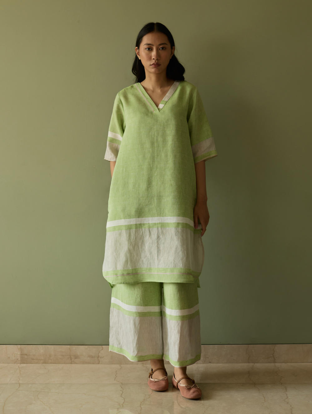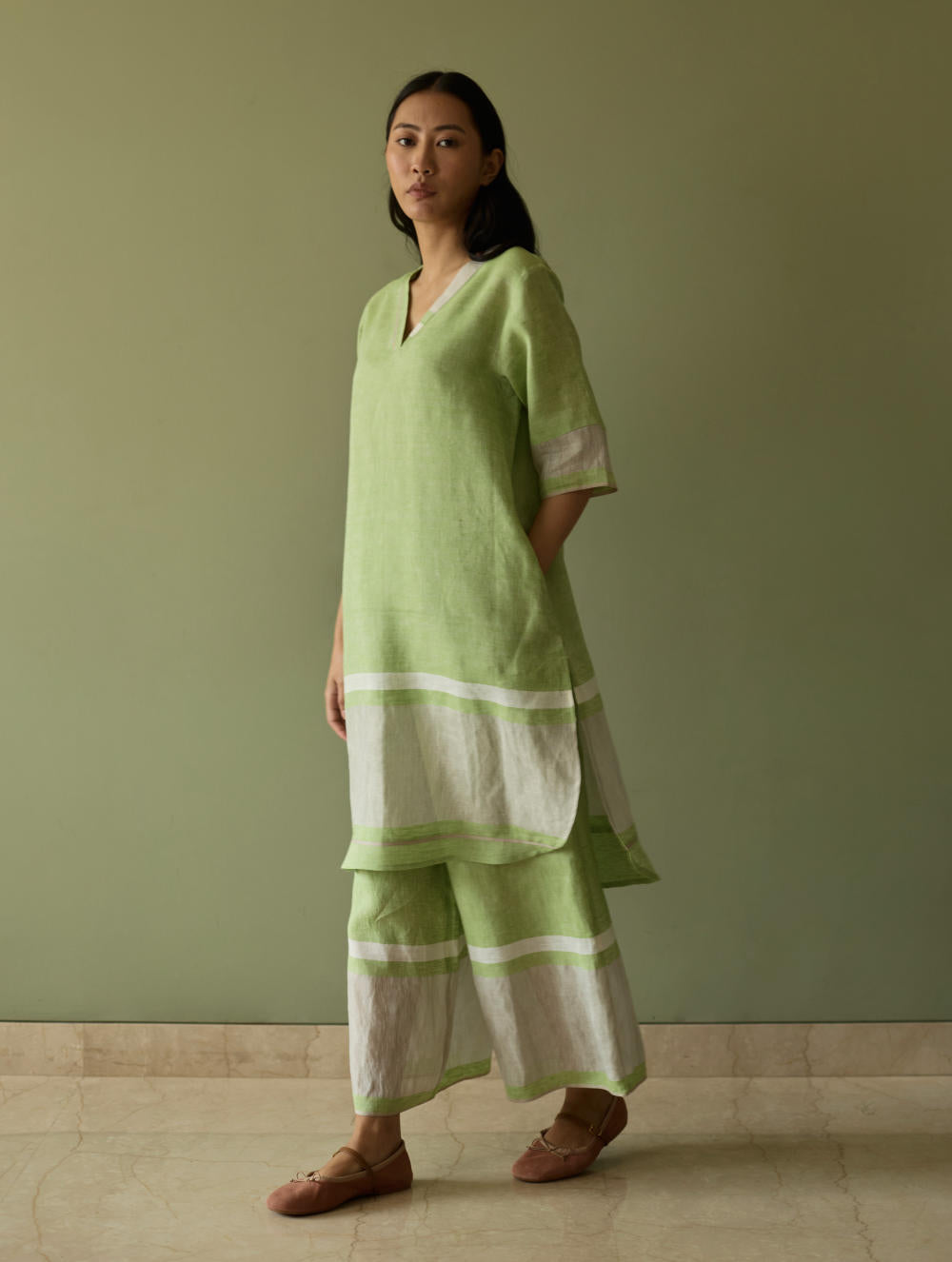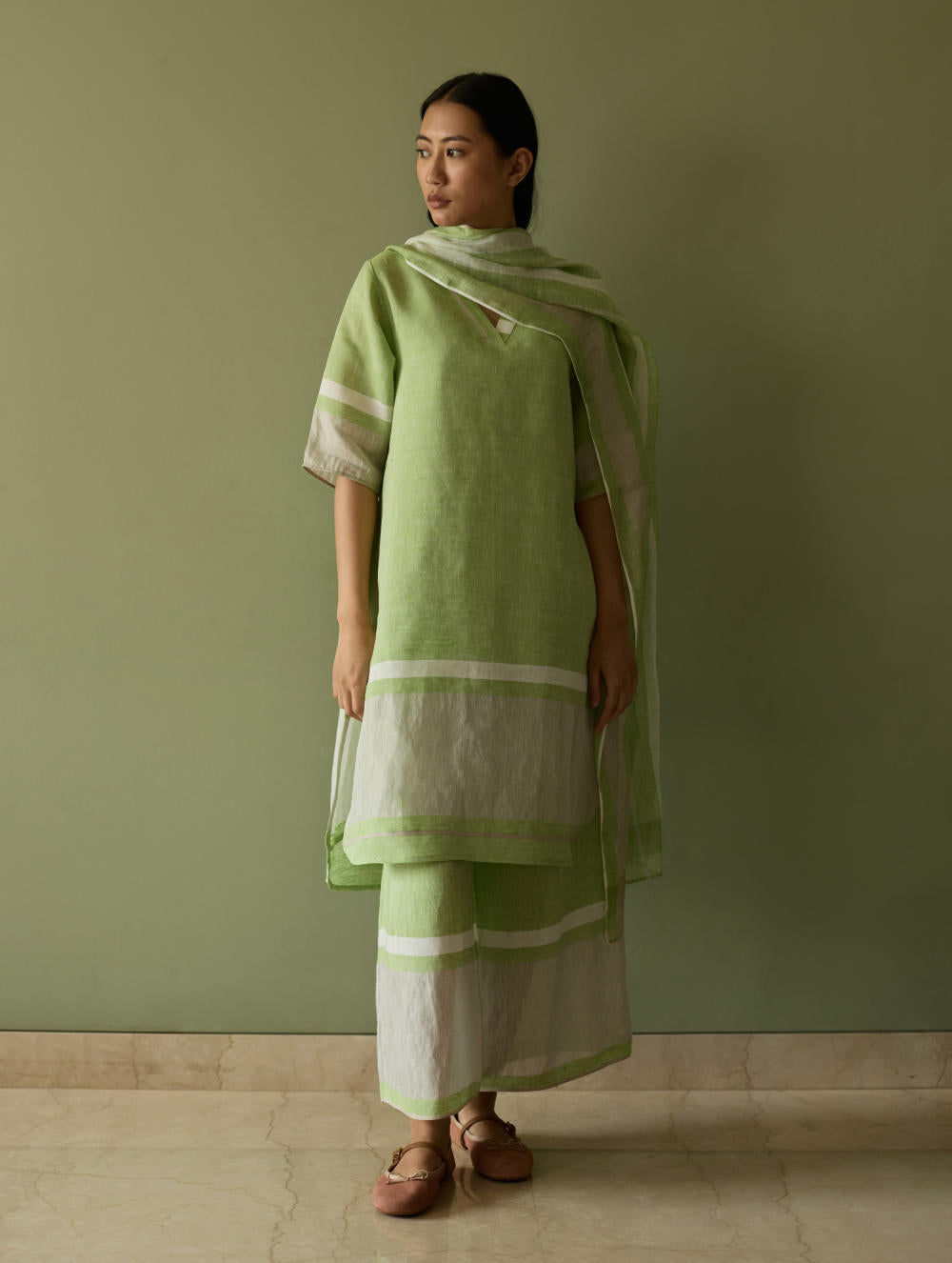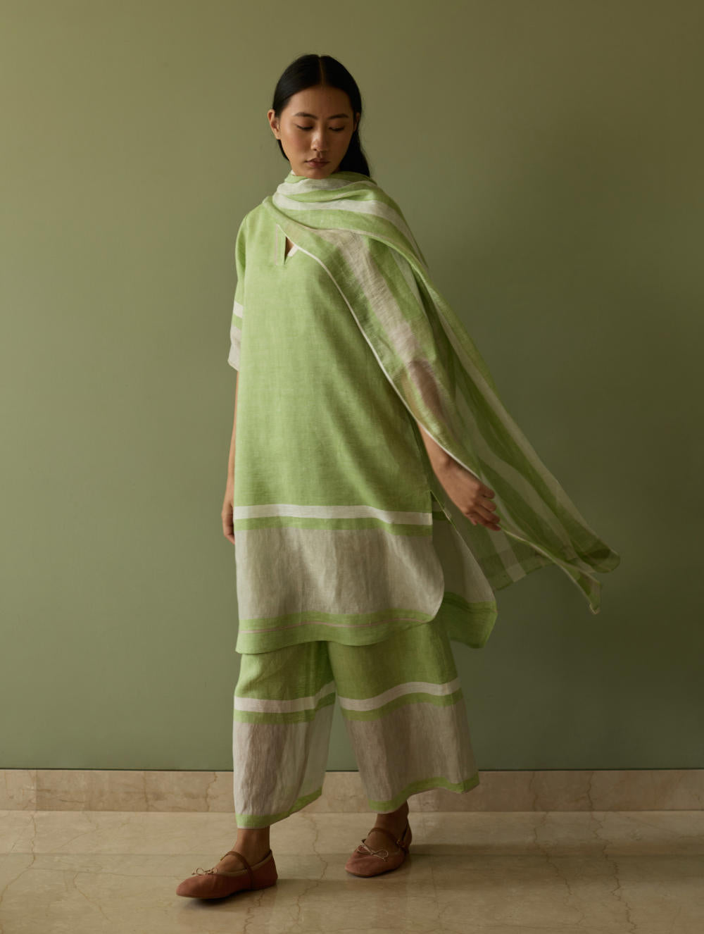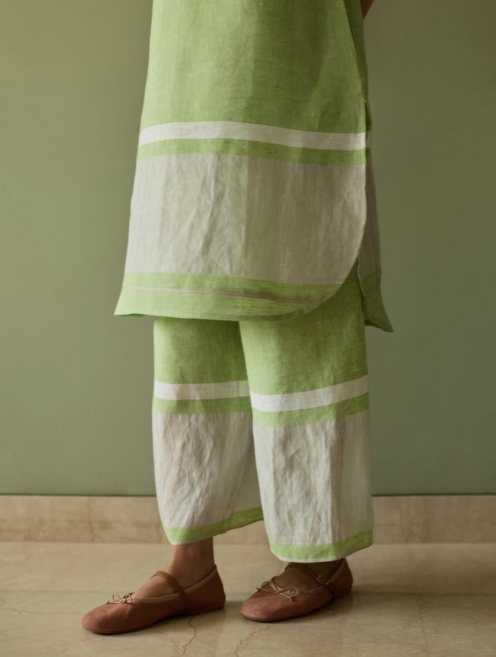 Their signature linens soften beautifully with time, eventually returning to the earth. They work with eri (ahimsa) silk, celebrated for its strength and gentle texture, and craft thoughtful blends of viscose, cotton, silk, and linen for pieces designed to last. Yarn-dyed techniques minimise chemical use and create the subtle, heathered tones that have become a quiet Manan signature.