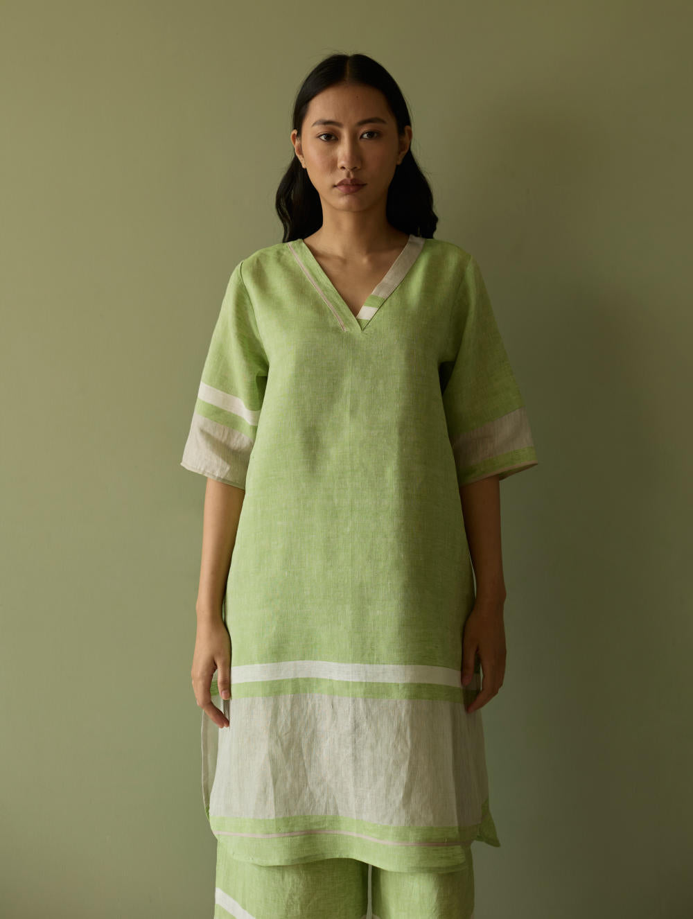 Kurta - This timeless versatile kurta is designed in our bespoke handwoven soft metallic border linen with a grey selvedge. The Iva Kurta has pockets and is accented with a metallic border at the hemline with a woven grey edging placed at the hemline, neckline and sleeves. The Iva works for all occasions and is one of our year-round favourites.