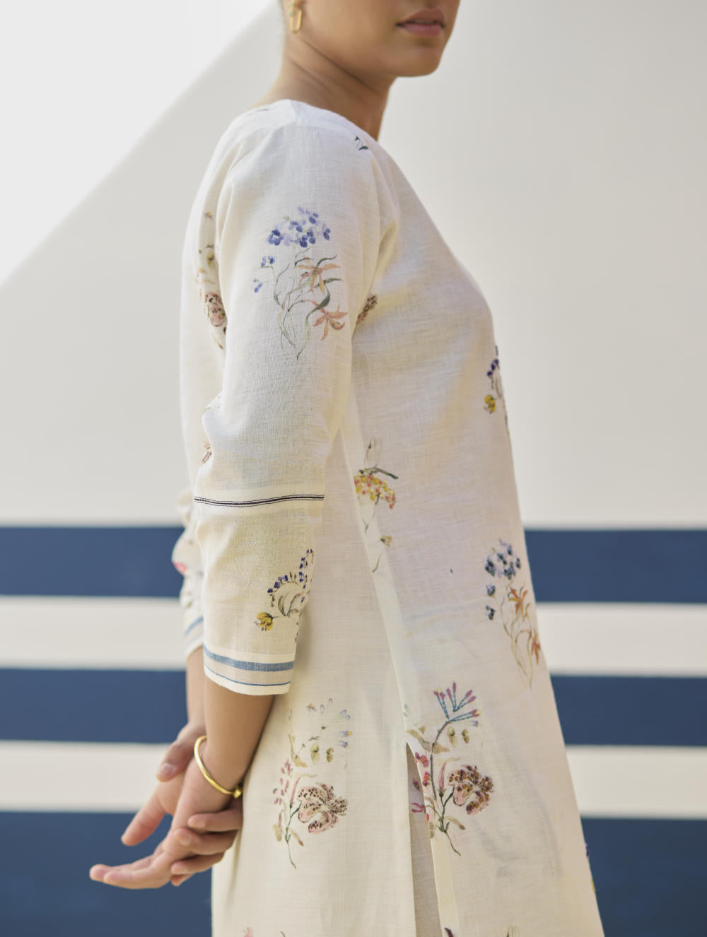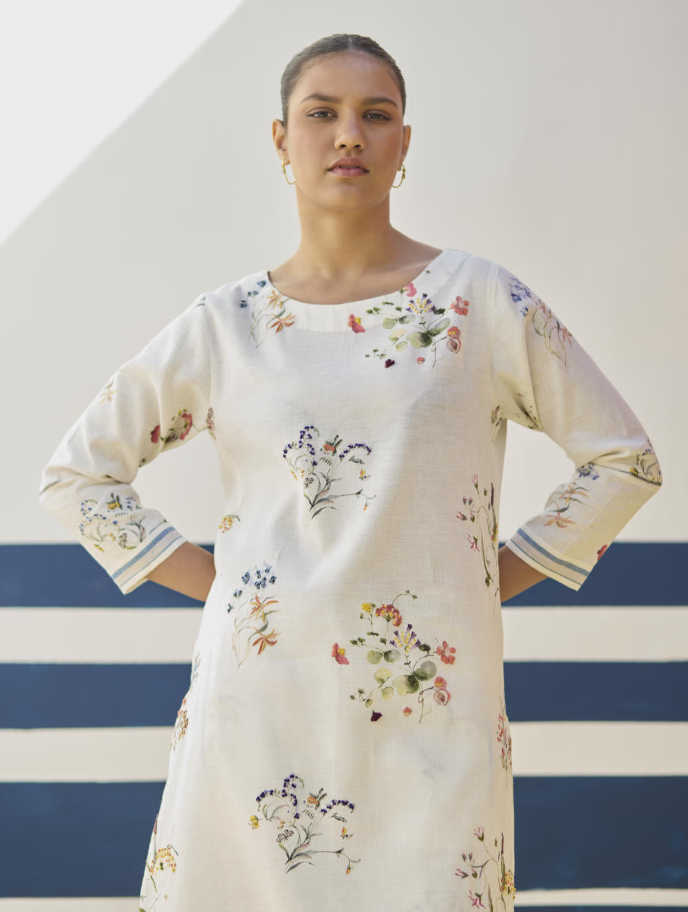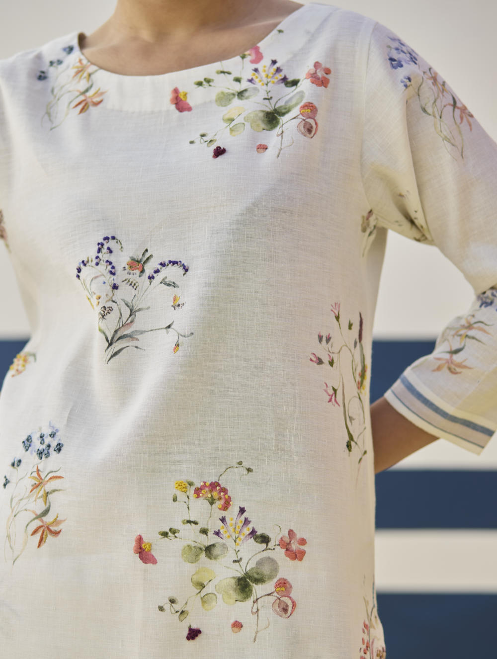 Our favourite hand-embroidered printed boat-neck full sleeve kurta on handloom linen cotton with a handwoven stripe border. The kurta is detailed with a handmade jaali (mesh) stitch detail on the sleeves and has intricately hand-embroidered french knots and single thread hand-embroidery with multi-coloured yarn on the hand-illustrated multicolour floral print.
