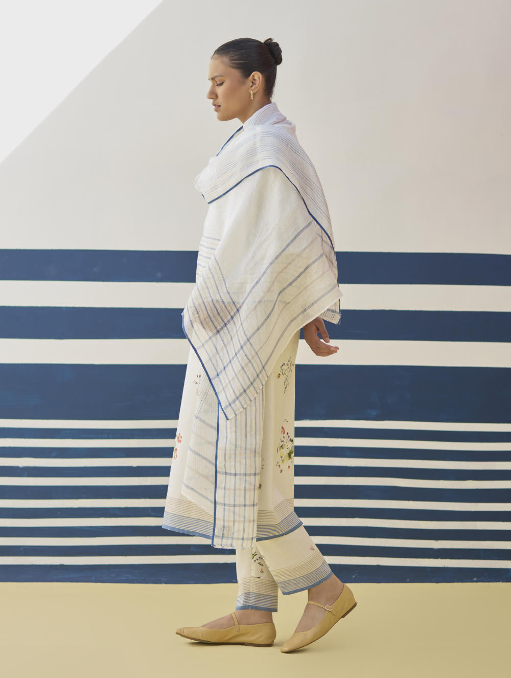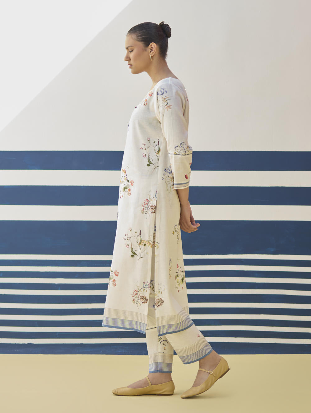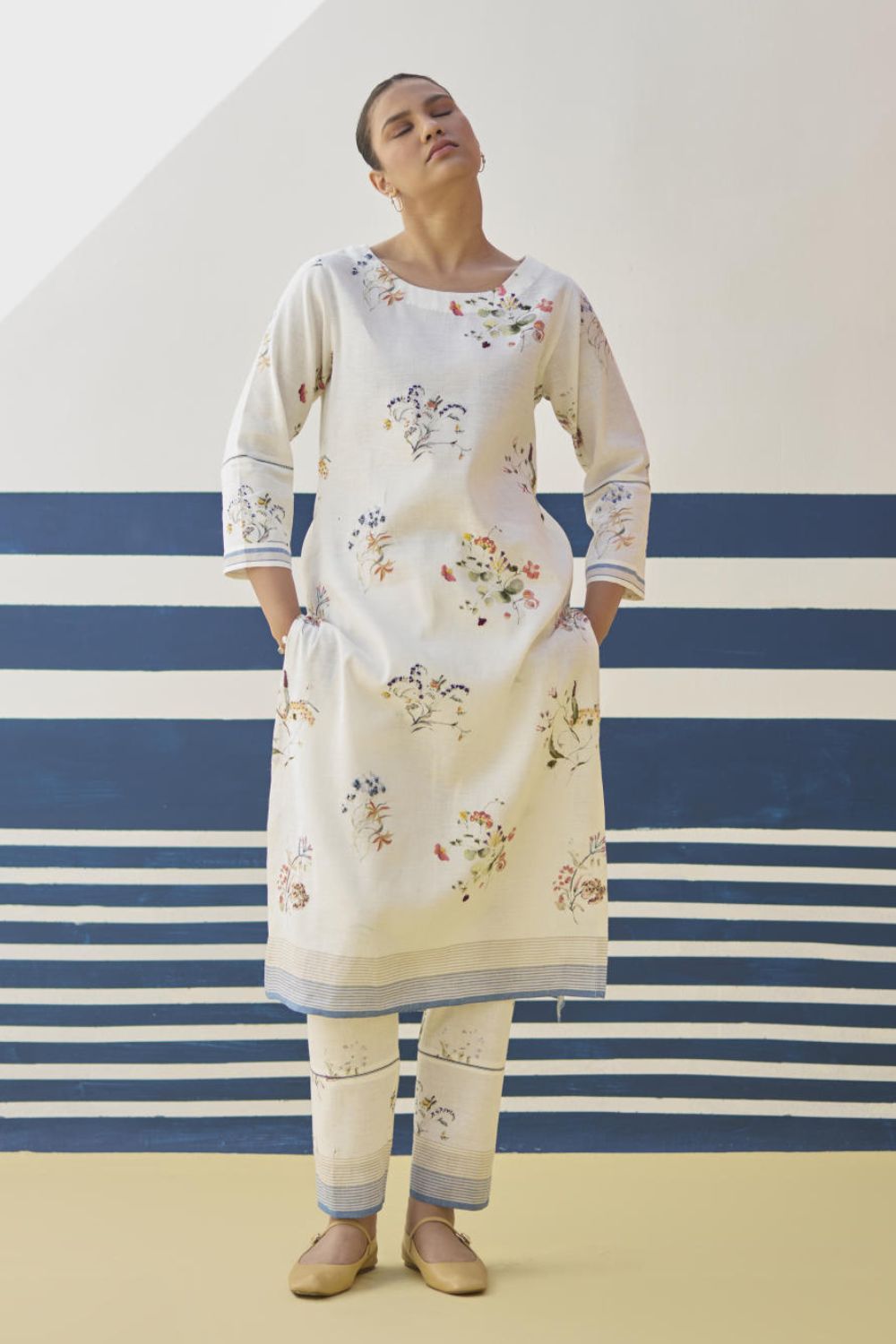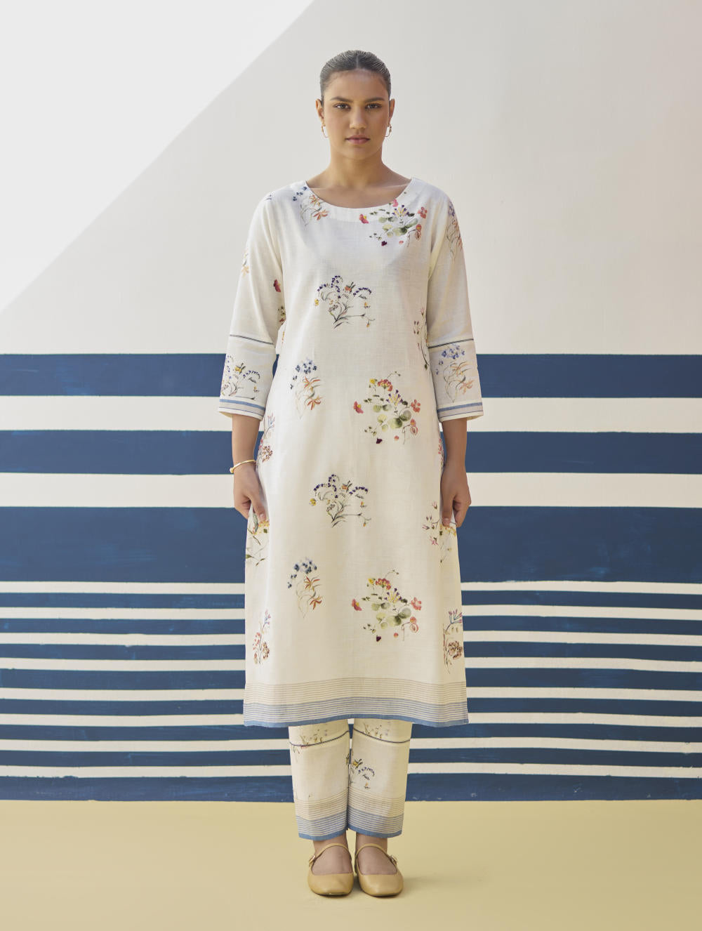Our favourite hand-embroidered printed boat-neck full sleeve kurta on handloom linen cotton with a handwoven stripe border. The kurta is detailed with a handmade jaali (mesh) stitch detail on the sleeves and has intricately hand-embroidered french knots and single thread hand-embroidery with multi-coloured yarn on the hand-illustrated multicolour floral print.