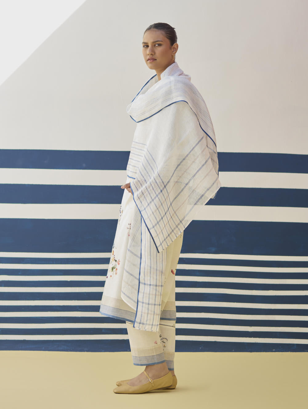 At Manan, textiles lead the design. Yarns, weaves, and hand-embroideries aren’t embellishments; they are the starting point. Fabrics are woven by master artisans across Bihar, Kashmir, and Himachal Pradesh, each region bringing its own history and nuance to the loom. Cuts and silhouettes are developed only after the fabric is born — a rare bottom-up approach that allows the textile itself to shine.