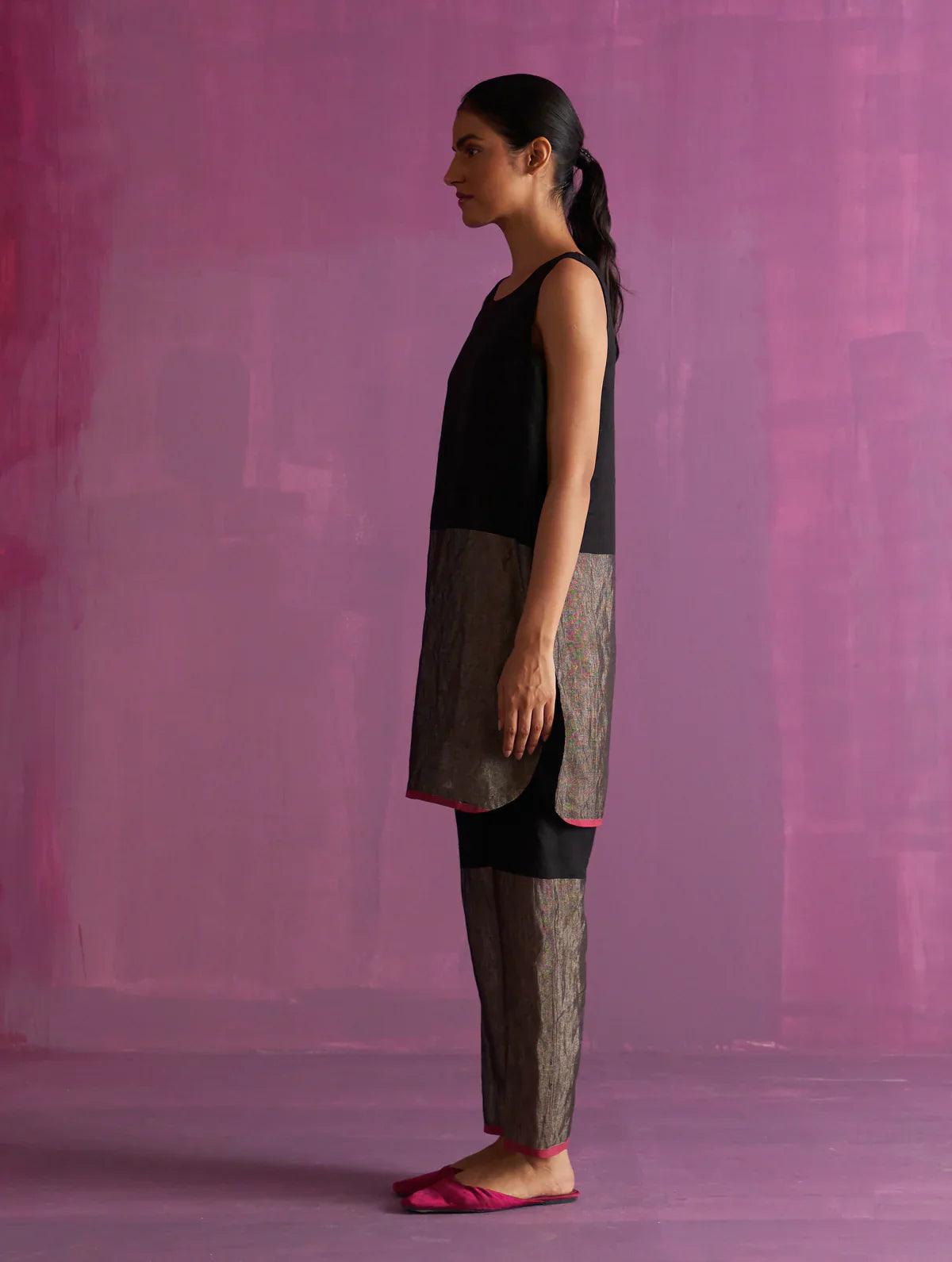 A sleeveless short kurta in our signature soft handwoven metallic linen with a pop coloured selvedge. Pair the look with our metallic linen palazzos and embroidered metallic linen dupatta.