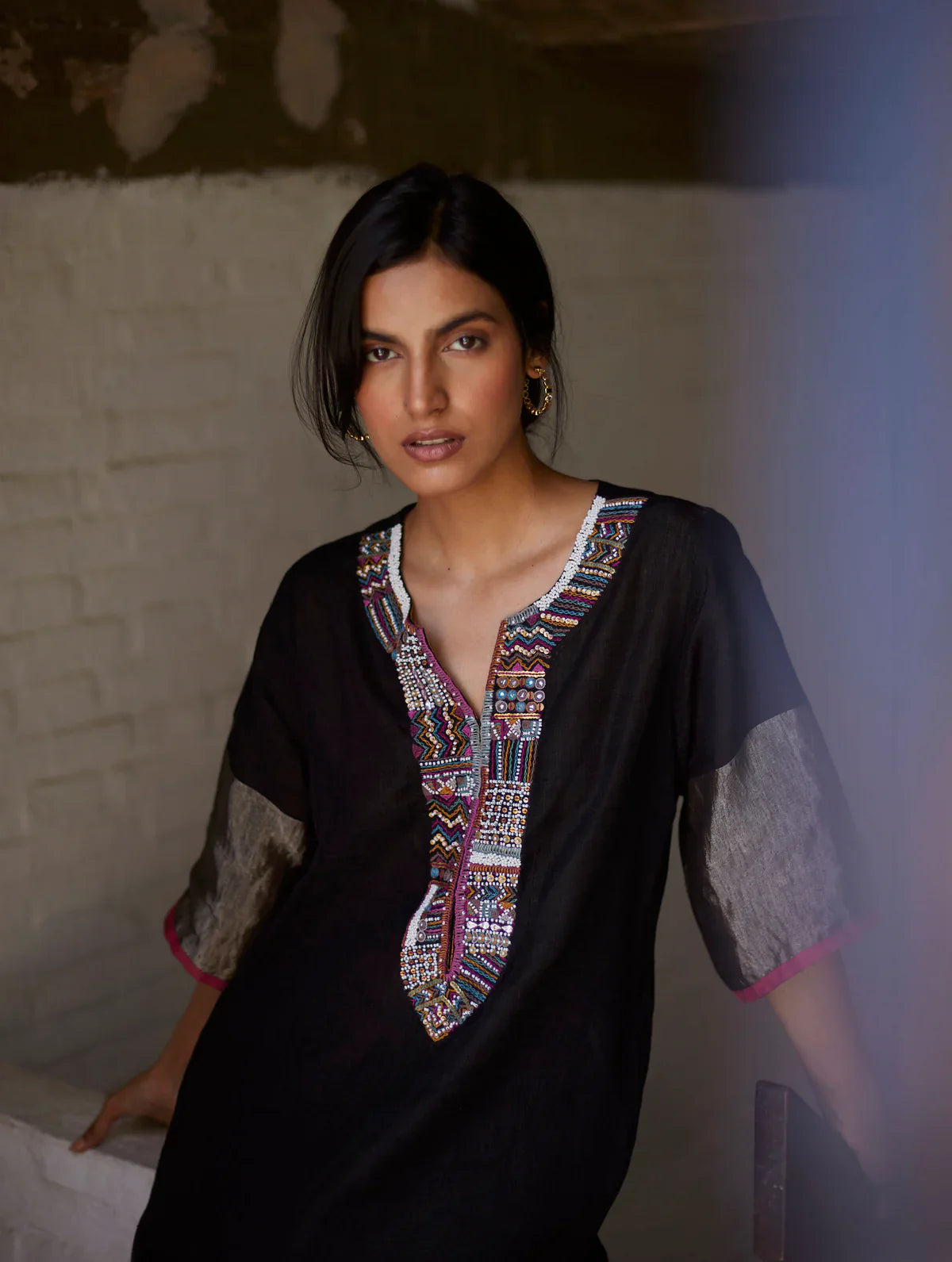 A signature Manan kurta in our soft handwoven metallic linen with a pop coloured selvedge hand-embroidered in a banjara style with multi-coloured threads, patterns, colours and uneven beads.