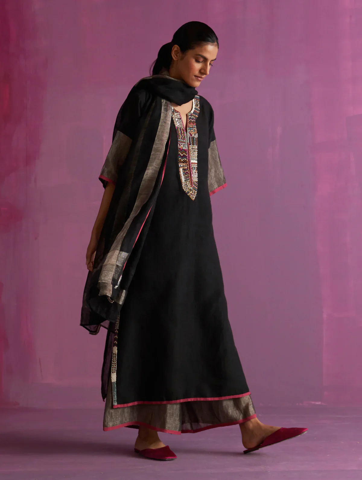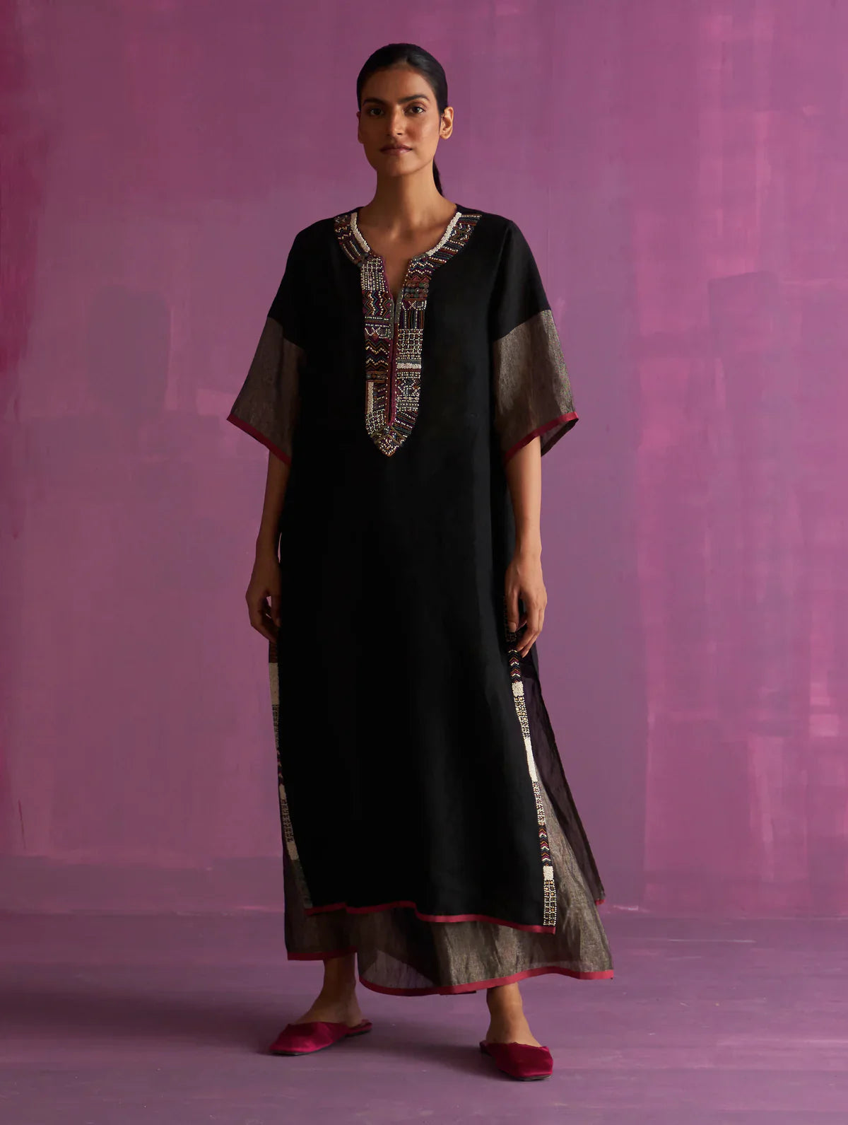 Kurta - A signature Manan kurta in our soft handwoven metallic linen with a pop coloured selvedge hand-embroidered in a banjara style with multi-coloured threads, patterns, colours and uneven beads. Pant - Handloom soft linen palazzo pants with woven metallic zari border at the hem and a pop-coloured selvedge. The pant has an elasticated waistband at the back with a drawstring and pockets.