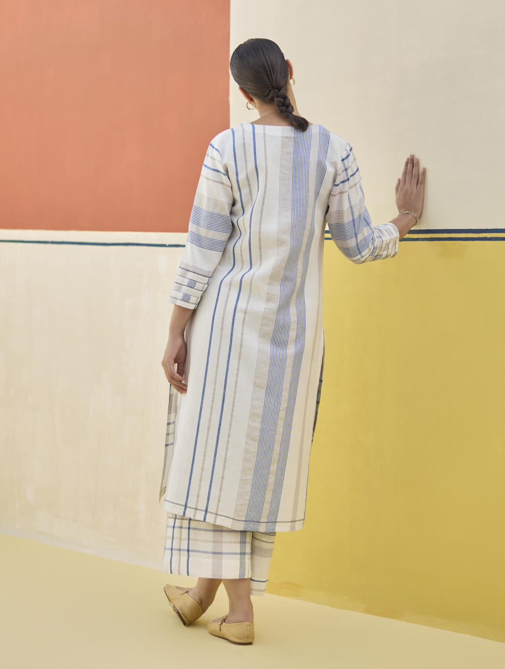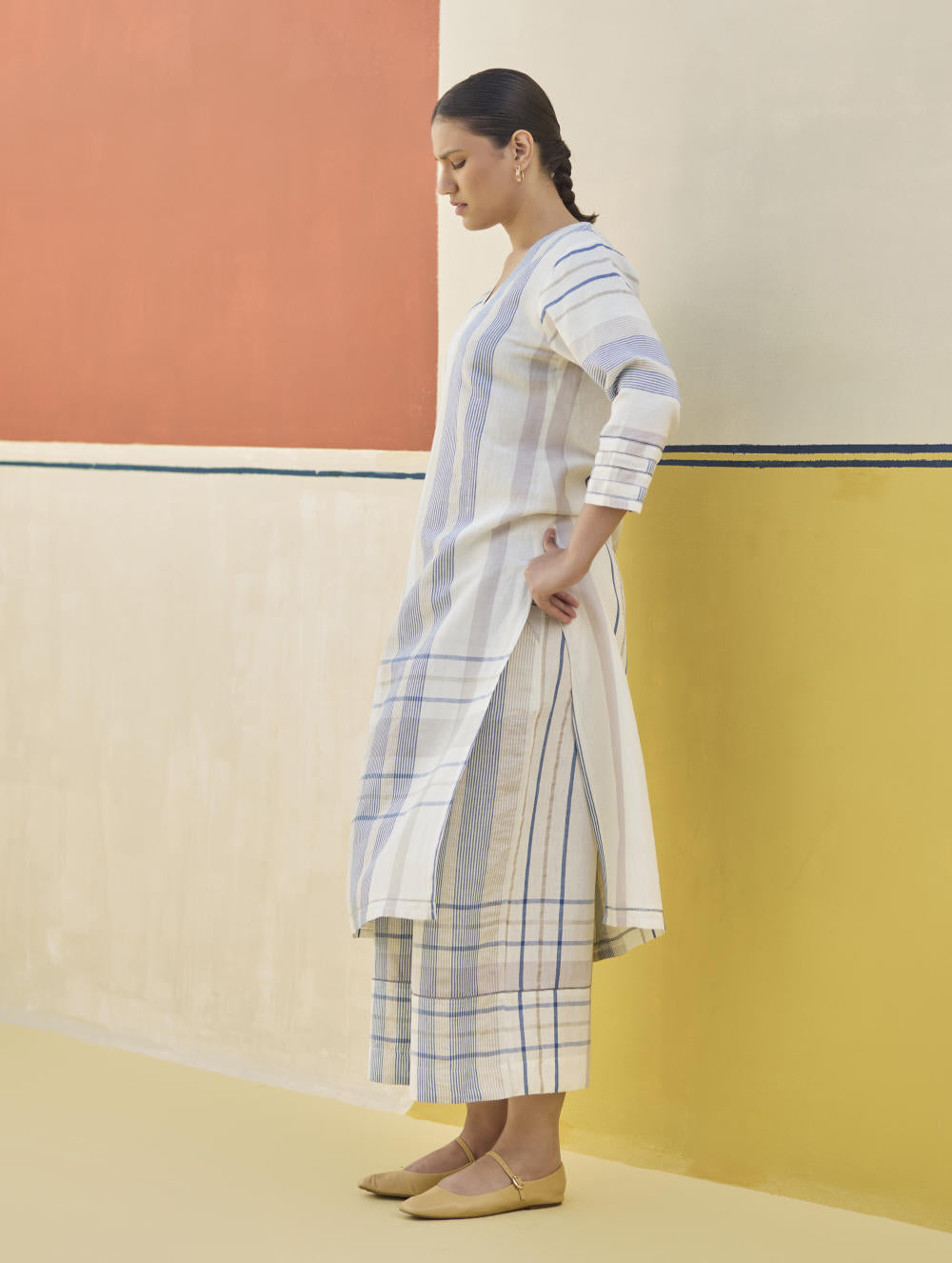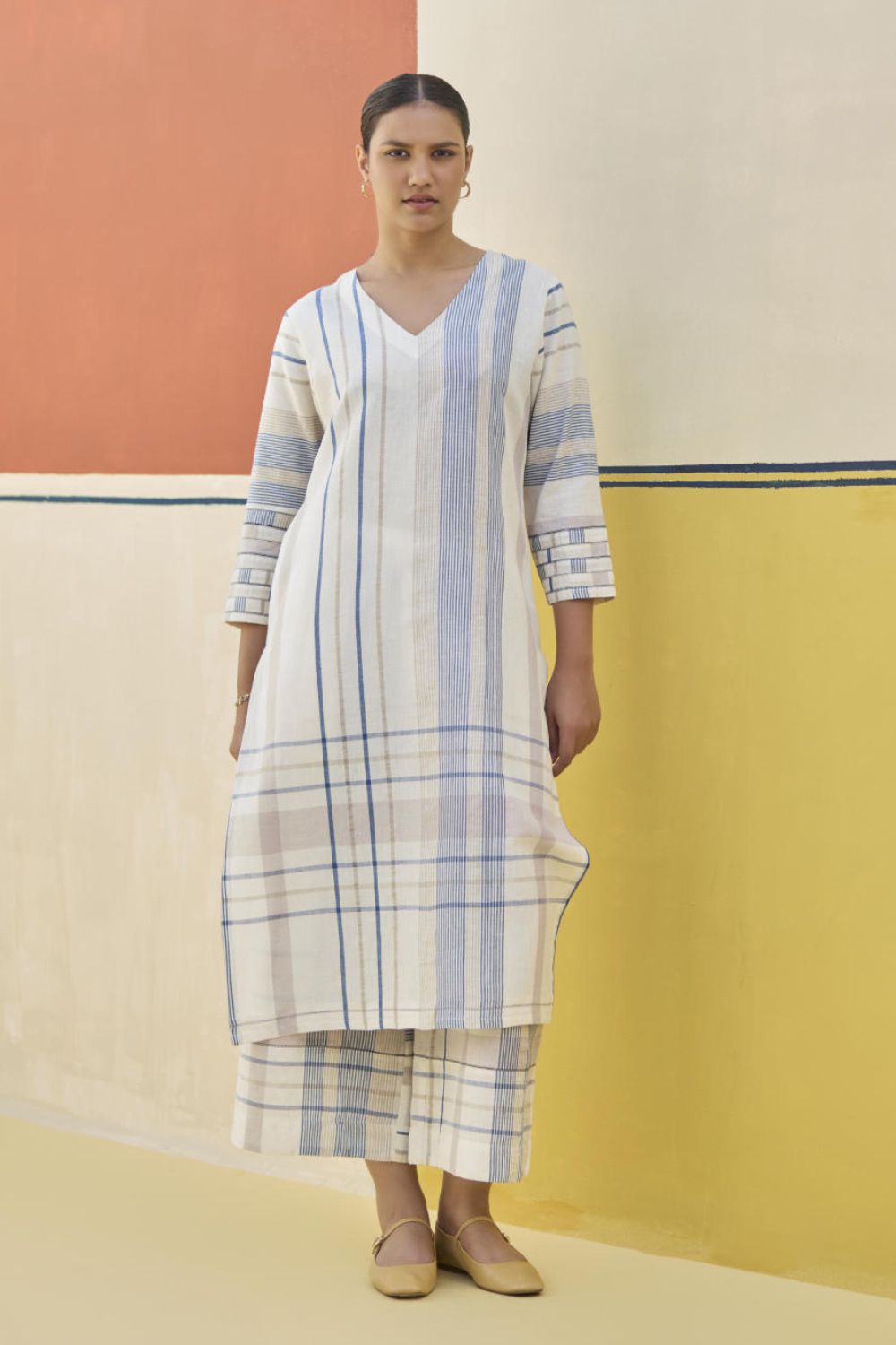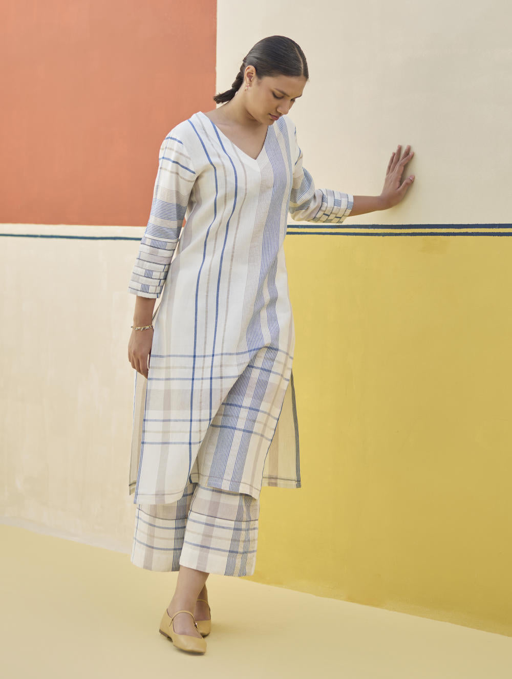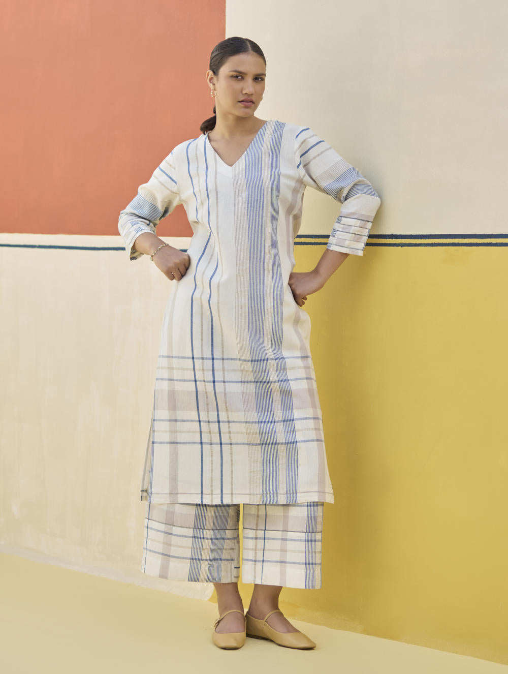 A classic v-neck kurta in our soft handloom linen cotton blend woven in an abstract check and stripe pattern, finished with multiple hand-made jaali stitch lines on the sleeves and hem in pop colored threads.