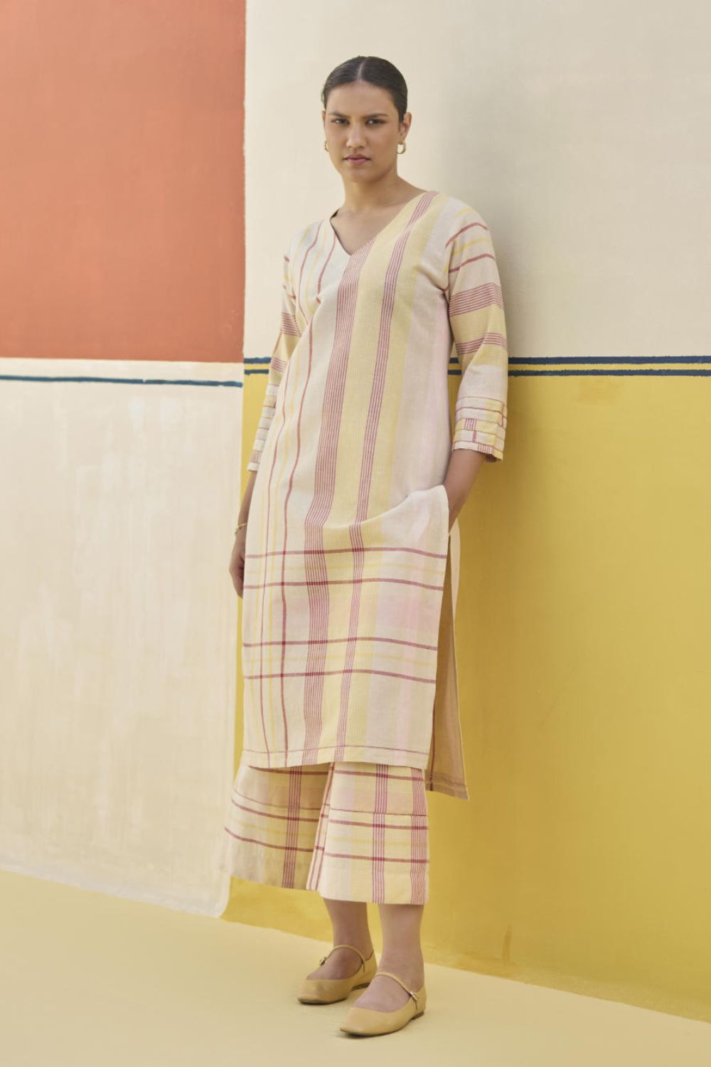 A classic v-neck kurta in our soft handloom linen cotton blend woven in an abstract check and stripe pattern, finished with multiple hand-made jaali stitch lines on the sleeves and hem in pop colored threads.