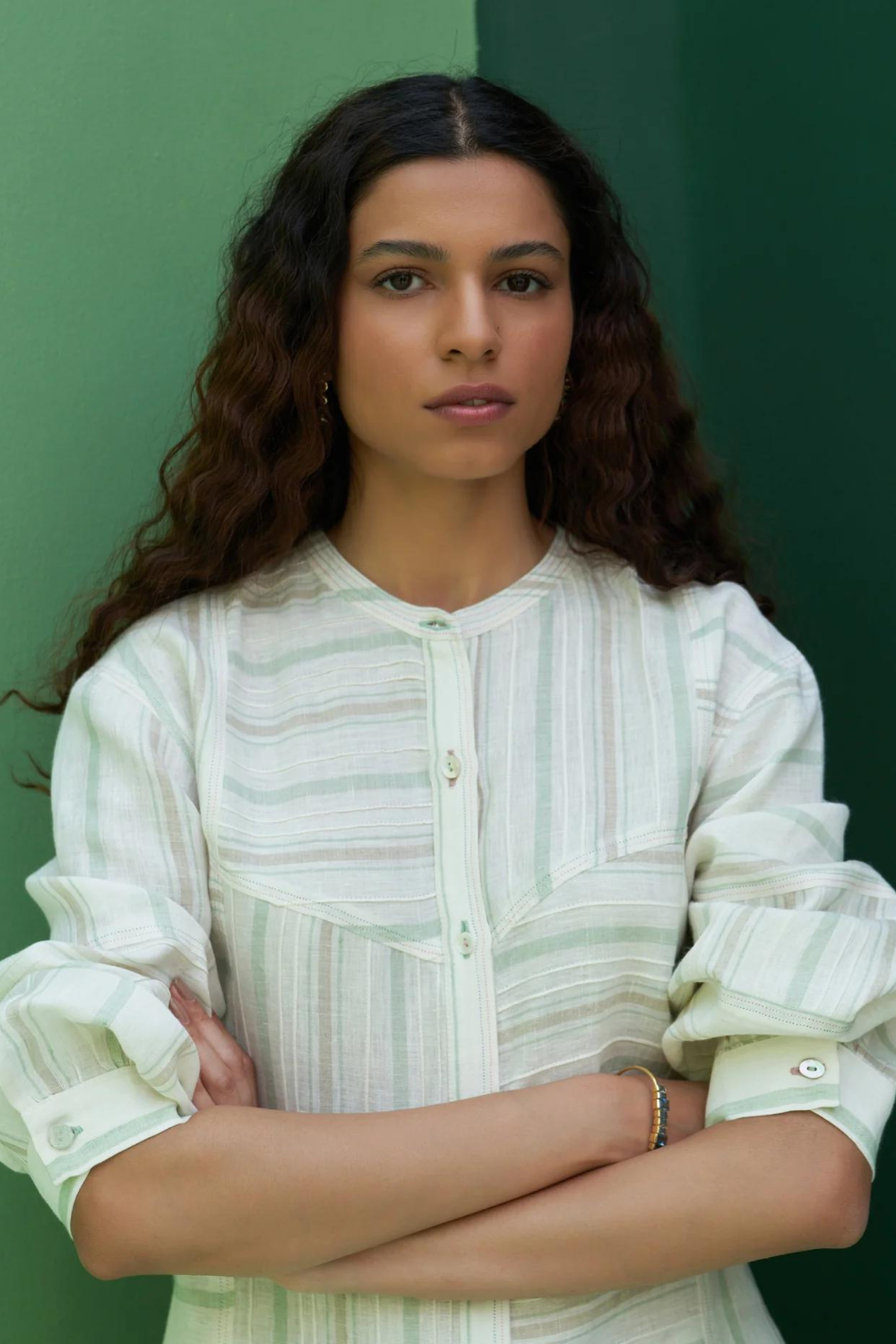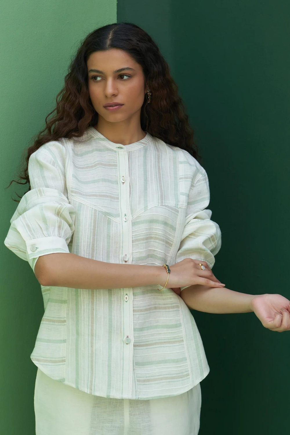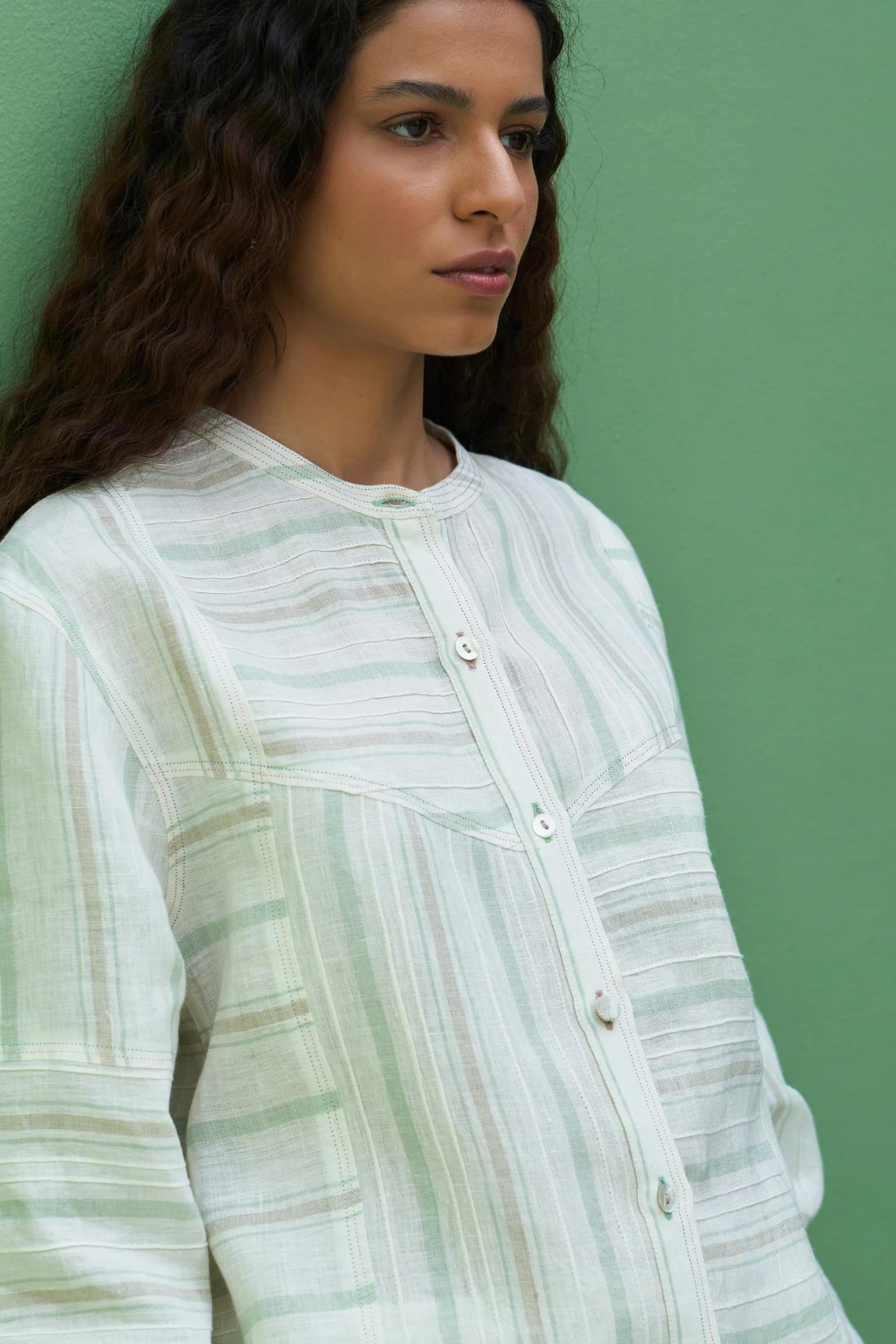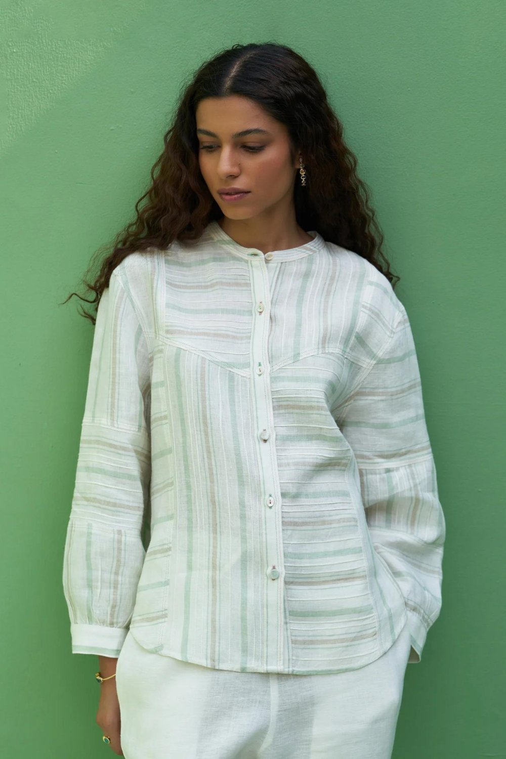 A patchwork mandarin collared shirt in our handloom striped ivory mint linen, detailed with finely placed pintucks, 3/4th sleeves with a slight puff, finished with differently styled buttons and a two coloured topstitch detail.