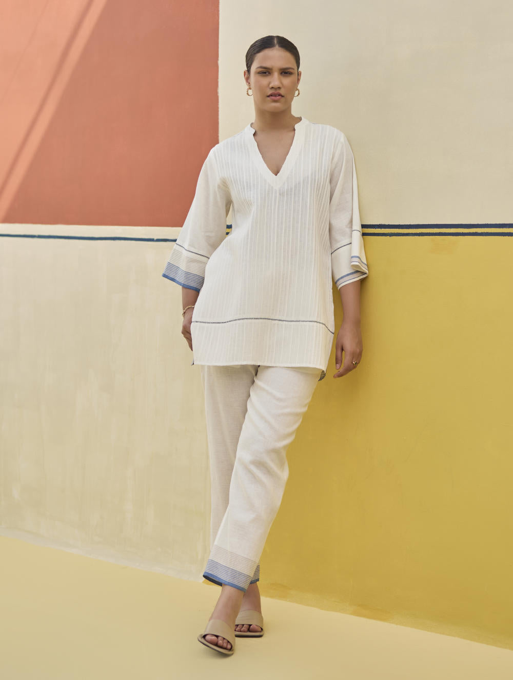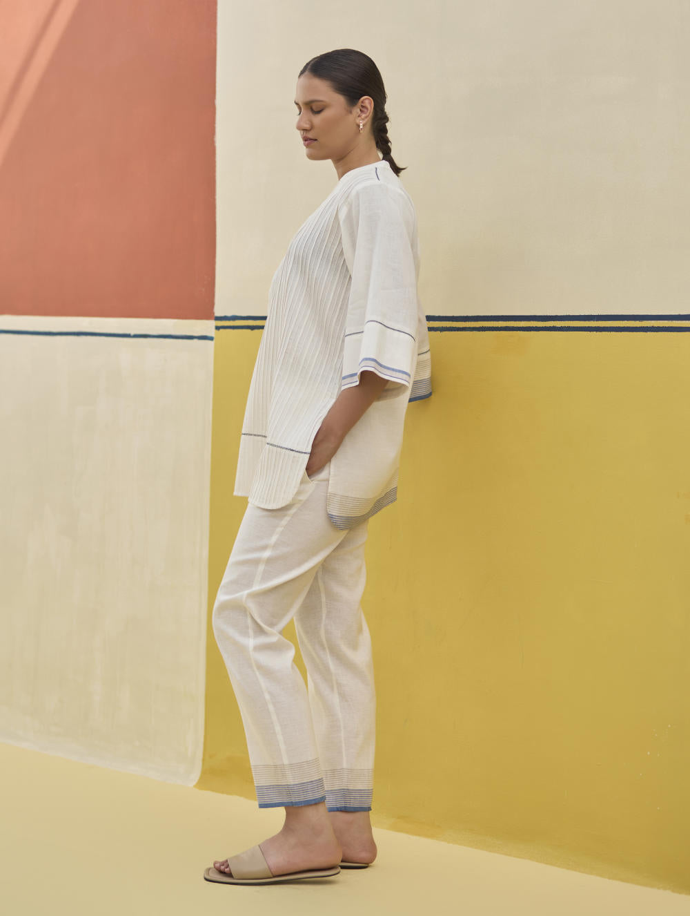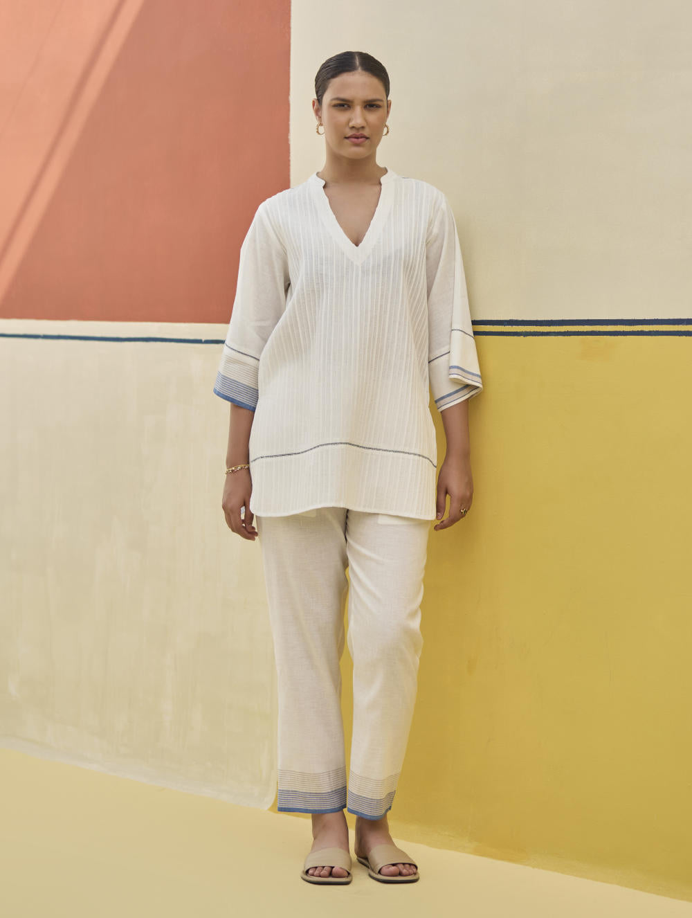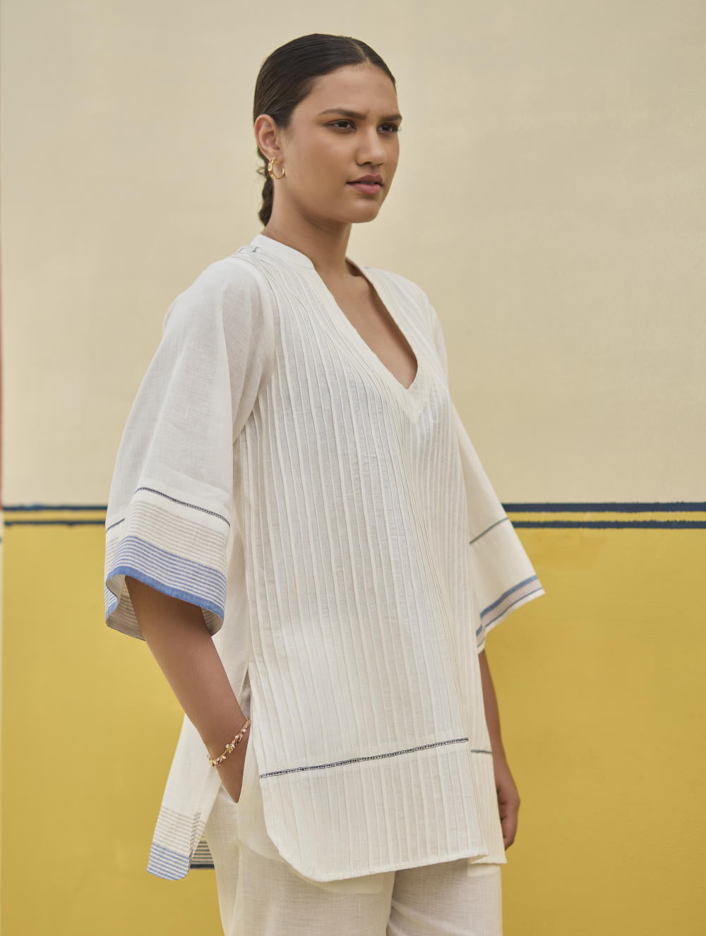 A v-neck tunic top with fine hand-stitched pintucks of varying width handcrafted in our soft handloom linen cotton with self-woven stripe borders; the top is intricately finished with hand stitched jaali detailing.
