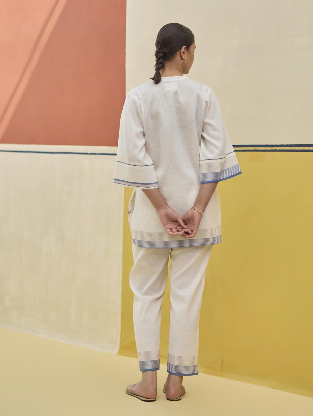 Today, Manan offers womenswear, menswear, dupattas, and jewellery — all shaped by the ethos of slow, contemplative design. Their palette is grounded in natural hues; their silhouettes are soft, balanced, and seasonless. Kurta sets and separates capture a modern Indian aesthetic that travels effortlessly anywhere in the world, while co-ord sets offer longevity and versatility in equal measure. Shirts, dresses, trousers, jackets, and dupattas form a modular wardrobe that encourages personal expression.