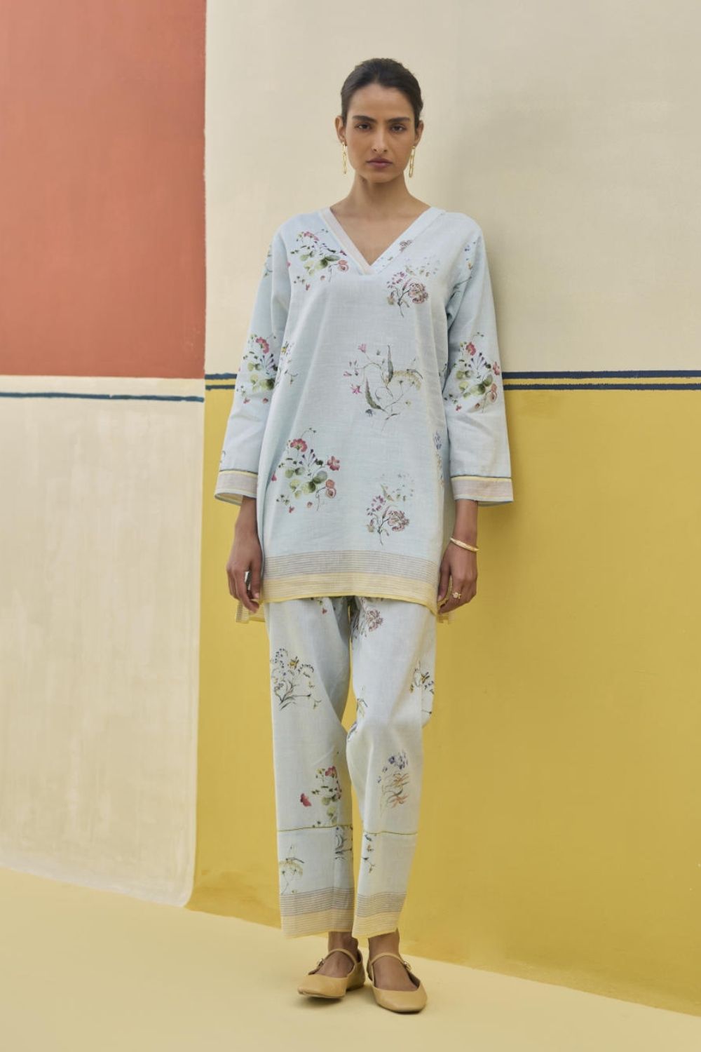 Kurta- A v-neck short kurta in our handloom soft linen cotton with a handwoven border placed on the neckline, sleeve and hemline. The kurta is printed in a soft hand-illustrated watercolour floral print with five unique hand-sketched motifs. Pant- A timeless tapered Watercolour floral printed pant handcrafted in our handloom linen cotton with a self-woven stripe border. The pant is detailed with an intricate jaali (mesh) stitch in a pop coloured thread. The pant has a drawstring, pockets and an elasticated back-waistband for a comfortable fit. Dupatta- A soft hand-woven dupatta with a multi-coloured stripe border in contrast colours on beautiful flowing sheer linen.