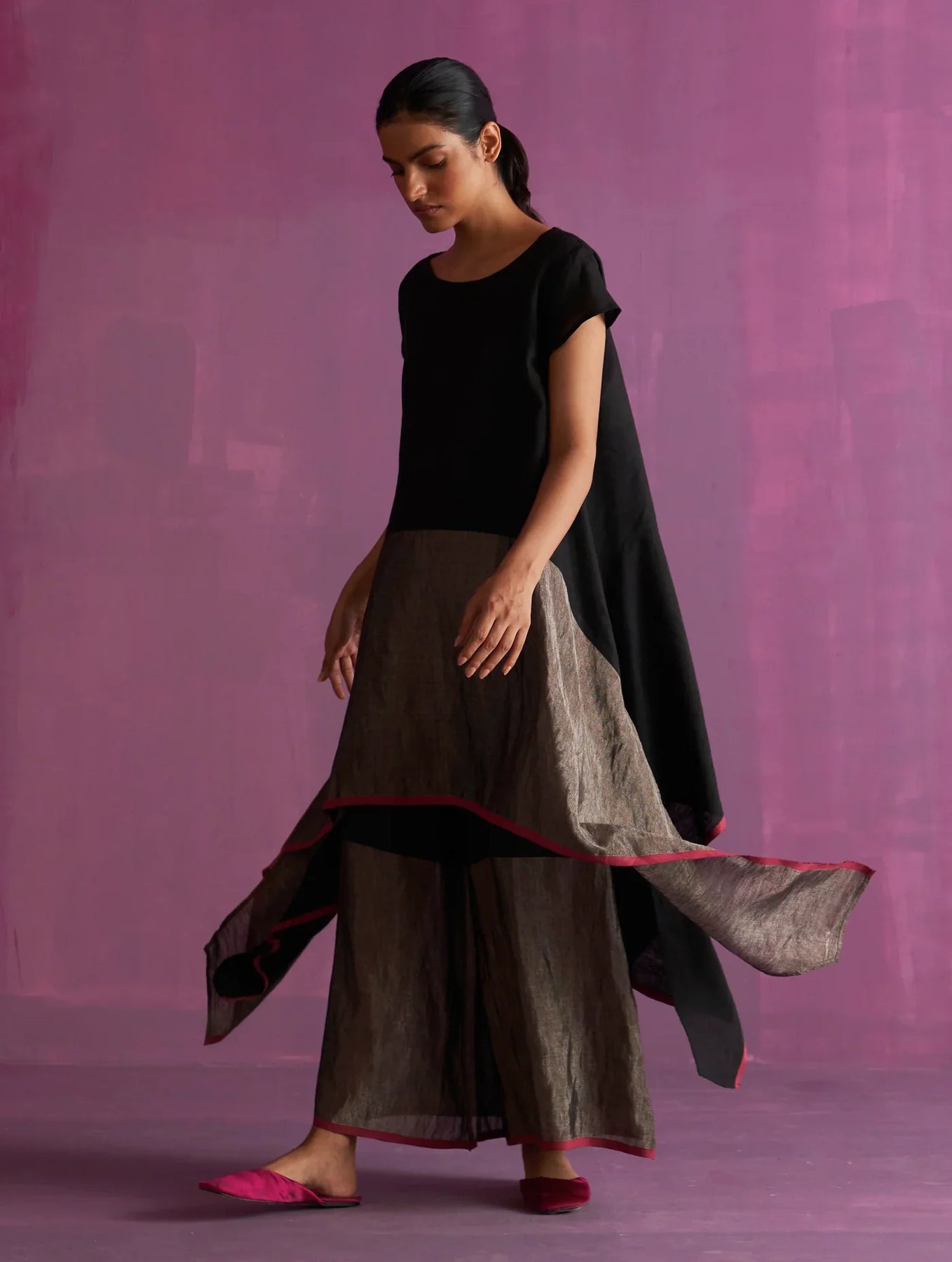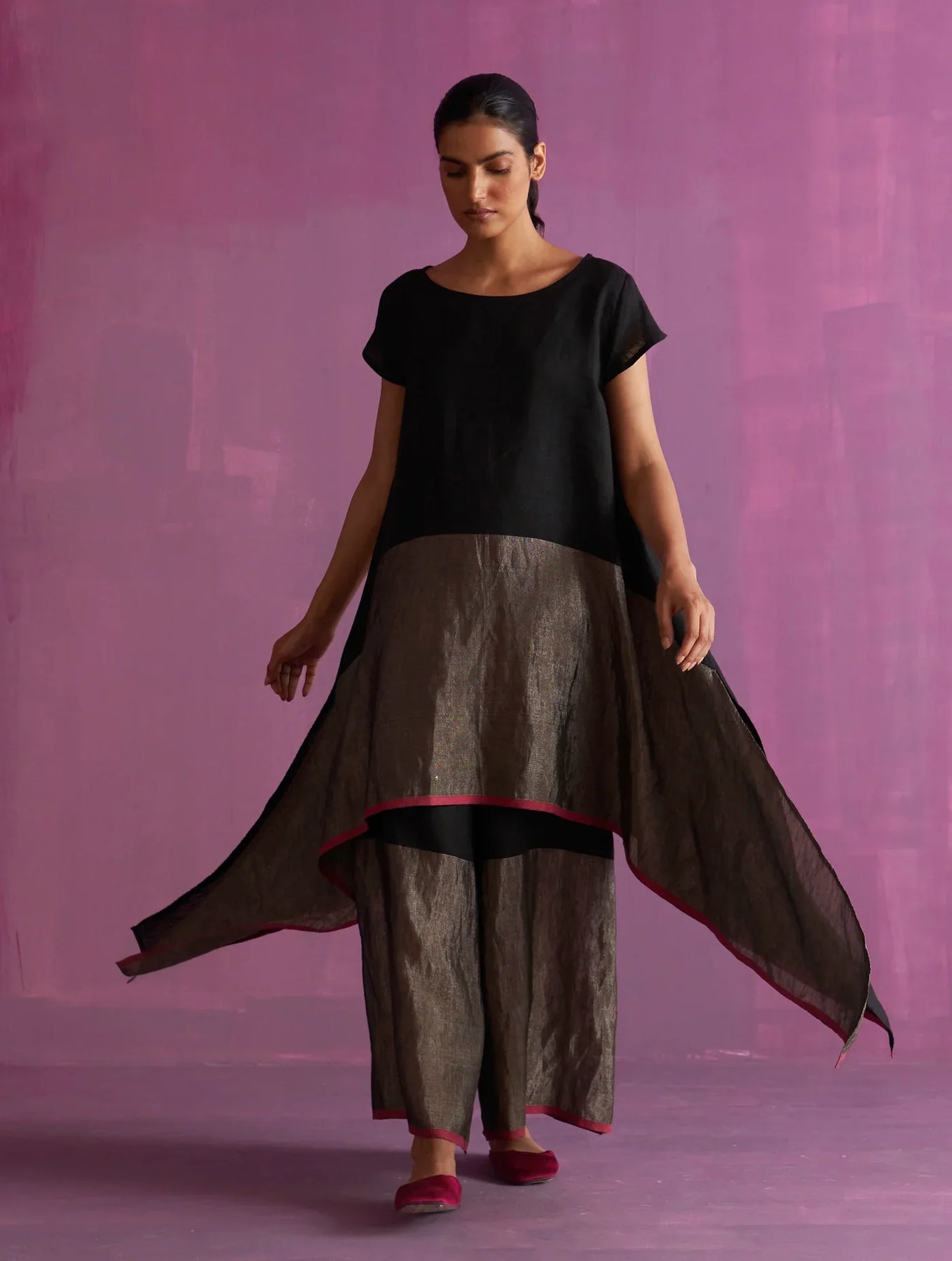 A classic boat-neck cap sleeved asymmetrical flowing top handcrafted in our soft signature handwoven metallic linen with pop coloured selvedge.