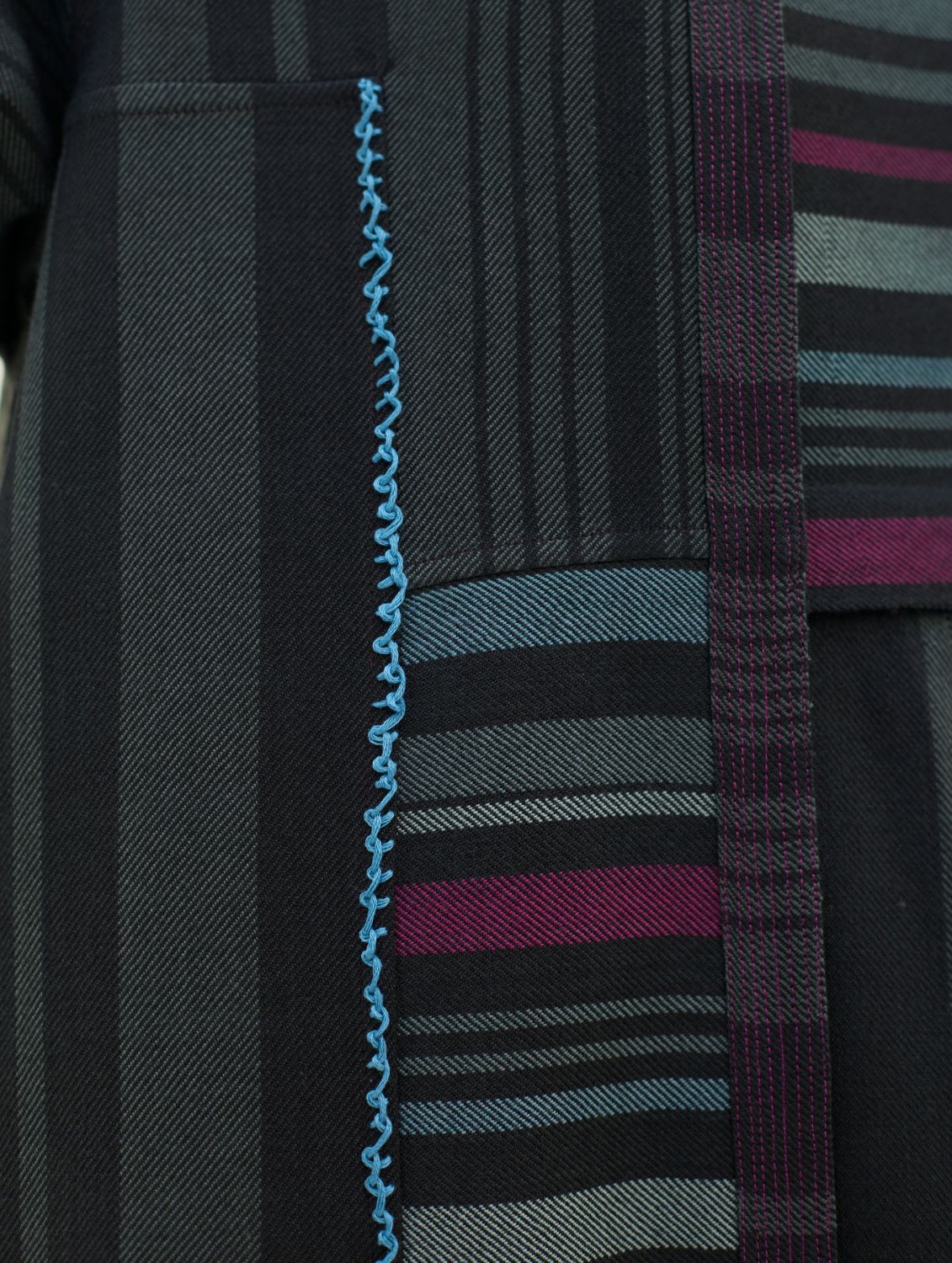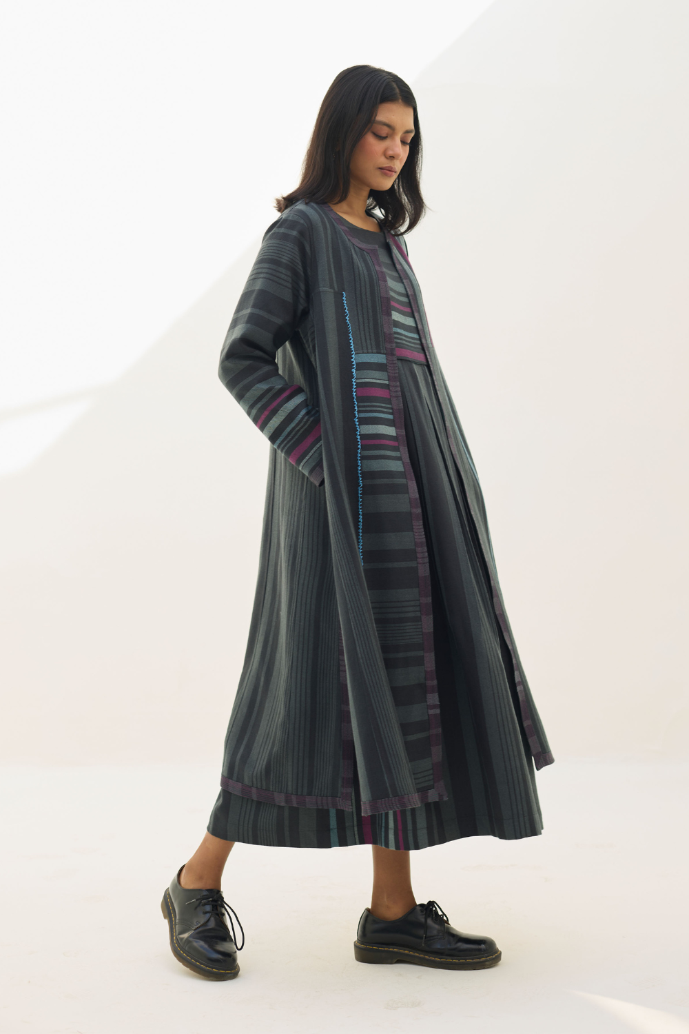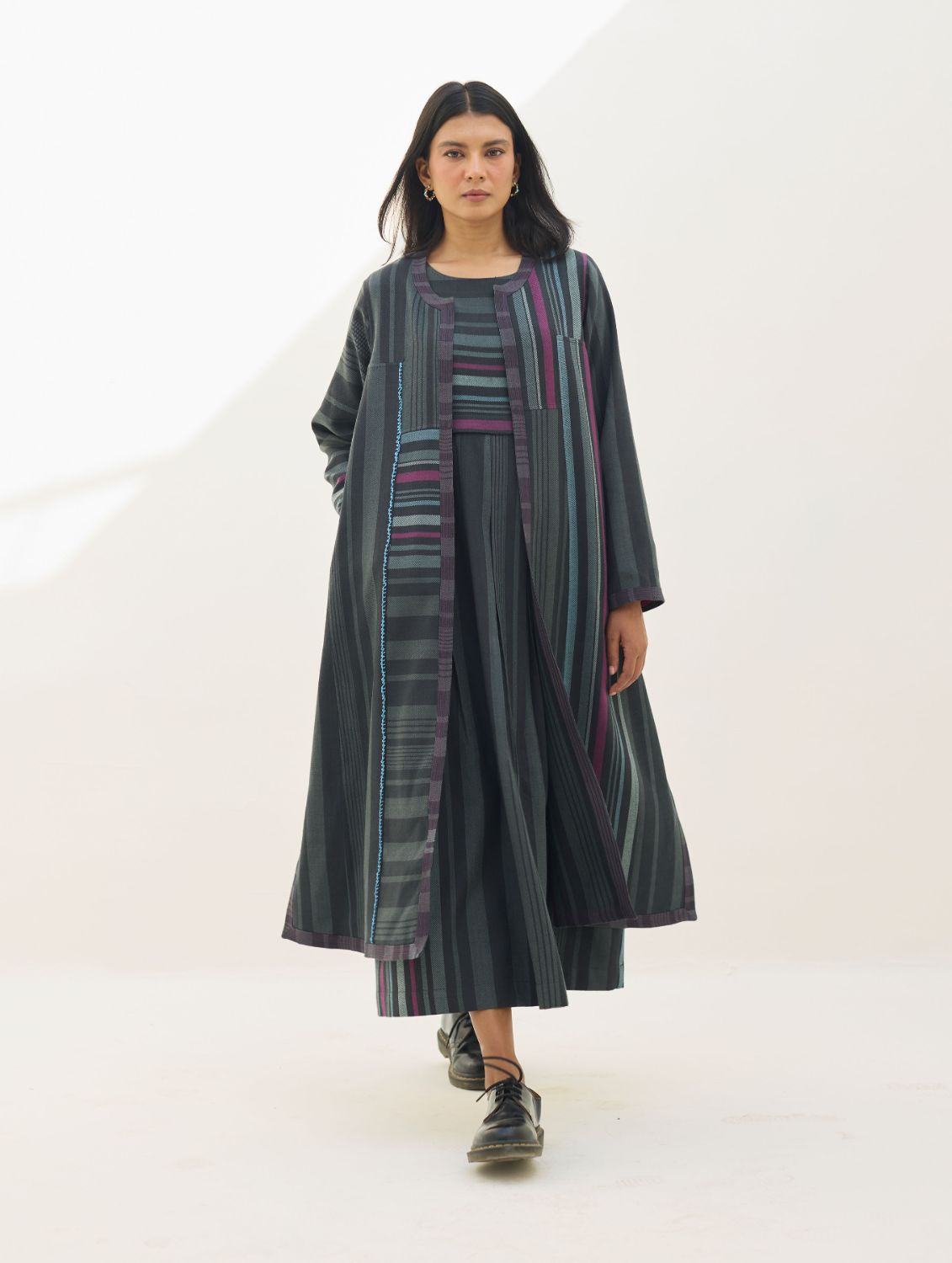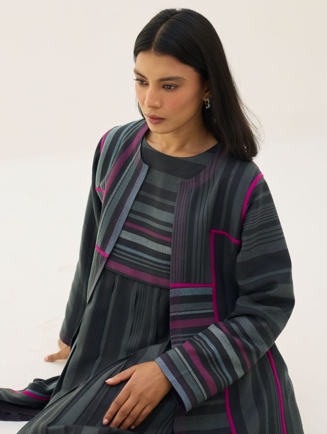 Overlay- This Thena reversible overlay is meticulously handcrafted in our yarn-dyed soft merino wool woven in a two-toned check with multi-coloured striped border. The overlay is designed by thoughtfully placing merino wool panels that create a striking visual rhythm along the bodice. Fully reversible, the Thena features contrast piping and clean pop-colour stitchlines along the placket, hemline, and sleeve hems—highlighting deliberate detailing on both sides. Hand-knotted decorative stitches add a textural and colourful accent to the design. Reversible pockets and natural statement buttons enhance functionality and finish, making this overlay a versatile layer that can be paired with multiple outfits for a fresh, contemporary look that is warm and timeless