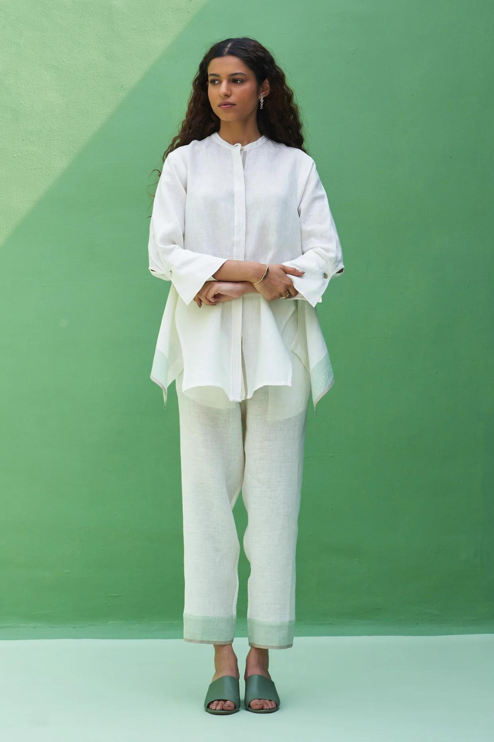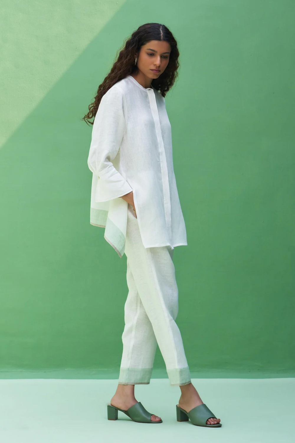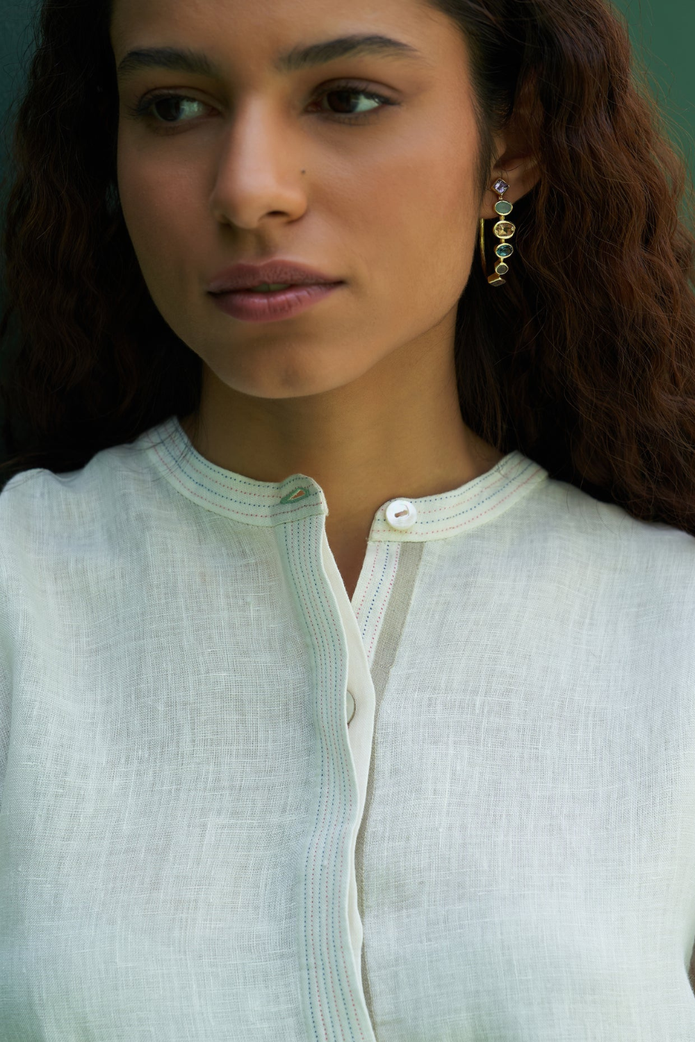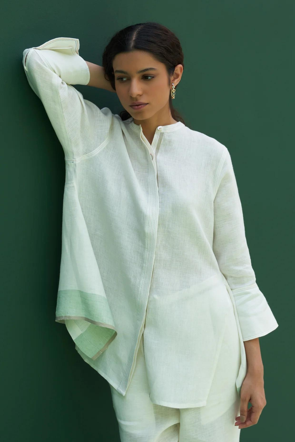 A statement top in our handloom soft linen with a selfwoven mint border with an flap slit at the back, concealed placket with a variety of buttons and 3/4th sleeves.