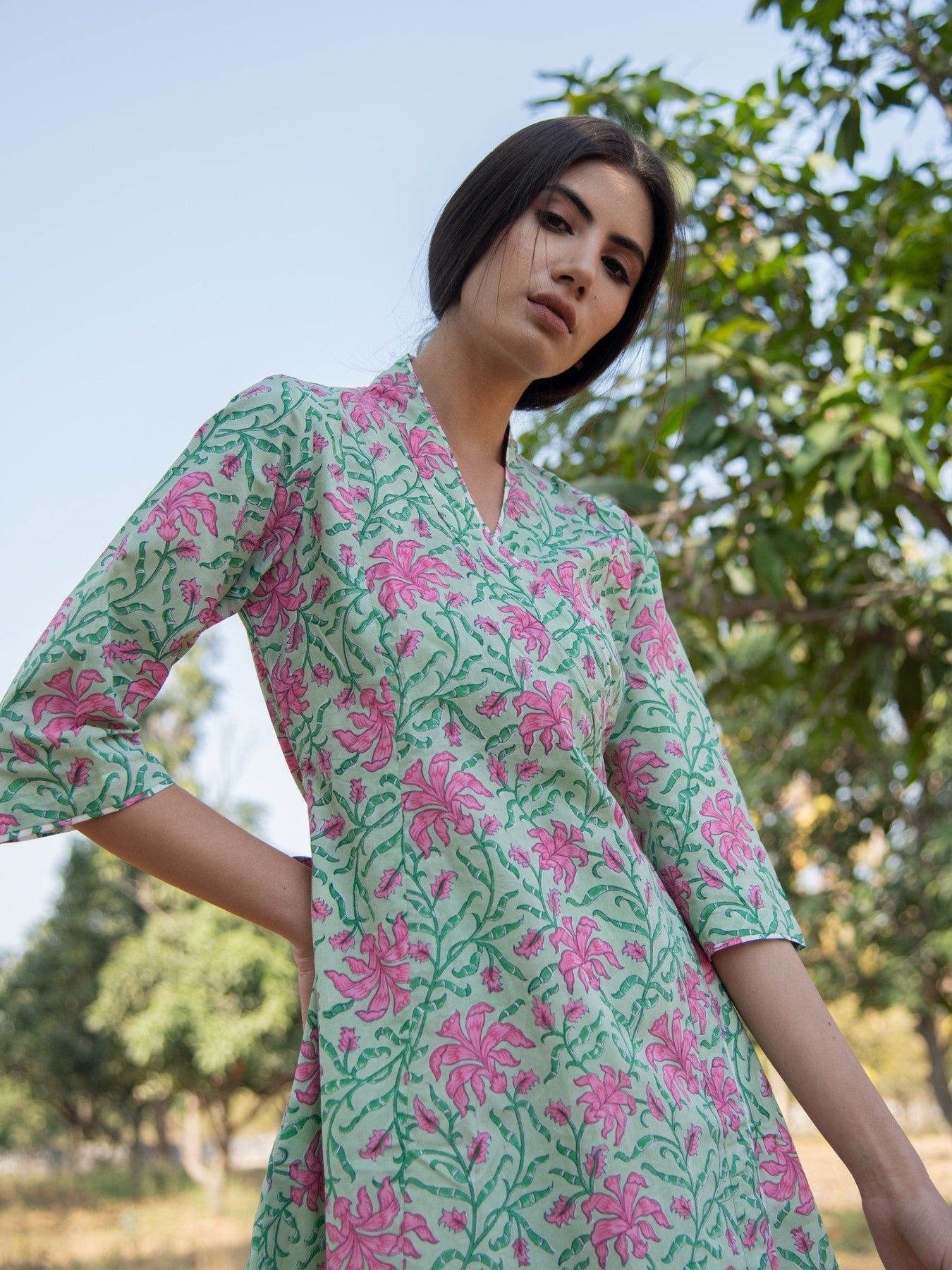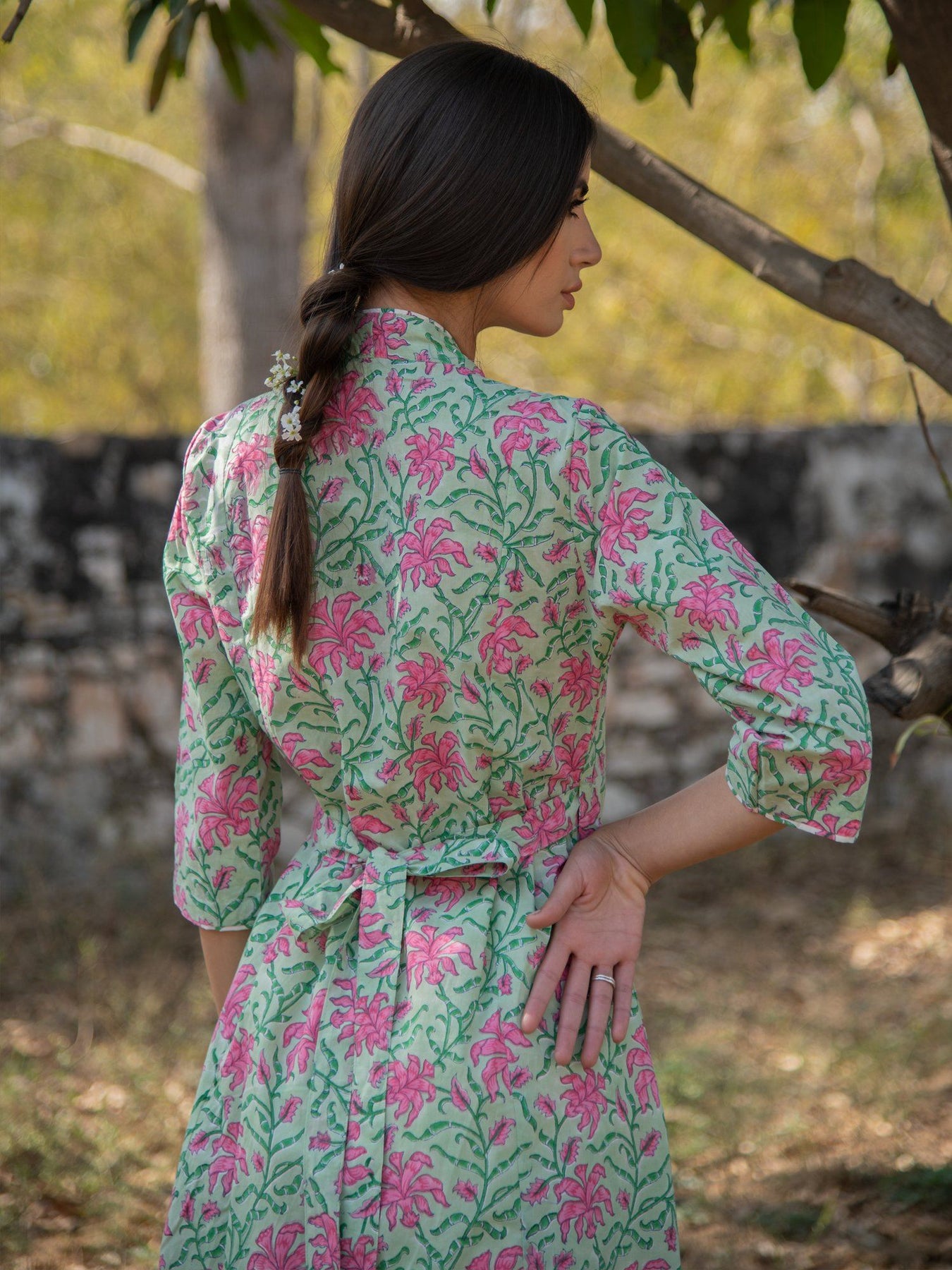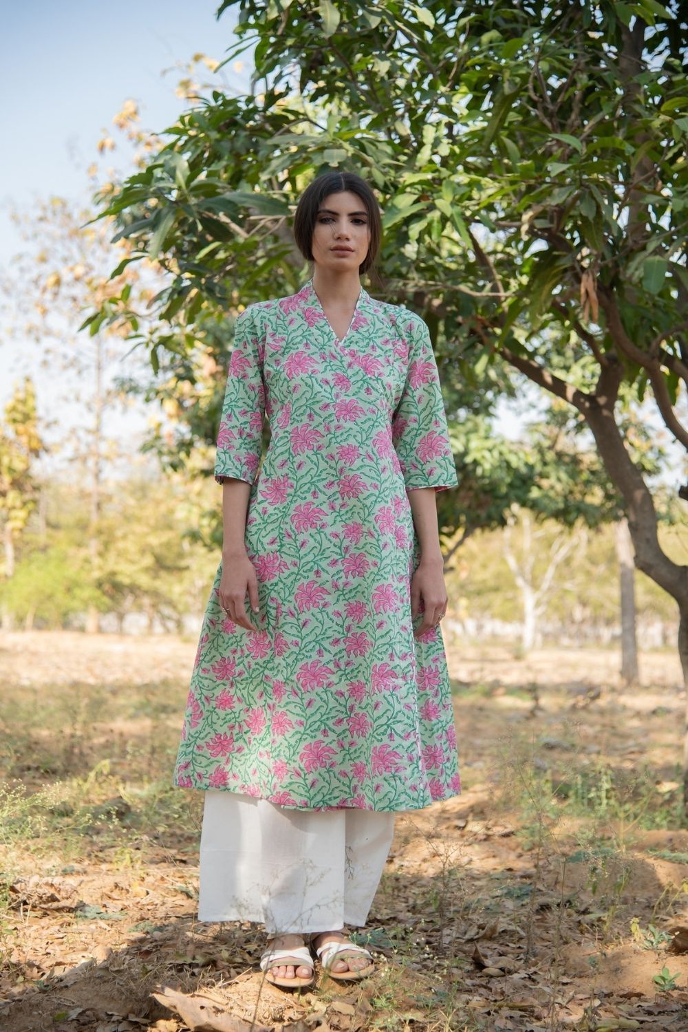 All things chic, comfortable and classy. This is how we define our wrap sets. Cotton block printed wrap kurta sets with waist defining tie up detail and flared hem. Comes with flared white pants