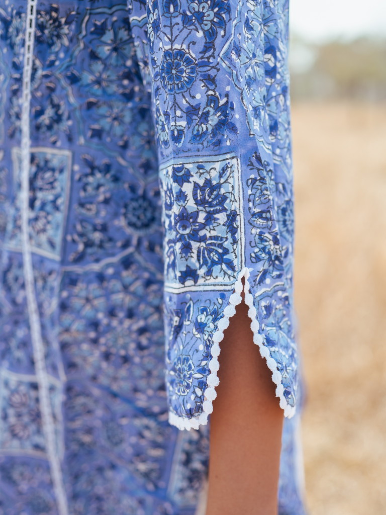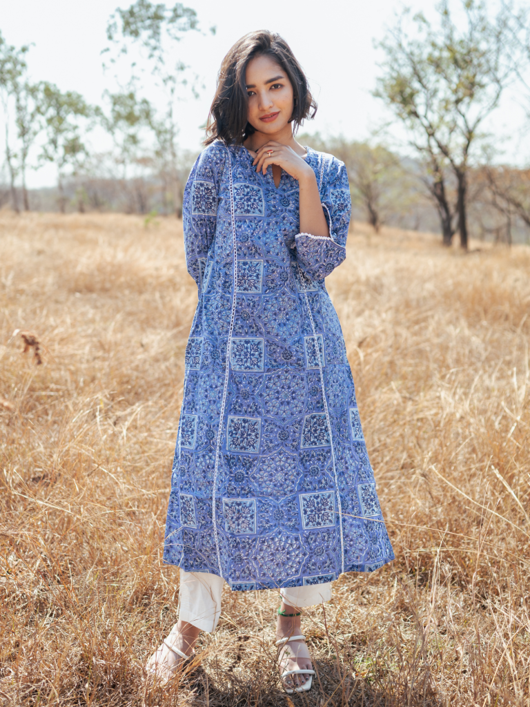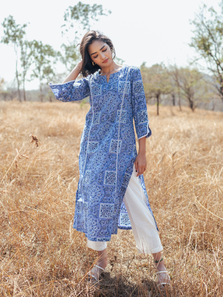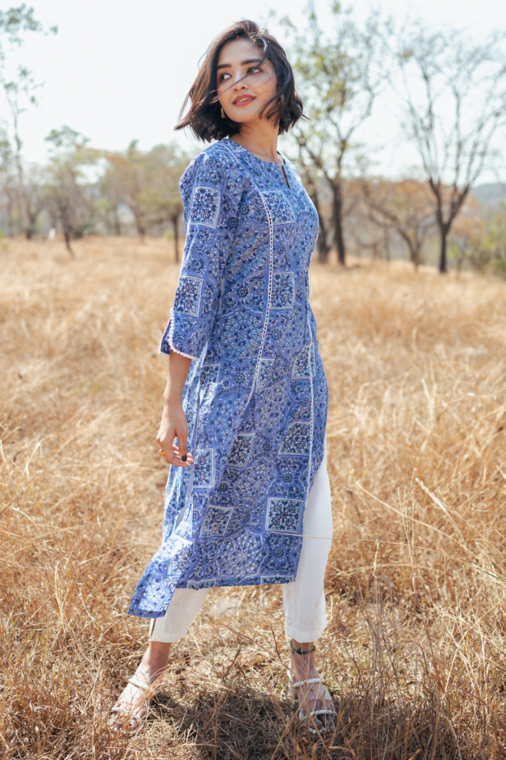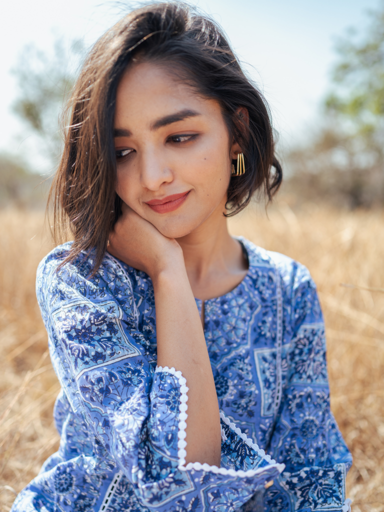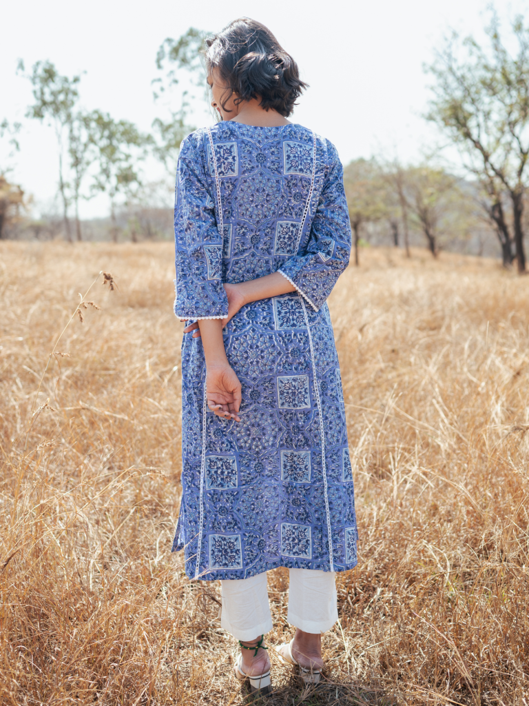 Wanderlust : A collection inspired by the free-spirited wanderlust in us and the adventures that we undertake. A collection of easy, ready-to-wear pieces hand block printed in fresh prints and colour palettes on summer-friendly cotton and mul. Inspired by the cool tones of Jodhpur. The blue-hued kurta set is a print lover's dream come true. This is a cotton block-printed kurta set with lace detailing.