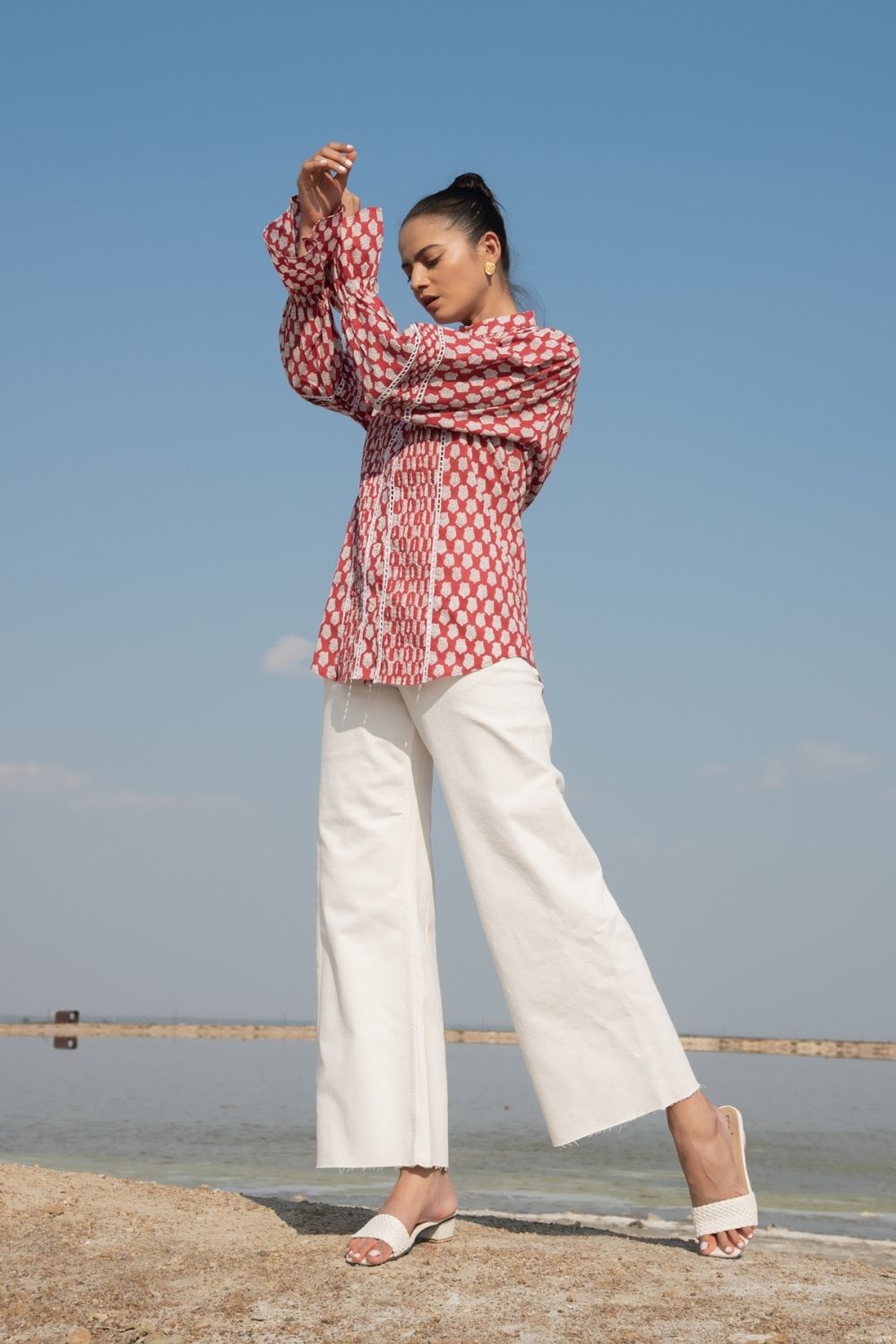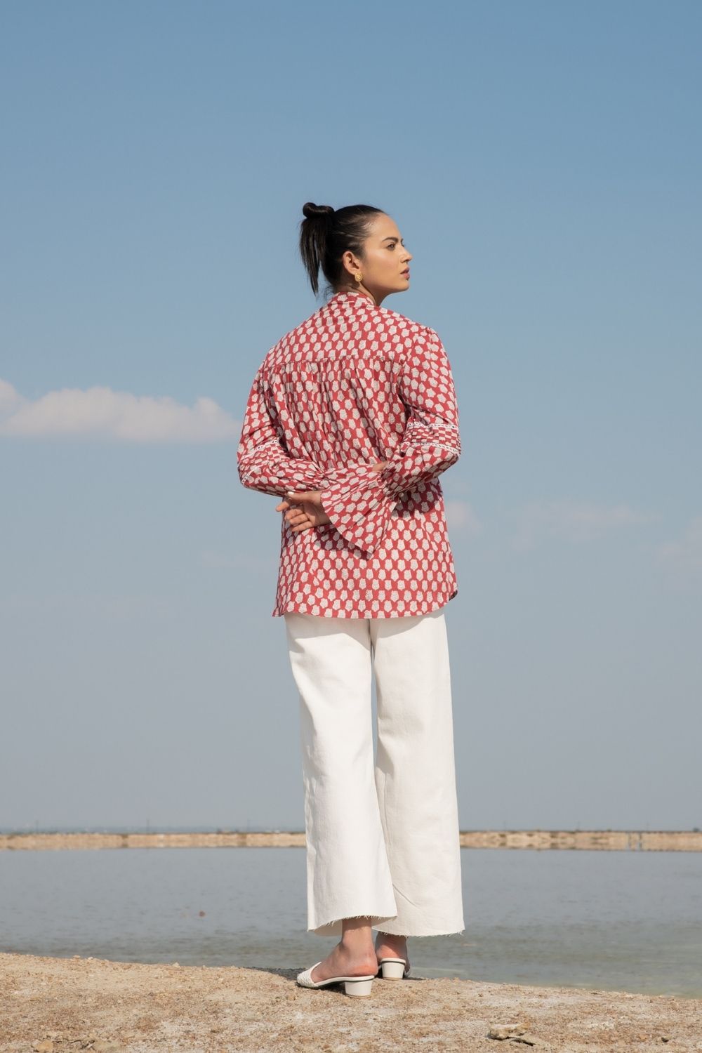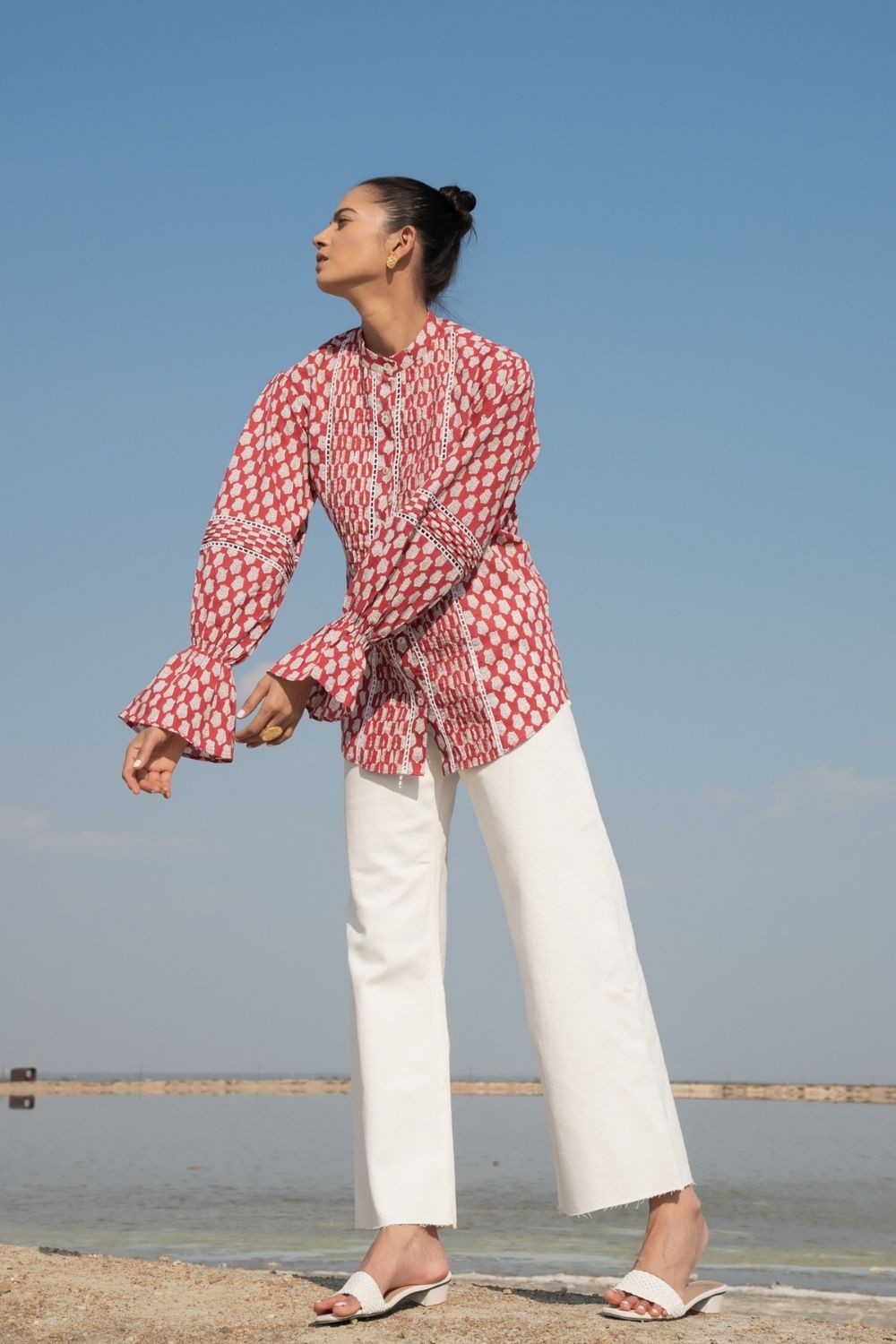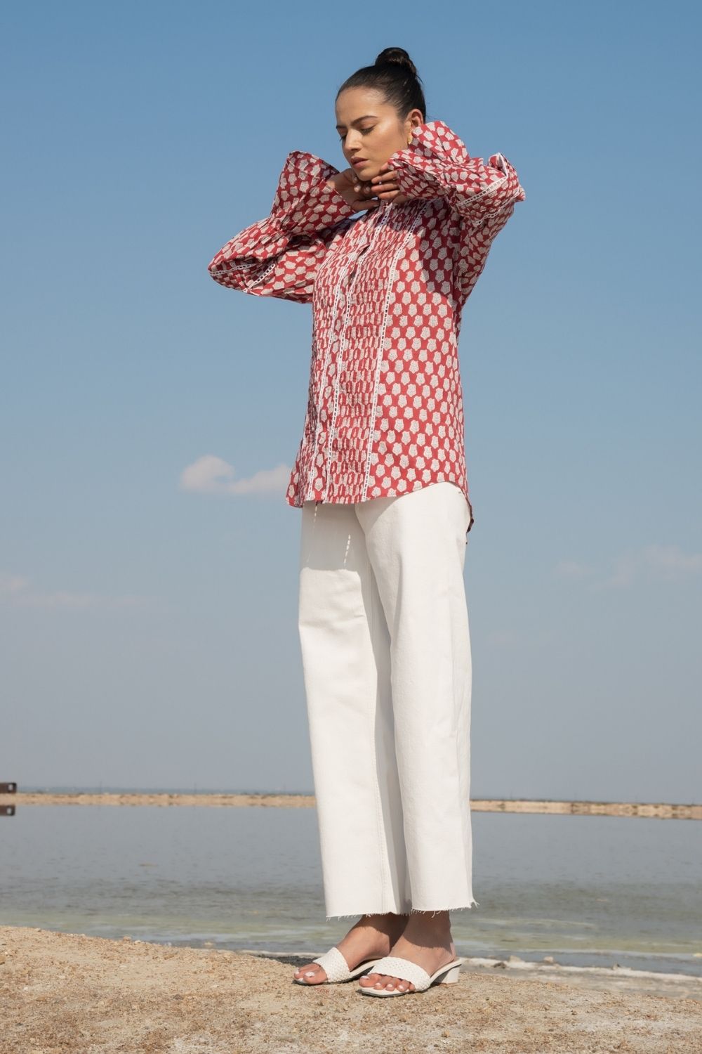A classic full sleeves shirt with handblock printed lotus flowers in rust on the softest cotton base. Impeccable sleeve detailing with a simplistic collar to tie the look together.